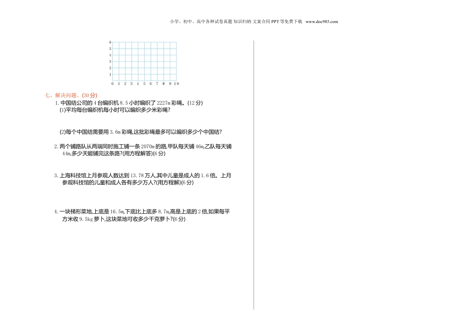 小学、初中、高中各种试卷真题知识归纳文案合同PPT等免费下载www.doc985.com重点小学5年级期末检测卷班级:姓名:满分:100分考试时间:90分钟题序第一题第二题第三题第四题第五题第六题第七题总分得分一、填空题。(12分)1.4.18×0.7的积有()位小数。2.4.95保留一位小数约是()。3.在计算0.73÷0.2时,应先把被除数与除数的小数点都向()移动()位。4.当a=3,b=1.5时,5.2a-3b=()。5.用另一种方法表示循环小数0.7272…,是()。6.小冬家养了a只黑兔,养的白兔比黑兔只数的4倍还多2只,养了()只白兔。7.一个等腰三角形的底是12cm,腰是acm,高是bcm。这个三角形的周长是()cm,面积是()cm2。8.一个平行四边形的面积是33.6cm2,底是8.4cm,高是()cm。9.下面纸牌中,一次抽出一张,抽出数字()的可能性最大,抽出数字()的可能性最小。533557757二、判断题。(正确的画“√”,错误的画“✕”)(4分)1.等式就是方程。()2.4.8÷0.07与480÷7的商相等。()3.x=1.5是2x+6=9的解。()4.a+1一定等于a。()三、选择题。(把正确答案的序号填在括号里)(5分)1.一个三角形的底是5m,高是1.6m。它的面积是()m2。A.2B.4C.1D.82.下列各式中,是方程的是()。A.4.3÷2=7×1.5B.3x+2C.3x+5<5D.4a-2.5b=1.83.根据26×73=1898,下列算式中正确的是()。A.2.6×7.3=1.898B.2.6×7.3=18.98C.2.6×7.3=189.8D.26×7.3=18.984.下面算式中,得数最大的是()。A.8.6÷1.5B.8.6×0.2C.8.6×0D.8.6×15.下面算式中,乘号可以省略的是()。A.4.5×1.2B.3.7×aC.7.5×1D.5.6×2+x四、计算题。(34分)1.直接写出得数。(8分)2.6×0.3=4.5÷0.9=8.5×10=5.2÷0.2=1.2×6=7.9÷0.1=7.6×4=4.5÷3=2.列竖式计算。(带*的保留两位小数)(8分)5.02×4.8=0.98÷0.28=*8÷2.7≈*2.48×0.23≈3.用简便方法计算。(12分)102×4.57.8×6.9+2.2×6.90.65+10.9×6.58×(20-1.25)4.解方程。(6分)5x+5.5=76×4-0.5x=12.8五、求下面图形的面积。(单位:cm)(8分)1.2.六、操作题。(7分)先在图中标出A(6,4)、B(3,1)、C(9,1),再顺次连接A、B、C、A,看看围成的是什么图形?(4分)小学、初中、高中各种试卷真题知识归纳文案合同PPT等免费下载www.doc985.com七、解决问题。(30分)1.中国结公司的4台编织机8.5小时编织了2227m彩绳。(12分)(1)平均每台编织机每小时可以编织多少米彩绳?(2)每个中国结需要用3.6m彩绳,这批彩绳最多可以编织多少个中国结?2.两个铺路队从两端同时施工铺一条2070m的路,甲队每天铺46m,乙队每天铺44m,多少天能铺完这条路?(用方程解答)(6分)3.上海科技馆上月参观人数达到13.78万人,其中儿童是成人的1.6倍。上月参观科技馆的儿童和成人各有多少万人?(用方程解)(6分)4.一块梯形菜地,上底是16.5m,下底比上底多8.7m,高是上底的2倍,如果每平方米收9.5kg萝卜,这块菜地可收多少千克萝卜?(6分)