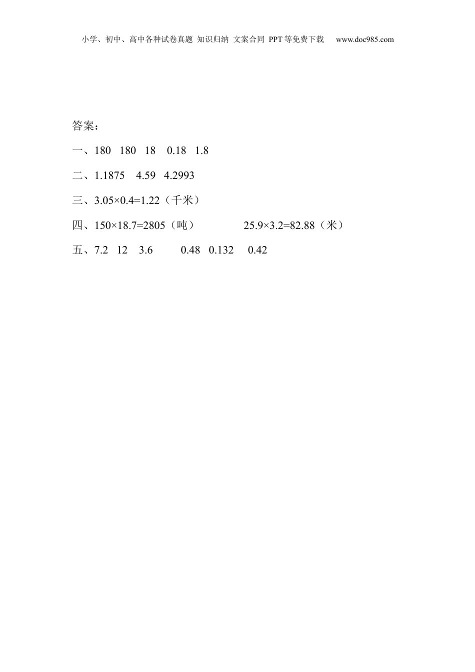 小学、初中、高中各种试卷真题知识归纳文案合同PPT等免费下载www.doc985.com1.2小数乘小数一、根据第一栏的积直接写出下面各栏的积.。因数757.575750.757.5因数24242.40.240.240.24积1800二、先判断积有几位小数,再计算。0.95×1.25=0.85×5.4=5.1×0.843=三、亮亮步行从家到学校,每小时走3.05千米,0.4小时到达,亮亮家离学校有多远?四、世界上最大的一棵巨衫,质量是蓝鲸的18.7倍,高是蓝鲸体长小学、初中、高中各种试卷真题知识归纳文案合同PPT等免费下载www.doc985.com的3.2倍,这棵巨衫重多少吨?高多少米?五、比一比,填一填。2.4×=531.50.110.40.351.2××=小学、初中、高中各种试卷真题知识归纳文案合同PPT等免费下载www.doc985.com答案:一、180180180.181.8二、1.18754.594.2993三、3.05×0.4=1.22(千米)四、150×18.7=2805(吨)25.9×3.2=82.88(米)五、7.2123.60.480.1320.42
