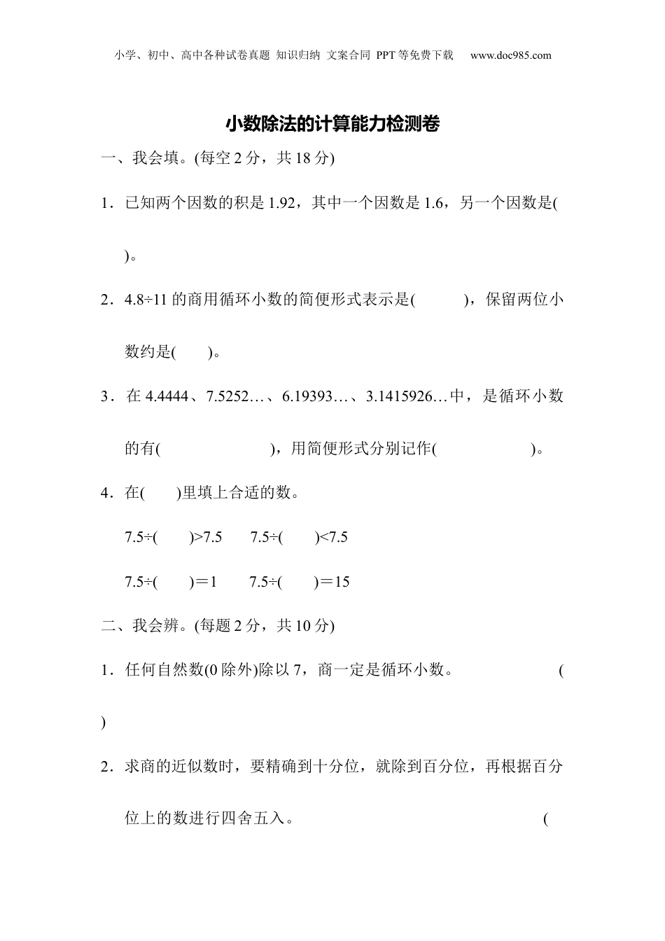 小学、初中、高中各种试卷真题知识归纳文案合同PPT等免费下载www.doc985.com小数除法的计算能力检测卷一、我会填。(每空2分,共18分)1.已知两个因数的积是1.92,其中一个因数是1.6,另一个因数是()。2.4.8÷11的商用循环小数的简便形式表示是(),保留两位小数约是()。3.在4.4444、7.5252…、6.19393…、3.1415926…中,是循环小数的有(),用简便形式分别记作()。4.在()里填上合适的数。7.5÷()>7.57.5÷()<7.57.5÷()=17.5÷()=15二、我会辨。(每题2分,共10分)1.任何自然数(0除外)除以7,商一定是循环小数。()2.求商的近似数时,要精确到十分位,就除到百分位,再根据百分位上的数进行四舍五入。(小学、初中、高中各种试卷真题知识归纳文案合同PPT等免费下载www.doc985.com)3.无限小数一定是循环小数。()4.7.9953保留两位小数约等于7.00。()5.4.5÷0.5=4.5×2;4.5÷0.25=4.5×4;4.5÷0.125=4.5×8。()三、我会选。(每题2分,共10分)1.9.4÷1.8的商是5时,余下的数是()。A.4B.0.4C.0.04D.402.下面的算式中,只有一道题的商是1.8,不计算,你选()。A.46.8÷2.6B.4.68÷2.6C.0.468÷2.6D.4.68÷263.与0.15÷1.2的商相等的是()。A.15÷12B.1.5÷12C.150÷12D.15÷0.124.下面各式中,商小于1的是()。A.0.54÷0.032B.76.3÷24小学、初中、高中各种试卷真题知识归纳文案合同PPT等免费下载www.doc985.comC.8.9÷9.2D.4.5÷4.55.一个两位小数的近似数是4.0,这个数不可能是()。A.4.05B.3.97C.4.01D.3.95四、我会算。(共44分)1.口算。(每题1分,共8分)2.5÷0.05=42.6÷6=9.9÷3.3=4÷0.25=21.14÷7=0.1÷0.01=9.06÷0.3=7.2÷1.2=2.列竖式计算。(每题3分,共12分)36.8÷2326.5÷2.5(验算)9.5÷0.172.9÷6(保留一位小数)(商用循环小数的简便形式表示)3.计算下面各题,除不尽的先用循环小数的简便形式表示所得的商,小学、初中、高中各种试卷真题知识归纳文案合同PPT等免费下载www.doc985.com再保留两位小数写出商的近似数。(每题3分,共12分)4.49÷1.11.53÷7.246÷6.62.9÷94.计算下面各题,怎样简便就怎样算。(每题3分,共12分)2.1÷0.1257.6÷0.2+7.6÷0.89.6-3.6÷1.52.5×3.6-0.45五、我会应用。(每题6分,共18分)1.编一个“中国结”用1.6米红绳,30米红绳可编多少个这样的小学、初中、高中各种试卷真题知识归纳文案合同PPT等免费下载www.doc985.com“中国结”?2.蜜蜂的飞行速度约是蝴蝶飞行速度的几倍?(得数保留两位小数)3.张老师一共要买25kg苹果,请你算一算,在哪儿买便宜,需要多少元?小学、初中、高中各种试卷真题知识归纳文案合同PPT等免费下载www.doc985.com小学、初中、高中各种试卷真题知识归纳文案合同PPT等免费下载www.doc985.com答案一、1.1.22.0.4360.443.7.5252…、6.19393…7.52、6.1934.0.177.50.5(前两个空答案不唯一)二、1.×2.√3.×4.×5.√三、1.B2.B3.B4.C5.A四、1.507.13163.021030.262.=1.6=10.6(验算略)≈55.9=0.4833.4.49÷1.1=4.081≈4.081.53÷7.2=0.212546÷6.6=6.96≈6.972.9÷9=0.32≈0.324.2.1÷0.125=(2.1×8)÷(0.125×8)=16.8÷1=16.8【点拨】a÷b+a÷c不能简算成a÷(b+c)。小学、初中、高中各种试卷真题知识归纳文案合同PPT等免费下载www.doc985.com2.5×3.6-0.45=2.5×0.4×9-0.45=9-0.45=8.55五、1.30÷1.6≈18(个)答:30米红绳可编18个这样的“中国结”。【点拨】此题用“去尾”法求商。2.30分钟=0.5小时(10.5÷0.5)÷(2.16÷0.3)=21÷7.2≈2.92答:蜜蜂的飞行速度约是蝴蝶飞行速度的2.92倍。3.77.5<79答:在利民水果店买便宜,需要77.5元。