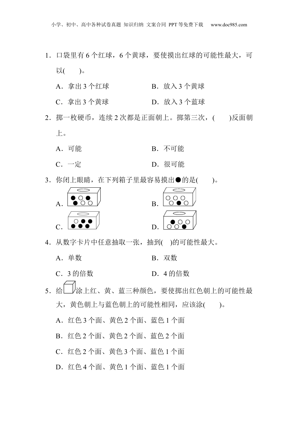 小学、初中、高中各种试卷真题知识归纳文案合同PPT等免费下载www.doc985.com第四单元达标测试卷一、填一填。(每空2分,共32分)1.盒子里放着除颜色不同外其余均相同的5个红球、8个绿球、3个黄球。从盒子里任意摸一个球,摸到()球的可能性最大,摸到()球的可能性最小。2.口袋里只有10个白色围棋棋子,任意摸出1个,一定是()色的。3.桌子上摆着7张卡片,分别写着1~7各数。如果从中任意摸出1张卡片,摸到单数和双数的可能性相比,摸到()数的可能性大些,摸到()数的可能性小些。4.用“①一定”“②可能”或“③不可能”填空。(填写相应的序号)(1)盒子中放有红、黄、蓝三种颜色大小相同的球各1个,小华、小明和小刚进行摸球游戏(摸出后不放回)。小华先摸出一个球,()是红球,也()是黄球或蓝球。若小华摸出的是黄球,则小明摸出的一个球()是黄球。若小华摸出的是黄球,小明摸出的是蓝球,则小刚摸出的最后一个球()是红球。(2)太阳()从东边升起,小狗()在天上飞。5.用“大”或“小”填空。(1)如图1,从箱中摸出一个球,摸出的可能性()一些。小学、初中、高中各种试卷真题知识归纳文案合同PPT等免费下载www.doc985.com(2)如图2,转动转盘,待转盘停止后,指针指向桃子区域的可能性最(),指向苹果区域的可能性最()。(3)如图3,转动转盘,待转盘停止后,指针指向阴影区域的可能性(),指向空白区域的可能性()。图1图2图3二、辨一辨。(对的画“√”,错的画“×”)(每题2分,共10分)1.盒子里装着同样的200个红色小球和1个黑色小球,从中任意取出一个小球,一定是红色的小球。()2.小东抛20次硬币,可能都是正面朝上。()3.一个正方体,六个面分别写着1~6。掷一次,单数朝上和双数朝上的可能性相同。()4.随意掷两枚硬币,有两种可能:两枚都正面朝上,两枚都反面朝上。()5.一个正方体的六个面分别写着1~6,小明连掷了五次,1,2,3,4,6各一次正面朝上,他掷第6次,正面朝上的一定是5。()三、选一选。(把正确答案的字母填在括号里)(每题2分,共10分)小学、初中、高中各种试卷真题知识归纳文案合同PPT等免费下载www.doc985.com1.口袋里有6个红球,6个黄球,要使摸出红球的可能性最大,可以()。A.拿出3个红球B.放入3个黄球C.拿出3个黄球D.放入3个蓝球2.掷一枚硬币,连续2次都是正面朝上。掷第三次,()反面朝上。A.可能B.不可能C.一定D.很可能3.你闭上眼睛,在下列箱子里最容易摸出●的是()。A.B.C.D.4.从数字卡片中任意抽取一张,抽到()的可能性最大。A.单数B.双数C.3的倍数D.4的倍数5.给涂上红、黄、蓝三种颜色,要使掷出红色朝上的可能性最大,黄色朝上与蓝色朝上的可能性相同,应该涂()。A.红色3个面、黄色2个面、蓝色1个面B.红色2个面、黄色2个面、蓝色2个面C.红色2个面、黄色3个面、蓝色1个面D.红色4个面、黄色1个面、蓝色1个面小学、初中、高中各种试卷真题知识归纳文案合同PPT等免费下载www.doc985.com四、按要求涂色。(5分)转动转盘,待转盘停止后,指针可能指向红色、白色或黄色区域,并且指向黄色区域的可能性最小,指向白色区域的可能性最大。(盘中颜色用文字注明)五、连一连。(6分)六、袋子里装有50个红球和50个绿球,它们除颜色不同外其余都相同,从中任意摸出一个再放回去,这样摸20次。你觉得小明说得对吗?(4分)七、盒子里有大小、形状相同而颜色不同的8个红色小球和3个蓝小学、初中、高中各种试卷真题知识归纳文案合同PPT等免费下载www.doc985.com色小球,从中任意摸出两个小球,有几种可能?(3分)八、按要求完成下面各题。(1题4分,2题12分,3题8分,4题6分,共30分)1.(变式题)把12张卡片放入纸袋,任意摸一张,要使摸出的数字可能是“1”“2”“6”“8”,并且摸出的数字是“8”的可能性最大,摸出的数字是“2”的可能性最小,摸出的数字是“1”和“6”的可能性相等,卡片上可以是什么数字?请你填一填。2.口袋里有8块白色橡皮,5块黄色橡皮,橡皮的形状、大小相同,从中任意摸一块橡皮。(1)摸到什么颜色橡皮的可能性大?小学、初中、高中各种试卷真题知识归纳文案合同PPT等免费下载www.doc985.com(2)如果想使两种颜色的橡皮摸到的可能...