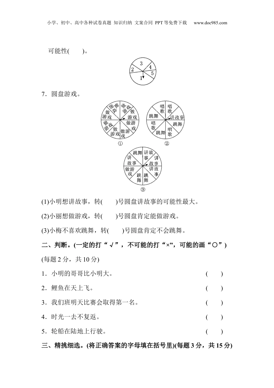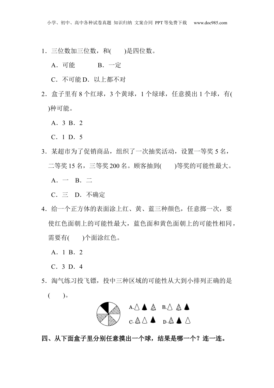 小学、初中、高中各种试卷真题知识归纳文案合同PPT等免费下载www.doc985.com第四单元过关检测卷一、我会填。(每空1分,共19分)1.结合自己的生活经验,用“一定”“可能”或“不可能”填空。(1)地球绕着太阳转。()(2)明天本地要下雨。()(3)水从高处往低处流。()(4)亮亮一年长高一米。()2.一个袋子里只装有红球和绿球,无论从这个袋子里摸几次,都不可能摸到()球。3.一个正方体,四个面上写着“1”,一个面上写着“2”,一个面上写着“3”。掷一次,落下后,写着()的面和写着()的面朝上的可能性一样大。4.口袋里有红色铅笔2支,蓝色铅笔5支,任意摸出1支,可能摸到()铅笔,也可能摸到()铅笔,摸到()铅笔的可能性大。5.袋子里放着3个苹果,5个橘子,2个桃子,7个梨,小明随便拿出一个水果,有()种可能,拿到()的可能性最小。要想让这种水果被拿出的可能性最大,至少还要增加()个。6.转动下面的圆盘,圆盘停止后,指针最有可能指向()号区域;指针指向单号区域的可能性和指向双号区域的可能性相比,指向()区域的可能性大;指针指向3号区域的可能性比指向4号区域的小学、初中、高中各种试卷真题知识归纳文案合同PPT等免费下载www.doc985.com可能性()。7.圆盘游戏。(1)小明想讲故事,转()号圆盘讲故事的可能性最大。(2)小丽想做游戏,转()号圆盘肯定能做游戏。(3)小梅不喜欢跳舞,转()号圆盘肯定不会跳舞。二、判断。(一定的打“√”,不可能的打“×”,可能的画“○”)(每题2分,共10分)1.小明的哥哥比小明大。()2.鲤鱼在天上飞。()3.我们班明天比赛会取得第一名。()4.时光一去不复返。()5.轮船在陆地上行驶。()三、精挑细选。(将正确答案的字母填在括号里)(每题3分,共15分)小学、初中、高中各种试卷真题知识归纳文案合同PPT等免费下载www.doc985.com1.三位数加三位数,和()是四位数。A.可能B.一定C.不可能D.以上都不对2.盒子里有8个红球,3个黄球,1个绿球,任意摸出1个球,有()种可能。A.3B.2C.1D.53.某超市为了促销商品,组织了一次抽奖活动,设置一等奖5名,二等奖15名,三等奖200名。顾客抽到()等奖的可能性最大。A.一B.二C.三D.不确定4.给一个正方体的表面涂上红、黄、蓝三种颜色,任意掷一次,要使红色面朝上的可能性最大,蓝色面和黄色面朝上的可能性相同,需要有()个面涂红色。A.1B.2C.3D.45.淘气练习投飞镖,投中三种区域的可能性从大到小排列正确的是()。四、从下面盒子里分别任意摸出一个球,结果是哪一个?连一连。小学、初中、高中各种试卷真题知识归纳文案合同PPT等免费下载www.doc985.com(12分)五、按要求给球涂颜色。(每题3分,共9分)每个盒子里只可能有白色球和黑色球,分别从里面任意摸出一个球。1.摸出的一定是黑色球。2.摸出的可能是黑色球。3.摸出的不可能是黑色球。六、动脑筋。(每空2分,共10分)有4张背面相同的卡片,正面分别写着1、2、3、4,把它们洗匀后反扣,每次抽出一张,记录结果,再放回去和其他卡片混合。1.任意抽出一张卡片可能是()。小学、初中、高中各种试卷真题知识归纳文案合同PPT等免费下载www.doc985.com2.抽出比4小的卡片的可能性()。(填“大”或“小”)3.抽出比2大的卡片有()种可能,分别是()。4.可能抽到比4大的卡片吗?答:()。七、解决问题。(每题5分,共25分)1.一个盒子里放有2个红球,2个黄球,2个绿球。如果任意摸出一个,可能出现哪几种结果?2.聪聪、笑笑和智慧老人三个人都想去看电影,可只有2张门票。请你想一想,可能是哪两个人一起去?3.一个盒子里有大小、形状一样的15块奶糖,30块水果糖和5块巧克力糖,任意摸出一块糖,摸出什么糖的可能性最小?小学、初中、高中各种试卷真题知识归纳文案合同PPT等免费下载www.doc985.com4.书架上有20本连环画和一些故事书。任意拿出一本书,如果是故事书的可能性大,那么故事书最少要有多少本?5.有4张背面朝上的扑克牌(背面相同),分别是红桃5、黑桃5、方块5和梅花5,如果要猜哪张扑克牌是红桃5,而且猜很多次,是猜对的次数多还是猜错的次数多?小学、初中、高中各种试卷真题知识归纳文案合同PPT等免费下载www.doc985.com答案一、1.(1)一...