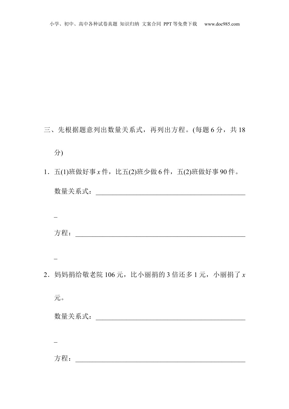 小学、初中、高中各种试卷真题知识归纳文案合同PPT等免费下载www.doc985.com方程的实际应用能力检测卷一、我会填。(每空2分,共20分)1.a的5倍与b的差用含有字母的式子表示是()。2.当m=1.2,n=0.6时,mn的值是(),m÷n的值是()。3.已经修的米数+()=总共要修的米数;全班人数-()=男生人数;()×时间=路程。4.国庆期间,某品牌的手机十分畅销,上午卖出75部,下午卖出100部,这一天共卖了()元,上午比下午少卖了()元。5.在里填上适当的数,使每个方程的解都是x=7。×x=56x-=1.6二、解方程。(每题4分,共8分)8x-5.4x=15.63(5x+1.7)=32.4小学、初中、高中各种试卷真题知识归纳文案合同PPT等免费下载www.doc985.com三、先根据题意列出数量关系式,再列出方程。(每题6分,共18分)1.五(1)班做好事x件,比五(2)班少做6件,五(2)班做好事90件。数量关系式:_____________________________________________方程:___________________________________________________2.妈妈捐给敬老院106元,比小丽捐的3倍还多1元,小丽捐了x元。数量关系式:_____________________________________________方程:__________________________________________________小学、初中、高中各种试卷真题知识归纳文案合同PPT等免费下载www.doc985.com_3.阳光运动中,学校新买了足球和篮球各20个,共用去2400元。足球每个80元,篮球每个x元。方法一:数量关系式:____________________________________________方程:___________________________________________________方法二:数量关系式:_____________________________________________方程:___________________________________________________小学、初中、高中各种试卷真题知识归纳文案合同PPT等免费下载www.doc985.com四、用什么方法计算更简便?连一连。(12分)甲班植树300棵,比乙班的3倍少30棵。求乙班植树的棵数。甲班植树300棵,乙班比甲班的3倍少30棵。求乙班植树的棵数。算术法甲班植树300棵,乙班植树棵数是甲班的3倍,两个班一共植树多少棵?方程法甲、乙两班共植树300棵,乙班植树棵数是甲班的3倍,两个班各植树多少棵?小学、初中、高中各种试卷真题知识归纳文案合同PPT等免费下载www.doc985.com五、我会应用。(每题6分,共42分)1.世界上最大的鸟是非洲鸵鸟,一只约重90kg,比一只鹅体重的13倍少4.9kg。一只鹅约重多少千克?2.鹤和龟的数量相同,一共有114只脚,鹤和龟各有几只?3.妈妈和爸爸一共有120名微信好友,其中爸爸的微信好友是妈妈的3倍。妈妈和爸爸的微信好友各有多少人?小学、初中、高中各种试卷真题知识归纳文案合同PPT等免费下载www.doc985.com4.某小区1号楼的部分住户电费收费表如下:室号上次读数/千瓦时本次读数/千瓦时电费/元20113451705187.22022320124.8202室上次的电表读数是多少?5.小笑和小乐都参加了“中国梦”演讲比赛,共得197分。她们两人各得了多少分?小学、初中、高中各种试卷真题知识归纳文案合同PPT等免费下载www.doc985.com6.上午运了5次,下午要运多少次才能运完?7.甲、乙两辆货车同时从A地开往B地。经过5小时后,乙车超过甲车42.5km。甲车每小时行64km,乙车每小时行多少千米?小学、初中、高中各种试卷真题知识归纳文案合同PPT等免费下载www.doc985.com答案一、1.5a-b2.0.7223.未修的米数女生人数速度4.175x25x5.85.4二、8x-5.4x=15.6解:2.6x=15.6x=15.6÷2.6x=63(5x+1.7)=32.4解:5x+1.7=32.4÷35x+1.7=10.85x=10.8-1.75x=9.1x=9.1÷5小学、初中、高中各种试卷真题知识归纳文案合同PPT等免费下载www.doc985.comx=1.82三、1.五(2)班做好事的件数-五(1)班做好事的件数=690-x=62.小丽捐的钱数×3+1=1063x+1=1063.买足球的钱数+买篮球的钱数=240020×80+20x=2400(足球的单价+篮球的单价)×20=240020(80+x)=2400四、五、1.解:设一只鹅约重xkg。13x-4.9=9013x=90+4.913x=94.9x=94.9÷13x=7.3小学、初中、高中各种试卷真题知识归纳文案合同PPT等免费下载www.doc985.com答:一只鹅约重7.3kg。【点拨】求一倍量,用方程解决较...