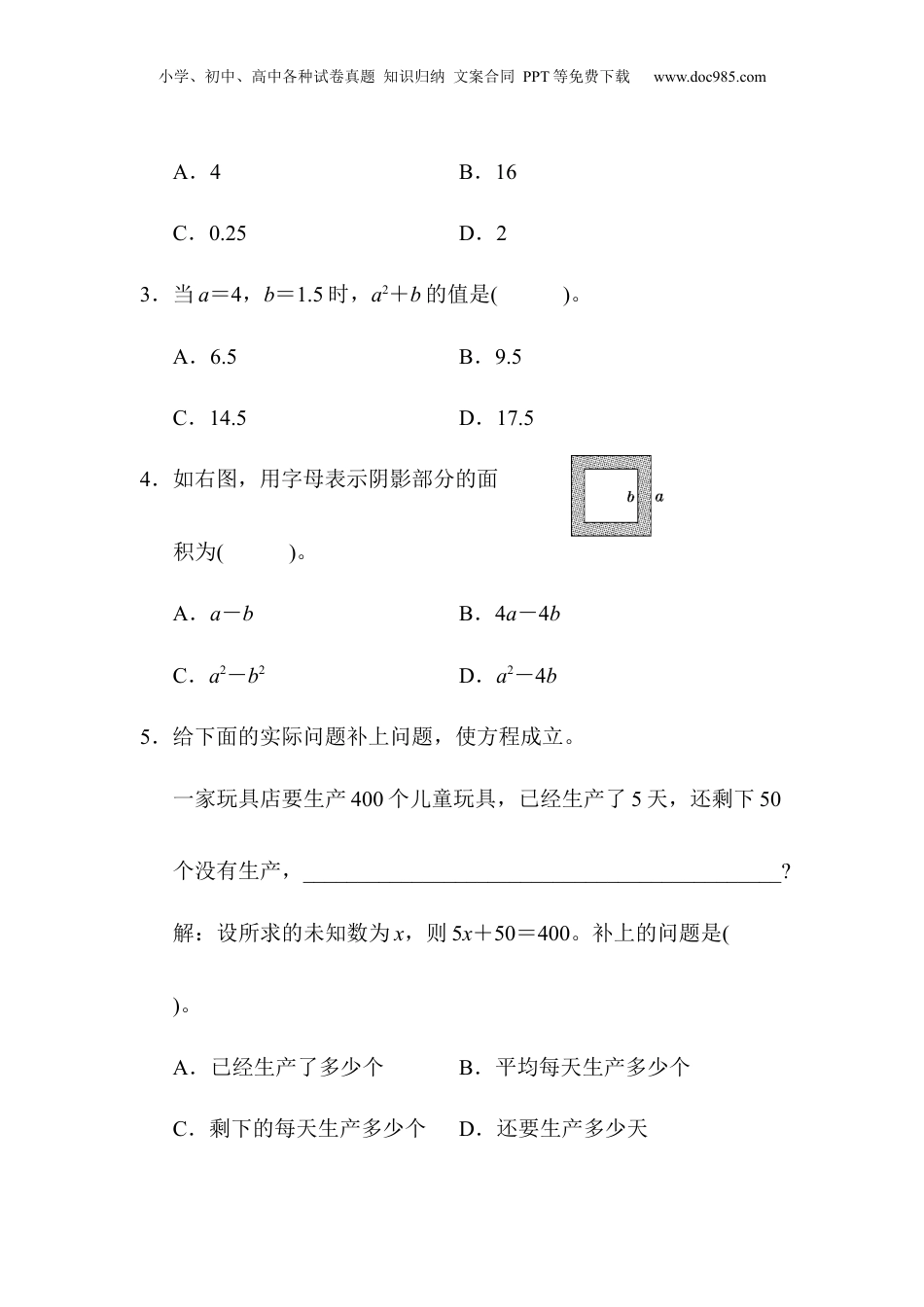 小学、初中、高中各种试卷真题知识归纳文案合同PPT等免费下载www.doc985.com第五单元达标测试卷一、填一填。(每空1分,共22分)1.商店原有x箱苹果,卖出一些后,还剩10箱,卖出()箱。2.五(1)班有女生x人,比男生少5人,男生有()人,全班有()人。3.赵欣今年x岁,爸爸今年的年龄是赵欣的4.5倍。4.5x表示();4.5x-x表示()。4.刘大伯家养有m只公鸡,母鸡的只数是公鸡的7倍。公鸡和母鸡共有()只。5.每本书a元,每支笔b元,买3本书和2支笔,一共需()元。根据这个式子,当a=4.5,b=1.8时,一共需()元。6.在里填上“>”“<”或“=”。(1)当x=0.6时,5x+1.54.5,5x-1.54.5。(2)当x=20时,2x-0.4x48,2x+0.4x48。7.如果3x+4=25,那么4x+3的值是()。8.一个正方形的边长是a米,这个正方形的周长是()米,面积是()平方米;当a=0.3时,周长是()米,面积是(小学、初中、高中各种试卷真题知识归纳文案合同PPT等免费下载www.doc985.com)平方米。9.三个连续的自然数,其中最小的一个是m,其余两个数分别是()和(),这三个数的和是()。10.一辆汽车每小时行驶80千米,a小时一共行驶()千米,照这样的速度,行驶b千米需要()小时。二、辨一辨。(对的画“√”,错的画“×”)(每题2分,共10分)1.4x-20=4与5x+20=50的解是相同的。()2.含有未知数的式子叫做方程。()3.8x表示8个x相乘。()4.7x-7=7(x-1)。()5.等式两边同时乘(或除以)相同的数,等式仍成立。()三、选一选。(把正确答案的字母填在括号里)(每题2分,共10分)1.下列各式中,()是方程。A.48x+5B.x-2>4C.6x+7y=32D.3.2+1.5=4.72.已知ax+bx=8,当x=2时,那么a+b=()。小学、初中、高中各种试卷真题知识归纳文案合同PPT等免费下载www.doc985.comA.4B.16C.0.25D.23.当a=4,b=1.5时,a2+b的值是()。A.6.5B.9.5C.14.5D.17.54.如右图,用字母表示阴影部分的面积为()。A.a-bB.4a-4bC.a2-b2D.a2-4b5.给下面的实际问题补上问题,使方程成立。一家玩具店要生产400个儿童玩具,已经生产了5天,还剩下50个没有生产,____________________________________________?解:设所求的未知数为x,则5x+50=400。补上的问题是()。A.已经生产了多少个B.平均每天生产多少个C.剩下的每天生产多少个D.还要生产多少天小学、初中、高中各种试卷真题知识归纳文案合同PPT等免费下载www.doc985.com四、算一算。(1题12分,2题8分,共20分)1.解方程。3.6÷x=7.28x÷5=42.82.8x+0.4=60.8(5+x)=327x-3.5x=9.15.6x-9.2×3=11.62.列出方程并求方程的解。(1)一个数乘1.8,再减去3.4,得2.9,这个数是多少?(2)一个数的2.8倍与这个数的3.2倍的和是9,这个数是多少?小学、初中、高中各种试卷真题知识归纳文案合同PPT等免费下载www.doc985.com五、填一填。(每题2分,共4分)1.甲数是a,比乙数的5倍少10,表示乙数的式子是()。2.甲数x是乙数的2倍,甲、乙两数的和是()。六、解方程。(4分)7.5÷x-3=218×1.5-1.7x=13.4七、填一填。(3题1分,其余每题2分,共5分)1.在里填上适当的数,使每个方程的解都是x=0.4。+2x=43.5x-=0.32.在里填入相同的数,使等式成立。3.6×-×2.8=12×1.5+2.5×=93.小明把4x-5错写成4(x-5),结果与原来相差()。八、列方程解决问题。(6题5分,其余每题4分,共25分)小学、初中、高中各种试卷真题知识归纳文案合同PPT等免费下载www.doc985.com1.据统计,2016年湖北省有36.1万人报名参加高考,比北京市报名参加高考人数的5倍还多5.6万人,北京市有多少万人报名参加高考?2.连续两个双数的和是102,这两个连续的双数分别是多少?3.(变式题)王阿姨去水果店买了3千克苹果和4千克梨,用去了50.5元。已知苹果每千克9.5元,梨每千克多少元?4.张大伯家有一块长方形菜地,菜地的周长是204米,它的长是宽小学、初中、高中各种试卷真题知识归纳文案合同PPT等免费下载www.doc985.com的2倍。这块菜地的长和宽分别是多少米?面积是多少平方米?5.(变式题)停车场有相同数量的摩托车和小轿车,共有84个轮子,摩托车和小轿车各有多少辆?6.(变式题)甲、乙两地间的...