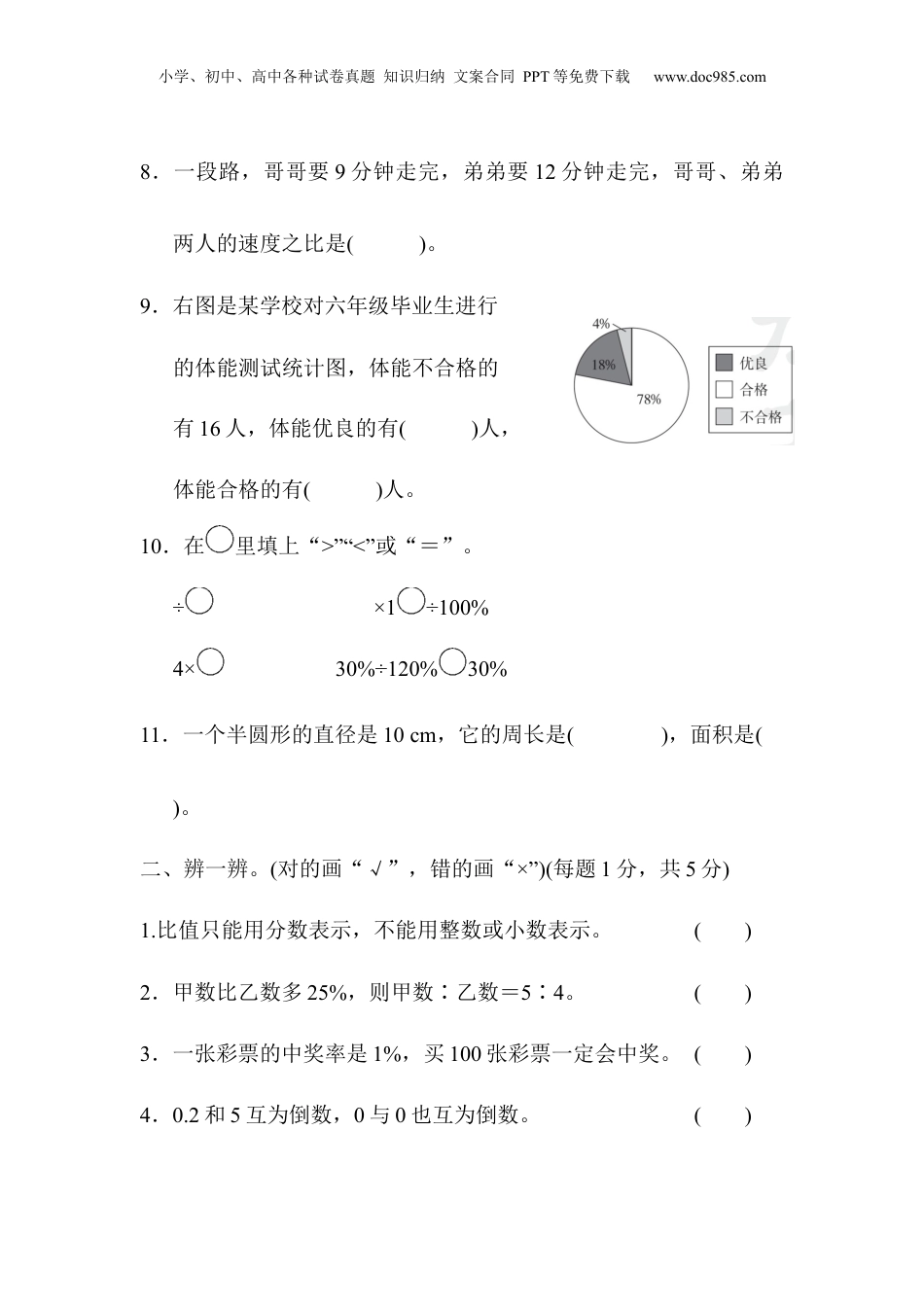 小学、初中、高中各种试卷真题知识归纳文案合同PPT等免费下载www.doc985.com期末总复习仿真模拟卷一、填一填。(每空1分,共21分)1.有一堆煤重12t,第一次运走它的,第二次运走t,还剩()t煤。2.()比20多,30比()少。3.某厂生产一批热水器,396台合格,4台不合格,这批热水器的合格率是()。4.用圆规画一个周长为50.24cm的圆,圆规两脚间的距离应取()cm,所画圆的面积是()cm2。5.三鲜饺子馅中虾仁、韭菜和鸡蛋的质量比是1∶3∶2,要制作1200克这种饺子馅需要()克虾仁、()克韭菜和()克鸡蛋。6.男生人数和女生人数的比是4∶5,那么男生的人数比女生少()%,女生的人数比男生多()%。7.一项工程,甲、乙合做要15天完成,甲单独做需要20天完成,乙单独做需要()天完成。小学、初中、高中各种试卷真题知识归纳文案合同PPT等免费下载www.doc985.com8.一段路,哥哥要9分钟走完,弟弟要12分钟走完,哥哥、弟弟两人的速度之比是()。9.右图是某学校对六年级毕业生进行的体能测试统计图,体能不合格的有16人,体能优良的有()人,体能合格的有()人。10.在里填上“>”“<”或“=”。÷×1÷100%4×30%÷120%30%11.一个半圆形的直径是10cm,它的周长是(),面积是()。二、辨一辨。(对的画“√”,错的画“×”)(每题1分,共5分)1.比值只能用分数表示,不能用整数或小数表示。()2.甲数比乙数多25%,则甲数∶乙数=5∶4。()3.一张彩票的中奖率是1%,买100张彩票一定会中奖。()4.0.2和5互为倒数,0与0也互为倒数。()小学、初中、高中各种试卷真题知识归纳文案合同PPT等免费下载www.doc985.com5.用4个圆心角是90°的扇形,一定可以拼成一个圆。()三、选一选。(把正确答案的字母填在括号里)(每题2分,共10分)1.甲建筑物在乙建筑物的北偏西20°的方向上,则乙建筑物在甲建筑物的()方向上。A.西偏北70°B.南偏西20°C.南偏东20°2.科学研究证明,儿童的负重最好不要超过体重的,如果长期背负过重物体,会导致腰痛及背痛,严重的甚至会妨碍骨骼成长。红红的体重是30kg,她的书包重5kg。红红的书包()。A.超重了B.没超重C.没法确定3.25m增加20%后,再减少20%,结果是()m。A.25B.24C.234.在边长是a分米的正方形中,画一个最大的圆,这个圆的面积约占整个正方形面积的()。A.78.5%B.21.5%C.a25.用一块长24cm,宽14cm的铁皮剪半径为3cm的圆,最多可以剪()个。小学、初中、高中各种试卷真题知识归纳文案合同PPT等免费下载www.doc985.comA.32B.16C.8D.4四、计算挑战。(共26分)1.直接写得数。(每题1分,共8分)3÷=×1.2=10÷10%=6×+6×=÷5%=÷21=1-50%=×4=2.怎样算简便就怎样算。(每题3分,共12分)×72%÷1.2××÷××(12×16)3.解方程。(每题3分,共6分)x+x=34x÷=12小学、初中、高中各种试卷真题知识归纳文案合同PPT等免费下载www.doc985.com五、看图填一填。(5分)以学校为观测点,书店在()偏()()方向上,距离是()m;少年宫在()偏()()方向上,距离是()m;()在西偏北40°方向上,距离是()m。六、数一数,填一填,做一做。(8分)1.图中各有多少个和?填一填。序号①②③④小学、初中、高中各种试卷真题知识归纳文案合同PPT等免费下载www.doc985.com2.照这样接着画下去,第8个图形中和各有多少个?第10个图形呢?七、解决问题。(每题5分,共25分)1.一座桥的实际造价是2100万元,比原计划少用了,原计划造价是多少万元?2.赵大伯家去年小麦产量是1600kg,今年比去年增产10%,赵大伯家今年的小麦可磨出面粉多少千克?(小麦的出粉率是75%)小学、初中、高中各种试卷真题知识归纳文案合同PPT等免费下载www.doc985.com3.两个工程队合修一条公路,当第一队修了150m时,第二队比第一队多修了,这时两队正好修完全长的65%。这条公路全长多少米?4.如下图所示,大、小两个正方形之间有一部分阴影,求阴影部分的面积是多少?5.用一根50.24dm长的铁丝弯成下图的“8”字形,如果小圆和大圆的直径之比是3∶5,小圆和大圆的面积分别是多少?小学、初中、高中各种试卷真题知识归纳文案合同PPT等免费下载www.doc985.com小学、初中、高中各种试卷真题知识归纳文案合同PPT等免费下...