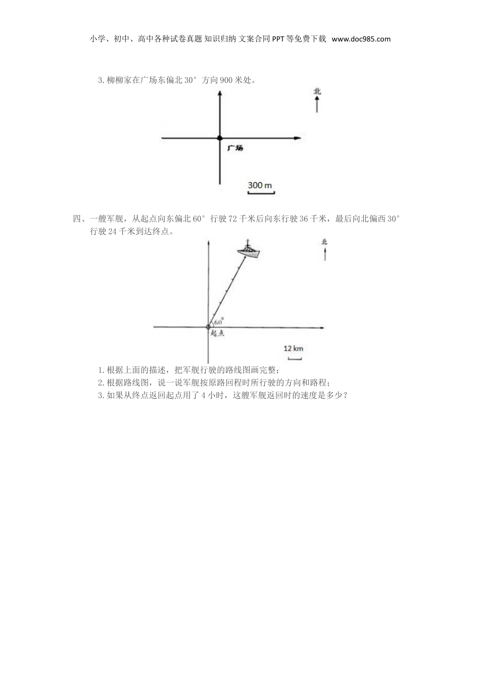 小学、初中、高中各种试卷真题知识归纳文案合同PPT等免费下载www.doc985.com2.2位置与方向(二)一、看图回答问题。1.下图为某路公交车的行车路线。从广场出发向()行驶()站到电影院,再向()行驶()站到商场,再向()偏()的方向行驶()站到少年宫,再向()偏()的方向行驶()站到动物园。2.贝贝从幸福路站出发坐了4站,他可能在()站或()站下车。3.京京坐了3站在少年宫下车,她可能是从()站或()上车的。二、选择。1.图书馆在剧院的东偏南30°方向500米处,那么剧院在图书馆的()。A.东偏南30°方向500米处B.南偏东60°方向500米处C.北偏西30°方向500米处D.西偏北30°方向500米处2.如图,下面说法正确的是()。A.小红家在广场东偏北60°方向上,距离300米处B.广场在学校南偏东35°方向上,距离200米处C.广场在小红家东偏北30°方向上,距离300米处D.学校在广场北偏西35°方向上,距离200米处三、根据下面的描述,在平面图上标出各场所的位置。1.小彬家在广场西偏南45°方向1200米处;2.小丽家在广场北偏西20°方向600米处;小学、初中、高中各种试卷真题知识归纳文案合同PPT等免费下载www.doc985.com3.柳柳家在广场东偏北30°方向900米处。四、一艘军舰,从起点向东偏北60°行驶72千米后向东行驶36千米,最后向北偏西30°行驶24千米到达终点。1.根据上面的描述,把军舰行驶的路线图画完整;2.根据路线图,说一说军舰按原路回程时所行驶的方向和路程;3.如果从终点返回起点用了4小时,这艘军舰返回时的速度是多少?小学、初中、高中各种试卷真题知识归纳文案合同PPT等免费下载www.doc985.com答案:一、1.西2北1西北4南西42.光明街电影院3.光明街育才路二、1.D2.C三、四、1.2.返回时,先向南偏东30°方向行驶24km,再向正西方向行驶36km,最后向南偏西30°方向行驶72km回到起点。3.(千米/时)。答:返回时的速度是33千米/时。