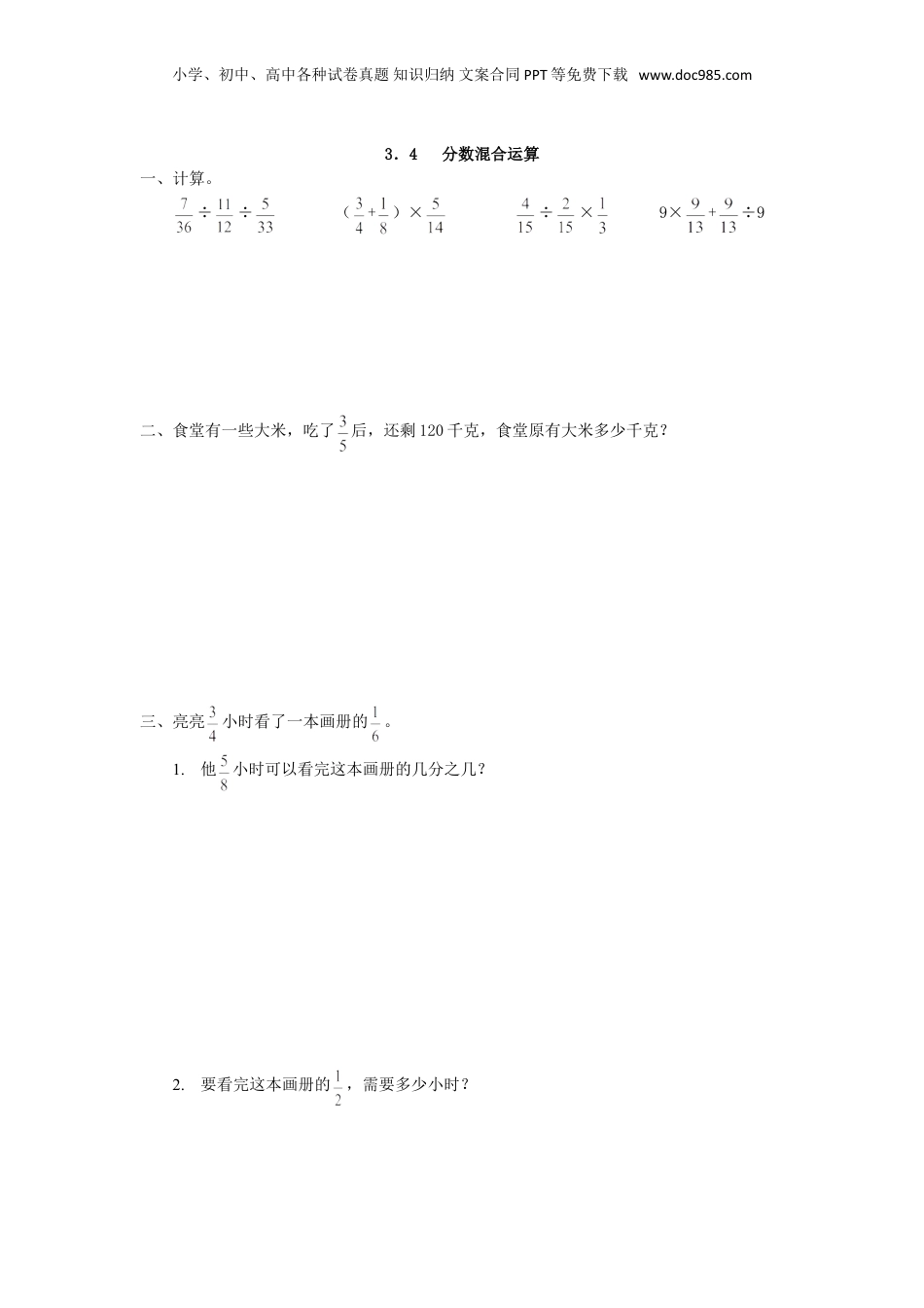 小学、初中、高中各种试卷真题知识归纳文案合同PPT等免费下载www.doc985.com3.4分数混合运算一、计算。÷÷(+)×÷×9×+÷9二、食堂有一些大米,吃了后,还剩120千克,食堂原有大米多少千克?三、亮亮小时看了一本画册的。1.他小时可以看完这本画册的几分之几?2.要看完这本画册的,需要多少小时?小学、初中、高中各种试卷真题知识归纳文案合同PPT等免费下载www.doc985.com答案:一、二、120÷(1--)=300(千克)三、1.÷=2.÷=(时)