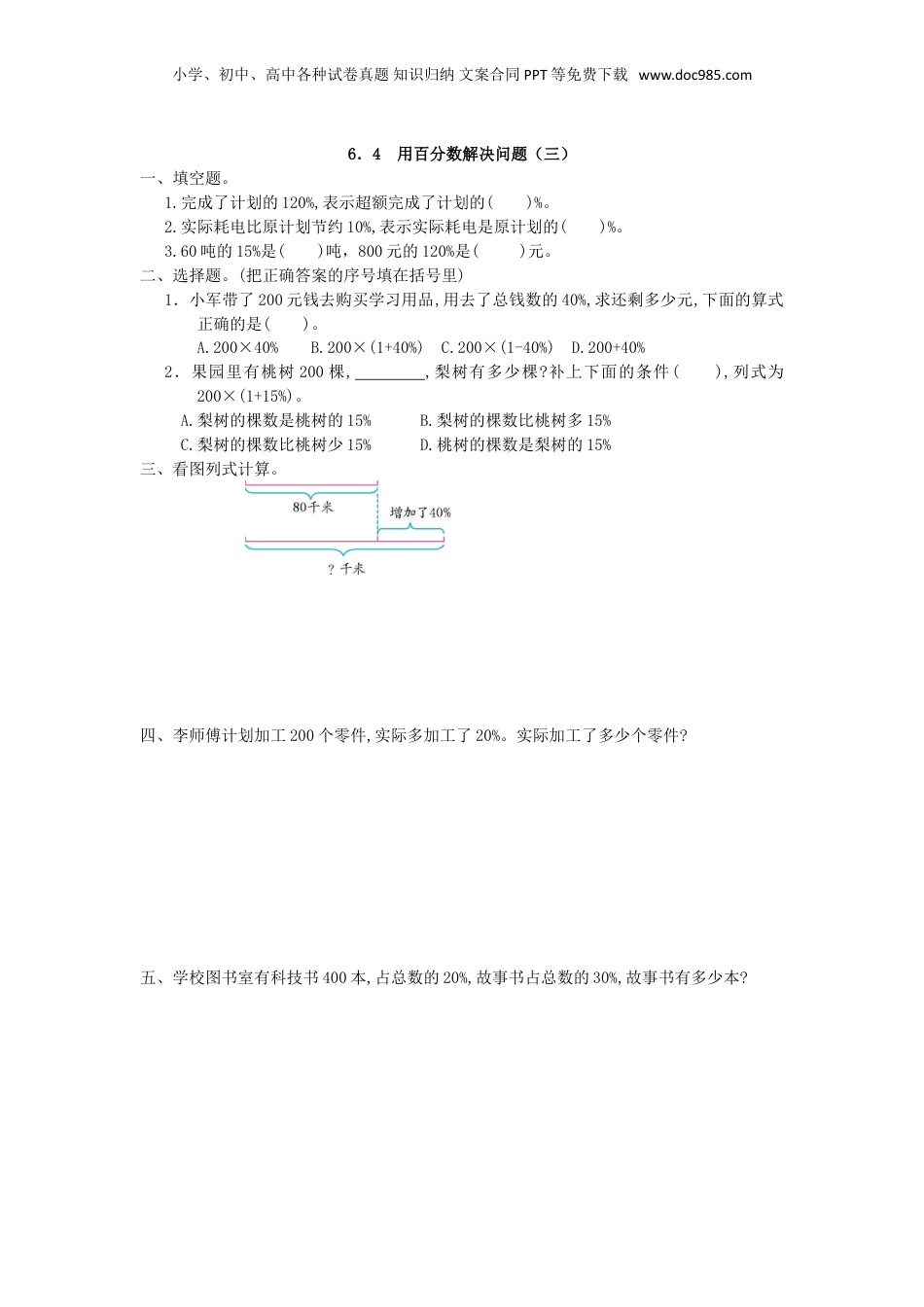 小学、初中、高中各种试卷真题知识归纳文案合同PPT等免费下载www.doc985.com6.4用百分数解决问题(三)一、填空题。1.完成了计划的120%,表示超额完成了计划的()%。2.实际耗电比原计划节约10%,表示实际耗电是原计划的()%。3.60吨的15%是()吨,800元的120%是()元。二、选择题。(把正确答案的序号填在括号里)1.小军带了200元钱去购买学习用品,用去了总钱数的40%,求还剩多少元,下面的算式正确的是()。A.200×40%B.200×(1+40%)C.200×(1-40%)D.200+40%2.果园里有桃树200棵,,梨树有多少棵?补上下面的条件(),列式为200×(1+15%)。A.梨树的棵数是桃树的15%B.梨树的棵数比桃树多15%C.梨树的棵数比桃树少15%D.桃树的棵数是梨树的15%三、看图列式计算。四、李师傅计划加工200个零件,实际多加工了20%。实际加工了多少个零件?五、学校图书室有科技书400本,占总数的20%,故事书占总数的30%,故事书有多少本?小学、初中、高中各种试卷真题知识归纳文案合同PPT等免费下载www.doc985.com答案:一、1.202.903.9960二、1.C2.B三、80×(1+40%)=112(千米)四、200×(1+20%)=240(个)五、400÷20%×30%=600(本)
