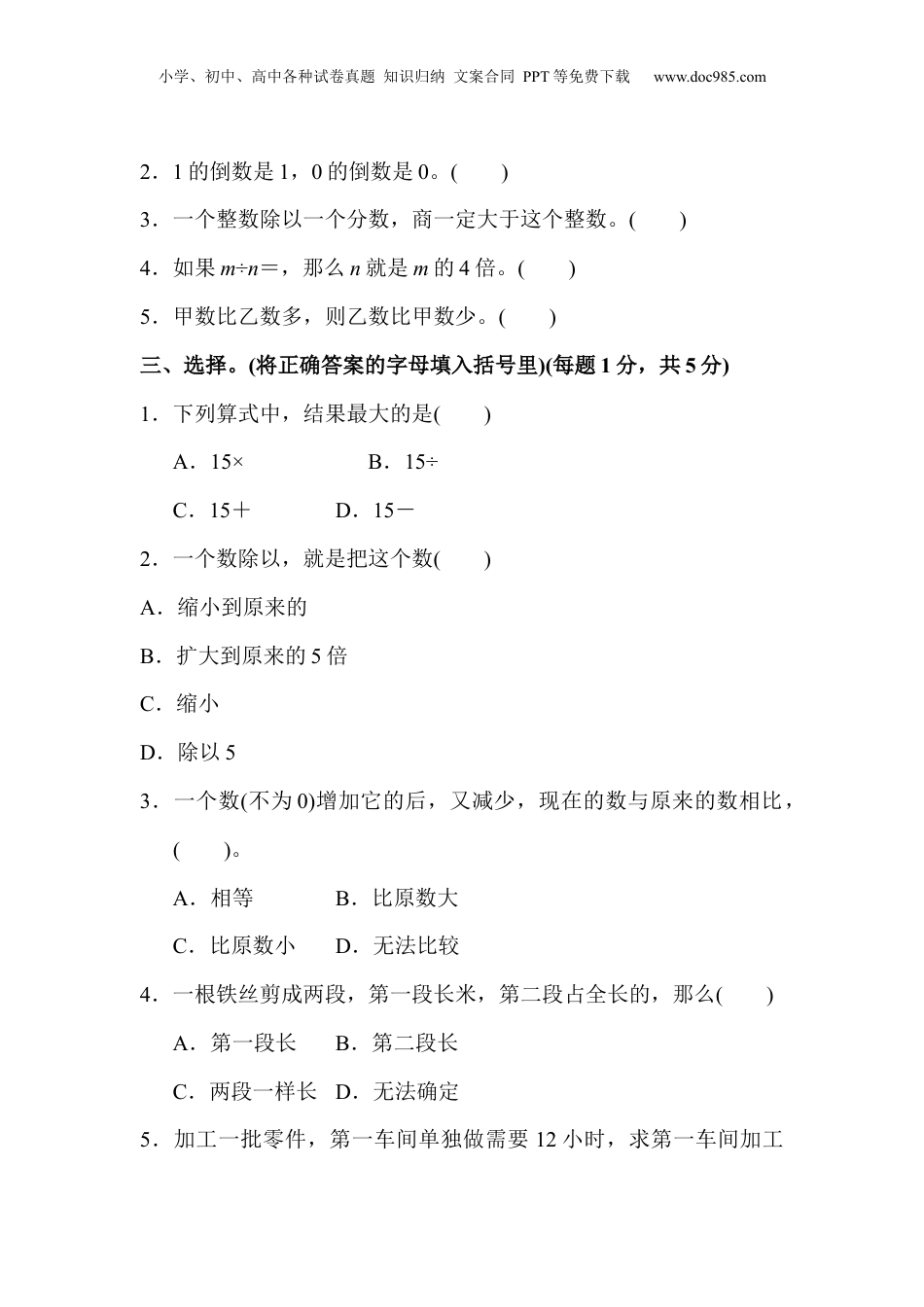 小学、初中、高中各种试卷真题知识归纳文案合同PPT等免费下载www.doc985.com第三单元过关检测卷一、填空。(每空1分,共24分)1.3×()=1.2×()=×()=1×()=2×()=12.根据×=写出两道除法算式:()、()。3.()米的是16米,8千克的是千克。4.在里填上“>”“<”或“=”。÷4÷÷1÷5×8÷8×÷15.48吨比()吨多,4米比()米短。6.甲数的与乙数的相等,甲数是90,乙数是()。7.修一段铁路,4天修了这条铁路的,()天可以修完这条铁路。8.小敏小时行了千米,她每小时行()千米,她行1千米需要()小时。9.甲、乙两车各运4吨货物,甲车每次运吨,乙车每次运这批货物的,甲车运了()次,乙车运了()次。10.一项工作,甲队每天完成这项工作的,乙队每天完成这项工作的。两队合作()天完成这项工作的。二、判断。(对的画“√”,错的画“×”)(每题1分,共5分)1.一个分数的倒数一定比这个数小。()小学、初中、高中各种试卷真题知识归纳文案合同PPT等免费下载www.doc985.com2.1的倒数是1,0的倒数是0。()3.一个整数除以一个分数,商一定大于这个整数。()4.如果m÷n=,那么n就是m的4倍。()5.甲数比乙数多,则乙数比甲数少。()三、选择。(将正确答案的字母填入括号里)(每题1分,共5分)1.下列算式中,结果最大的是()A.15×B.15÷C.15+D.15-2.一个数除以,就是把这个数()A.缩小到原来的B.扩大到原来的5倍C.缩小D.除以53.一个数(不为0)增加它的后,又减少,现在的数与原来的数相比,()。A.相等B.比原数大C.比原数小D.无法比较4.一根铁丝剪成两段,第一段长米,第二段占全长的,那么()A.第一段长B.第二段长C.两段一样长D.无法确定5.加工一批零件,第一车间单独做需要12小时,求第一车间加工小学、初中、高中各种试卷真题知识归纳文案合同PPT等免费下载www.doc985.com这批零件的需要几小时,列式正确的是()。A.÷12B.÷C.×D.+四、计算。(1题3分,2题24分,3题8分,4题5分,共40分)1.直接写得数。8÷=2.4÷=÷=×÷=1-×=2÷=2.计算下列各题,能简算的要简算。÷÷÷8+×+÷÷÷小学、初中、高中各种试卷真题知识归纳文案合同PPT等免费下载www.doc985.com3.解方程。x-=4x÷=4.看图列式解答。五、解决问题。(1题6分,其余每题5分,共26分)1.根据不同的条件列式,不计算。在“变废为宝,从我做起”的科学调查体验活动中,六(1)班收集废品240千克,______________________,六(2)班收集废品多少千克?(1)六(2)班比六(1)班少收集。()(2)比六(2)班多。()小学、初中、高中各种试卷真题知识归纳文案合同PPT等免费下载www.doc985.com(3)六(1)班比六(2)班的多60千克。()2.中国文学家莫言,医学家屠呦呦都获得了诺贝尔奖。屠呦呦获奖感言约有3500字,比莫言的获奖感言少了,莫言的获奖感言约有多少字?3.一套服装720元,裤子的价格是上衣的,裤子和上衣各多少元?4.修一条公路,甲队单独修完要用15天,乙队单独修完要用20天,两队合修5天后,甲队因事被调走,剩下的由乙队修完,乙队一共修了多少天?5.小路周末做一些计算题,上午做了全部题目的,下午又做了余下小学、初中、高中各种试卷真题知识归纳文案合同PPT等免费下载www.doc985.com题目的,这时还剩下10道题,这些计算题一共有多少道?小学、初中、高中各种试卷真题知识归纳文案合同PPT等免费下载www.doc985.com答案一、1.12.÷=÷=3.364.<><=>=5.3666.1087.308.9.16410.4二、1.×2.×3.×4.√5.×三、1.B2.B3.C4.B5.B四、1.182.852.原式=×+×=+=1原式=×=原式=×+×+=×=2×=原式=(6+4)×=10×=14原式=×45+×45-×45=21+25-30=16原式=÷=×=3.x=x=4.50÷÷=100(本)五、1.(1)240×小学、初中、高中各种试卷真题知识归纳文案合同PPT等免费下载www.doc985.com(2)240÷(3)(240-60)÷2.3500÷=6300(字)3.上衣:720÷=450(元)裤子:720-450=270(元)4.5+÷=13(天)点拨:要求乙队共修多少天,必须先求出乙队修完剩下的要多少天。5.10÷=100(道)