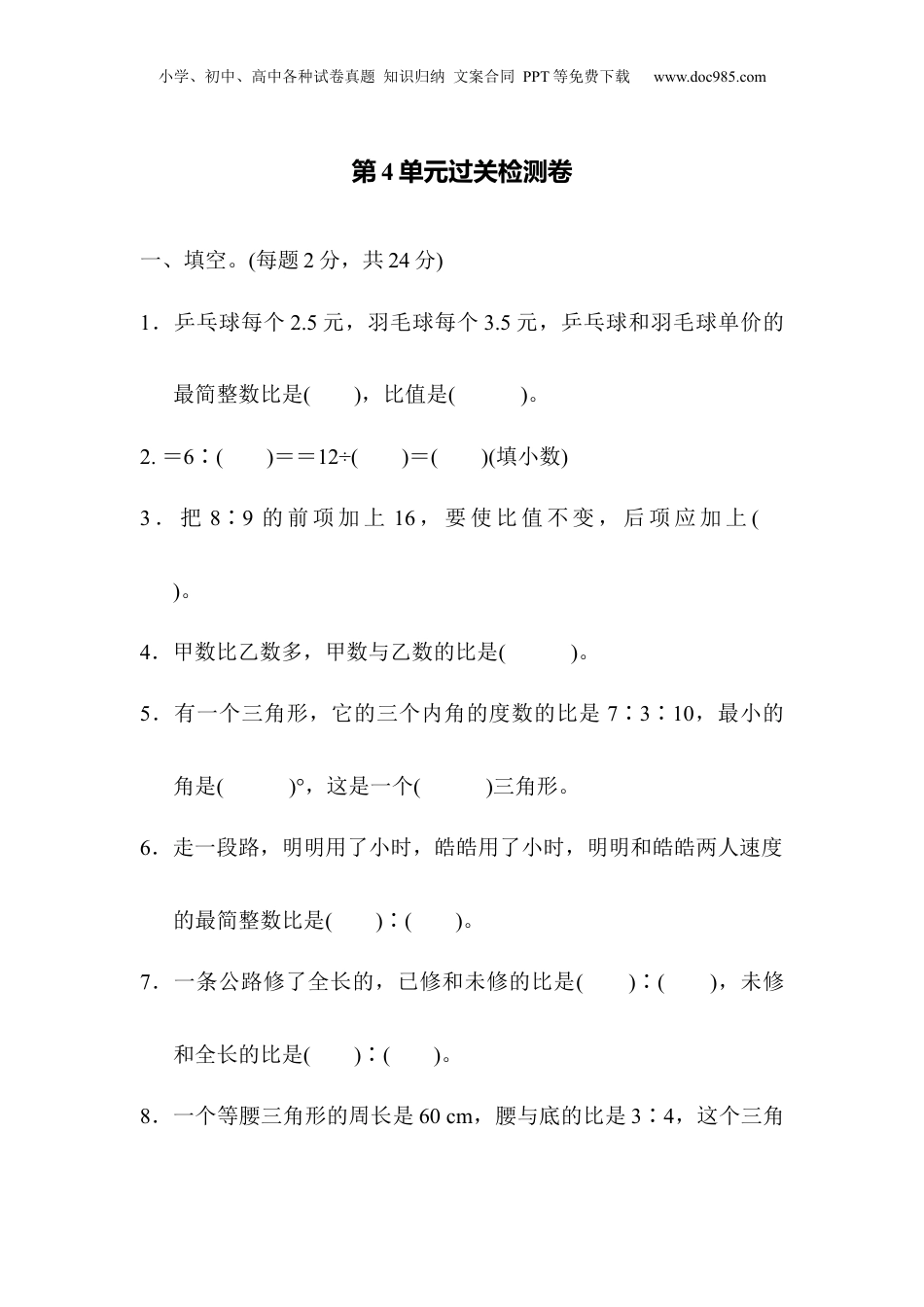 小学、初中、高中各种试卷真题知识归纳文案合同PPT等免费下载www.doc985.com第4单元过关检测卷一、填空。(每题2分,共24分)1.乒乓球每个2.5元,羽毛球每个3.5元,乒乓球和羽毛球单价的最简整数比是(),比值是()。2.=6∶()==12÷()=()(填小数)3.把8∶9的前项加上16,要使比值不变,后项应加上()。4.甲数比乙数多,甲数与乙数的比是()。5.有一个三角形,它的三个内角的度数的比是7∶3∶10,最小的角是()°,这是一个()三角形。6.走一段路,明明用了小时,皓皓用了小时,明明和皓皓两人速度的最简整数比是()∶()。7.一条公路修了全长的,已修和未修的比是()∶(),未修和全长的比是()∶()。8.一个等腰三角形的周长是60cm,腰与底的比是3∶4,这个三角小学、初中、高中各种试卷真题知识归纳文案合同PPT等免费下载www.doc985.com形的腰长是()cm,底长是()cm。9.一批货物按2∶3∶4分配给甲、乙、丙三个队去运,甲队运了这批货物的,丙队比乙队多运这批货物的。10.夏至是一年中白天最长、黑夜最短的一天,其中北京的白天时间与黑夜时间的比是5∶3,白天有()小时,黑夜有()小时。11.一根钢管截去m,截去部分与全长的比是4∶15,这根钢管全长()m。12.从甲袋中取出的奶糖放入乙袋,这时两袋奶糖的质量相等,原来甲、乙两袋奶糖质量的比是()∶()。二、判断。(对的画“√”,错的画“×”)(每题1分,共6分)1.若甲、乙两数的比是4∶5,则乙数比甲数多。()2.比的前项和后项同时乘或除以一个相同的分数,比值不变。()3.0.8m∶4Cm化成最简的整数比是1∶5。()4.一场足球比赛的比分是2∶0,因此,特殊情况下比的后项也可小学、初中、高中各种试卷真题知识归纳文案合同PPT等免费下载www.doc985.com以是0。()5.如果a∶b=7∶11,那么a=7,b=11。()6.甲数除以乙数的商是1.8,甲、乙两数的比是9∶5。()三、选择。(将正确答案的字母填在括号里)(每题1分,共6分)1.下列说法错误的是()。A.录入一份稿件,甲用30分钟,乙用20分钟,甲、乙二人工作效率的比是2∶3B.一个三角形三个内角度数的比是1∶2∶3,这是一个钝角三角形C.最简整数比的前项和后项一定是互质数D.一瓶糖水,糖的质量占糖水的,糖与水的质量比是1∶92.比的前项扩大到原来的2倍,后项缩小到原来的,比值就()。A.缩小到原来的B.扩大到原来的8倍C.扩大到原来的2倍D.缩小到原来的3.六(2)班有学生45人,男、女生人数的比不可能是()。小学、初中、高中各种试卷真题知识归纳文案合同PPT等免费下载www.doc985.comA.2∶1B.3∶2C.4∶5D.3∶44.货车4小时行180km,客车3小时行180km。货车和客车的速度的最简整数比是()。A.3∶2B.9∶20C.3∶4D.4∶35.两个正方形边长的比是3∶5,周长的比是(),面积的比是()。A.3∶5B.9∶25C.5∶3D.25∶96.用70m长的栅栏靠墙围成一块长方形果园(如图),长与宽的比是4∶3,这块长方形果园的面积是()m2。A.1200B.300C.588D.294四)计算。(每题12分,共24分)1.求比值。小学、初中、高中各种试卷真题知识归纳文案合同PPT等免费下载www.doc985.com∶0.75∶24∶6.4∶0.162.25∶34∶512.化简比。∶0.4∶20∶0.7536∶15∶5.6∶4.2小学、初中、高中各种试卷真题知识归纳文案合同PPT等免费下载www.doc985.com五)动手操作。(每题3分,共6分)按要求在下面的方格上画图。(每个小方格的边长是1cm)1.画一个平行四边形,面积是24cm2,底和高的比是3∶2。2.画一个三角形,面积是12cm2,底和高的比是3∶2。六)解决问题。(1题8分,6题6分,其余每题5分,共34分)1.我国有悠久的青铜器铸造史,先秦古籍《考工记》记载了青铜器铸造的锡、铜的质量比。经查阅资料可知:鼎的锡、铜的质量比是1∶5;大刀的锡、铜的质量比是1∶2。(1)一个鼎的质量是360kg,含铜和锡各多少千克?(2)一把大刀含铜的质量是840g,这把大刀的质量是多少克?小学、初中、高中各种试卷真题知识归纳文案合同PPT等免费下载www.doc985.com2.阳光小学六年级有150人参加学校组织的安全知识竞赛,其中共有120人分别获一、二、三等奖,获一等奖的人数占其中的,获二、三等奖人数的比是2∶3,获一、二三等奖的各有多少人?3...