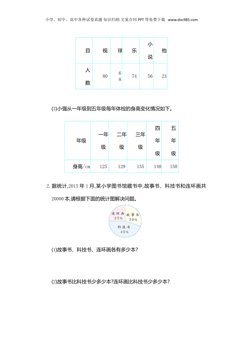 小学、初中、高中各种试卷真题知识归纳文案合同PPT等免费下载www.doc985.com第七单元测试卷一、填空题。1.扇形统计图用()表示总数,用()的面积表示各个部分量占总数的百分比。2.扇形统计图能清楚地反映出()数量与()数量之间的关系。3.下面是鸡蛋各部分质量统计图。从图中我们可以看出:一个鸡蛋中蛋壳的质量约占(),蛋黄的质量约占()。如果一个鸡蛋重50克,那么这个鸡蛋中的蛋白重()克。4.中国人口约占世界人口的21%,全世界有60亿人口,中国约有()亿人口。二、选择题。(把正确答案的序号填在括号里)1.扇形统计图能清楚地表示()。A.数量的多少B.数量的多少和增减变化的情况C.部分数量与总数量之间的关系D.各部分的具体量2.要表示某实验小学各年级学生人数同全校学生总人数的关系,选择()统计图比较合适。A.条形B.扇形C.折线D.复式条形3.东兴村有土地200公顷,其中40公顷种植果树,果树的种植面积占总土地面积的()。A.50%B.40%C.30%D.20%小学、初中、高中各种试卷真题知识归纳文案合同PPT等免费下载www.doc985.com4.空气中含有21%的氧气,200L空气中含有()L氧气。A.100B.42C.21D.505.永兴超市春节期间共运来水果420千克,其中橘子运来120千克,香蕉运来50千克,橘子约占运来水果的(),香蕉约占运来水果的()。A.28.6%B.32.5%C.42.5%D.11.9%三、把下面的统计表填写完整。长城电视机厂第一季度生产情况统计表项目产量/台月份实际产量计划产量完成计划的百分比合计1月2400125%2月3360120%3月37803000四、解决问题。1.下列数据分别用哪种统计图表示比较合适?(1)人离不开水,成年人每天体内所需的水,47%靠喝水获得,39%来自食物含的水,14%来自体内氧化时释放出来的水。(2)某校五年级学生最喜欢的课外活动统计表如下。项看电打听音看其小学、初中、高中各种试卷真题知识归纳文案合同PPT等免费下载www.doc985.com目视球乐小说他人数8068745623(3)小强从一年级到五年级每年体检的身高变化情况如下。年级一年级二年级三年级四年级五年级身高/cm1251291351401502.据统计,2015年1月,某小学图书馆藏书中,故事书、科技书和连环画共20000本,请根据下面的统计图解决问题。(1)故事书、科技书、连环画各有多少本?(2)故事书比科技书少多少本?连环画比科技书少多少本?小学、初中、高中各种试卷真题知识归纳文案合同PPT等免费下载www.doc985.com(3)连环画是故事书的百分之几?3.下面是红星村2011年农作物种植面积统计图。棉花种植了60公顷,农作物种植的总面积是多少公顷?其他粮食作物种植了多少公顷?4.下面是育才小学六年级同学最喜欢的图书统计图。(1)喜欢故事书的人数占全年级人数的百分之几?小学、初中、高中各种试卷真题知识归纳文案合同PPT等免费下载www.doc985.com(2)六年级有300人,喜欢科技书和漫画书的一共有多少人?五、附加题。下图是某公司职员学历统计图,你从图中发现哪些数学问题?第七单元测试卷参考答案一、1.圆扇形2.部分总3.15%32%26.54.12.6二、1.C2.B3.D4.B5.AD三、101408200123.7%30002800126%四、1.(1)扇形统计图(2)条形统计图(3)折线统计图2.(1)故事书:20000×30%=6000(本)科技书:20000×45%=9000(本)连环画:20000×25%=5000(本)小学、初中、高中各种试卷真题知识归纳文案合同PPT等免费下载www.doc985.com(2)9000-6000=3000(本)9000-5000=4000(本)(3)5000÷6000≈83.3%3.60÷20%=300(公顷)300×70%=210(公顷)4.(1)1-24%-15%-23%=38%(2)300×(24%+23%)=141(人)五、答案不唯一,如:博士占百分之几?1-50%-6%-14%-18%=12%