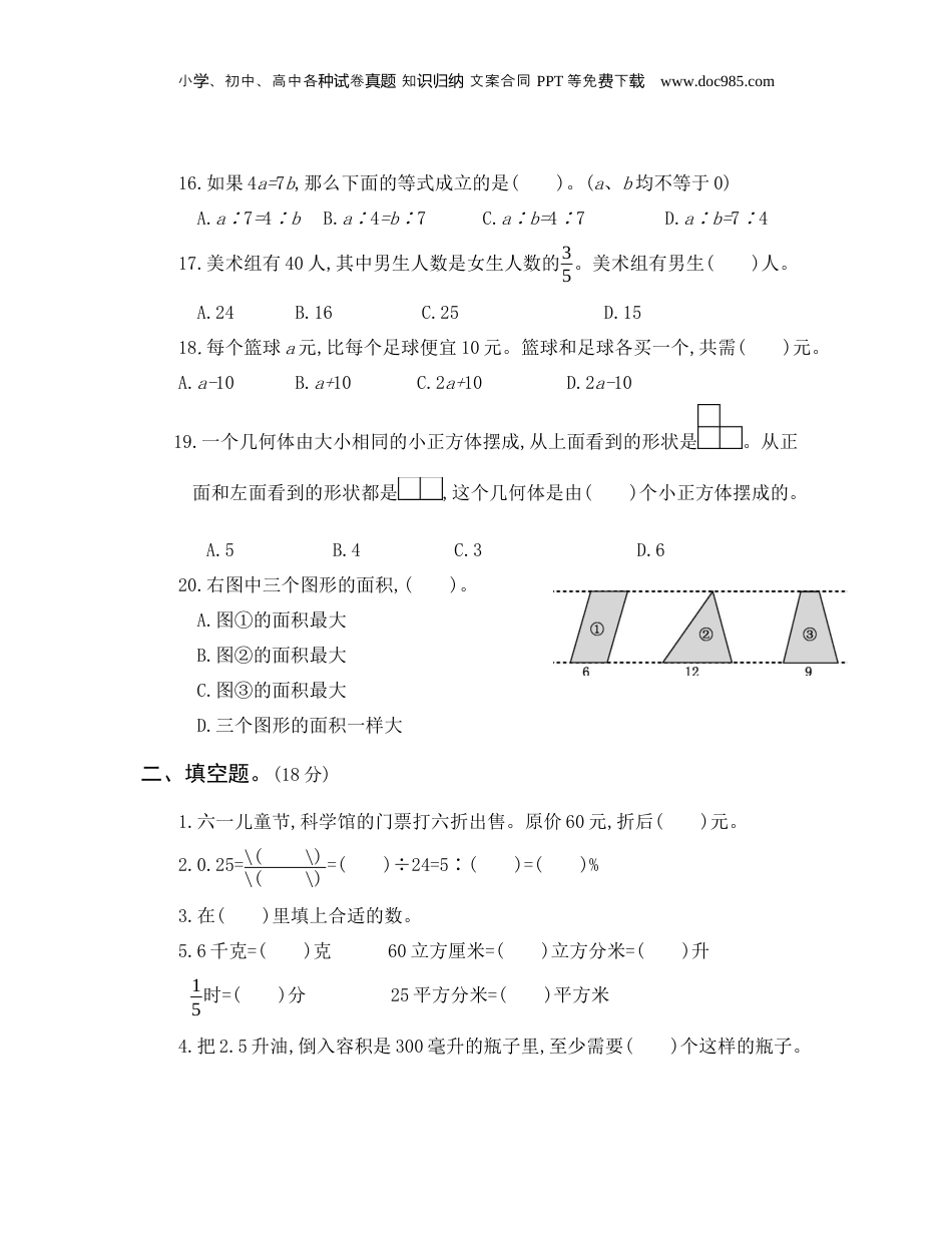 小、初中、高中各卷知文案合同学种试真题识归纳PPT等免下费载www.doc985.com六年级小升初真题卷(五)时间:90分分钟满:100分序题一二三四分总得分一、选择题。(把正确答案的序号填在括号里)(20分)1.一个三角形,其中有两个角分别是50°和70°,第三个角是()。A.60°B.70°C.80°D.50°2.甲数是78,乙数是0.25,则甲数与乙数的最简整数比是()。A.7∶1B.7C.7∶2D.3.53.一辆汽车35小时行了60km。照这样的速度,这辆汽车2小时可行()km。A.200B.72C.120D.2604.甲数与乙数的比是3∶5,那么甲数比乙数少()%。A.60B.40C.62.5D.37.55.一张地图的比例尺是1∶25000,从图中测得两地的距离是4cm,它们的实际距离是()km。A.1B.10C.100D.1000006.一个整数,亿位上是最小的质数,十万位上是最小的合数,百位上是最大的一位数,其余各位上的数既不是正数也不是负数,这个数是()。A.200400000B.100400000C.200400900D.2114110117.在0.3·1·,0.3·13·,310,-33.3·中,最大的数是()。A.-33.3·B.0.3·13·C.0.3·1·D.3108.79÷a<79,则()。小、初中、高中各卷知文案合同学种试真题识归纳PPT等免下费载www.doc985.comA.a<1B.0<a<1C.a<79D.a>19.1115减去()个这样的分数单位,化简后是15。A.10B.9C.8D.710.下面各选项中的两种量,成正比例关系的是()。A.平行四边形的面积一定,它的底和高B.已知y=3+x,y和xC.正方体的表面积与它的一个面的面积D.已知9∶x=y∶4,y和x11.一个袋子里装有1000个红球,2个白球,任意摸出一个,下面的说法错误的是()。A.不可能是黑球B.可能是红球也可能是白球C.摸出红球的可能性大很多D.一定是红球12.一张长方形纸(如右图),把它卷成圆柱形(接口处忽略不计),这个圆柱的高是10cm,它的底面直径是()cm。A.5B.10C.31.4D.31413.右图阴影部分的面积是()cm2。A.87.92B.21.98C.6.28D.31414.一个圆锥形铁块的底面积为20cm2,高为9cm。把完全浸没在盛有水的内底面积是30cm2的圆柱形容器里(水没有溢出),水面升高()cm。A.4B.6C.3D.215.如右图,每个小正方形的对角线长10m,那么在点(0,0)北偏东45°方向40m处是点()。A.(3,3)B.(4,3)C.(4,4)D.(3,4)小、初中、高中各卷知文案合同学种试真题识归纳PPT等免下费载www.doc985.com16.如果4a=7b,那么下面的等式成立的是()。(a、b均不等于0)A.a∶7=4∶bB.a∶4=b∶7C.a∶b=4∶7D.a∶b=7∶417.美术组有40人,其中男生人数是女生人数的35。美术组有男生()人。A.24B.16C.25D.1518.每个篮球a元,比每个足球便宜10元。篮球和足球各买一个,共需()元。A.a-10B.a+10C.2a+10D.2a-1019.一个几何体由大小相同的小正方体摆成,从上面看到的形状是。从正面和左面看到的形状都是,这个几何体是由()个小正方体摆成的。A.5B.4C.3D.620.右图中三个图形的面积,()。A.图①的面积最大B.图②的面积最大C.图③的面积最大D.三个图形的面积一样大二、填空题。(18分)1.六一儿童节,科学馆的门票打六折出售。原价60元,折后()元。2.0.25=\(\)\(\)=()÷24=5∶()=()%3.在()里填上合适的数。5.6千克=()克60立方厘米=()立方分米=()升15时=()分25平方分米=()平方米4.把2.5升油,倒入容积是300毫升的瓶子里,至少需要()个这样的瓶子。小、初中、高中各卷知文案合同学种试真题识归纳PPT等免下费载www.doc985.com5.“1□6☆”是一个四位数,它同时是2,3,5的倍数,那么☆所代表的数字是(),□所代表的数字最小是()。6.运一堆货物,甲车单独运20次运完,乙车单独运30次运完。两车一起运,()次可以运完。7.一种药液,由药粉和水按1∶24的质量比混合而成。现有这种药液50kg,里面含药粉()kg;要配制这种药液,5kg的药粉需加入水()kg。8.右图是某校六年级全体学生某次数学竞赛成绩的统计图。(1)这个统计图用整个圆表示()的人数。(2)不及格人数占全年级人数的()%。“及格”部分的扇形圆心角是()度。(3)若获得良好成绩的有80人,那么全年级共有()人。9.已知○+☆=30,☆=○+○+○+○。那么○=(),☆=()。10.把红、黄、蓝三种颜色的球各5个放到袋子里。从中至少取()个球,可以保证取到两个颜色相同的球。三、计算题。(62分)1.直接写出得数。(8分)47÷2=38÷35=3.6÷1.2=12+1÷3=34×0.8=34×815=3.2+1.18=1511-(411+213)=2.用脱式计算。(能简算的...