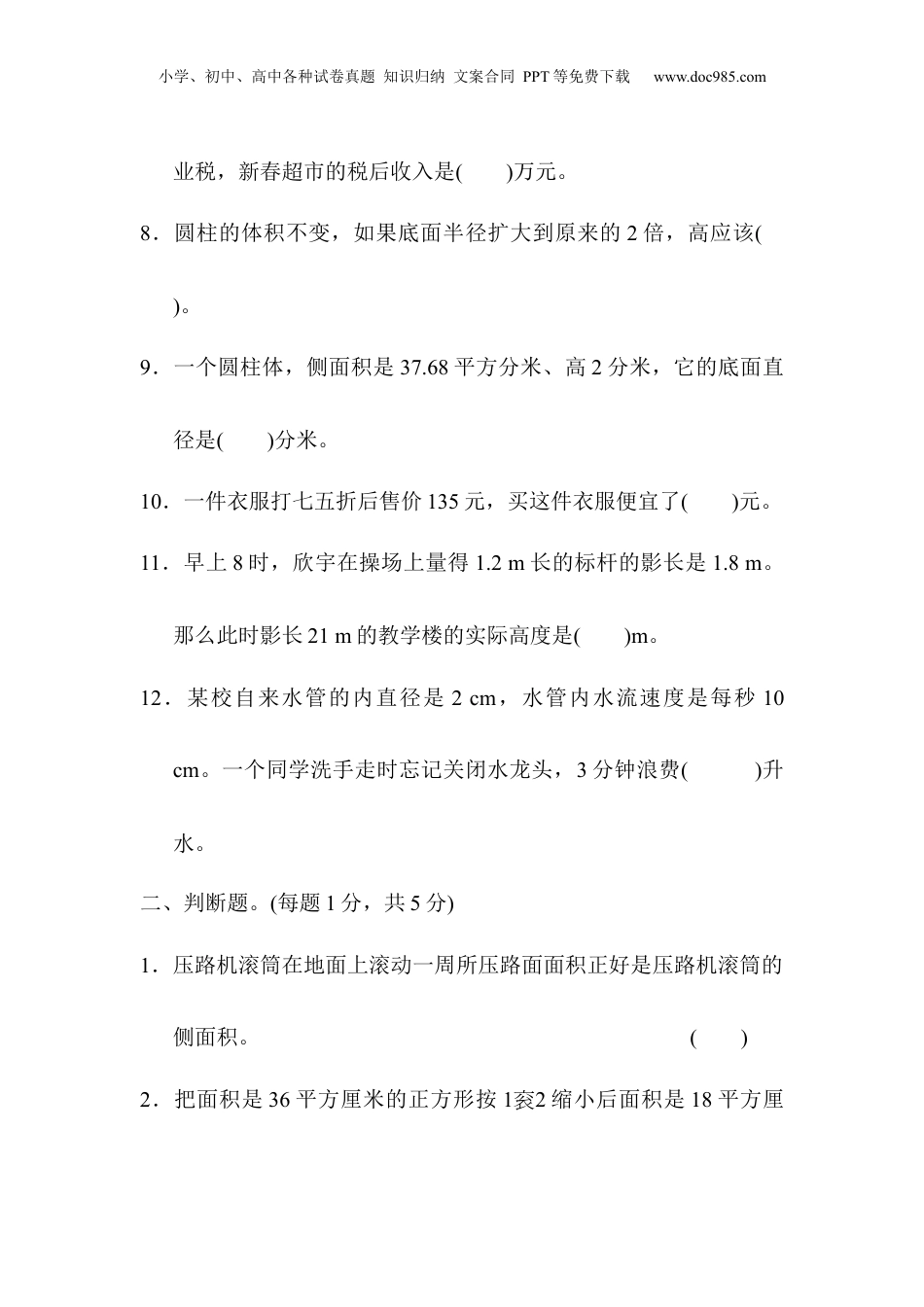 小学、初中、高中各种试卷真题知识归纳文案合同PPT等免费下载www.doc985.com六年第二期期中卷级学数学测试一、填空题。(每题2分,共24分)1.()÷20==30()=()%=()折2.如果用+5表示电梯上升了5层,那么-3表示()。3.线段比例尺,改写成数值比例尺是(),北京到上海的实际距离是1050km,在这幅地图上的距离是()cm。4.在4.5、18、9、2.25、36中选出四个数写成一个比例式()。5.在一个比例式中,两个外项的积是,其中一个内项是,则另一个内项是()。6.一个圆锥的底面半径是3厘米,体积为18.84立方厘米,这个圆锥的高是()厘米。7.新春超市九月份的营业额是6万元,如果按营业额的5%缴纳营小学、初中、高中各种试卷真题知识归纳文案合同PPT等免费下载www.doc985.com业税,新春超市的税后收入是()万元。8.圆柱的体积不变,如果底面半径扩大到原来的2倍,高应该()。9.一个圆柱体,侧面积是37.68平方分米、高2分米,它的底面直径是()分米。10.一件衣服打七五折后售价135元,买这件衣服便宜了()元。11.早上8时,欣宇在操场上量得1.2m长的标杆的影长是1.8m。那么此时影长21m的教学楼的实际高度是()m。12.某校自来水管的内直径是2cm,水管内水流速度是每秒10cm。一个同学洗手走时忘记关闭水龙头,3分钟浪费()升水。二、判断题。(每题1分,共5分)1.压路机滚筒在地面上滚动一周所压路面面积正好是压路机滚筒的侧面积。()2.把面积是36平方厘米的正方形按12缩小后面积是18平方厘小学、初中、高中各种试卷真题知识归纳文案合同PPT等免费下载www.doc985.com米。()3.在0和-5之间只有4个负数。()4.图上距离越大,实际距离也越大。()5.某厂今年的产值是去年的130%,则今年的产值比去年增长三成。()三、选择题。(每题2分,共12分)1.一个圆柱的底面直径是10dm,高8dm,把它平均分成若干等份,拼成一个近似的长方体,表面积增加了()平方厘米。A.40B.60C.80D.1002.一袋精制大米包装上标有:净重(15±0.5)kg,表示它最轻是()kg。A.14.5B.15C.15.5D.163.某商品的标价是3000元,打八折出售后仍盈利100元,则该商小学、初中、高中各种试卷真题知识归纳文案合同PPT等免费下载www.doc985.com品进价是()元A.2100B.2050C.2300D.25004.长方体、圆锥和圆柱,它们的高和底面周长相等,则体积最大的是()。A.长方体B.圆锥C.圆柱D.无法确定5.关于0,下列说法正确的是()。A.0既不是正数也不是负数B.0是最小的数C.0既不是奇数也不是偶数D.0是正数6.比例尺不变,图上距离扩大2倍,实际距离()A.缩小到原来的B.扩大2倍C.不变D.无法确定四、计算题。(1题4分,2题12分,3题8分,4题4分,共28分)1.直接写得数。90×80%=×=小学、初中、高中各种试卷真题知识归纳文案合同PPT等免费下载www.doc985.com×÷×=3.14×6=4000×37.5%=96÷(1-90%)=+-+=3.14×62=2.怎样简便就怎样算。0.65×101-65%×+1.6÷÷×÷-÷×3.求未知数x。x-75%x=80%x-0.4×1.2=1.2小学、初中、高中各种试卷真题知识归纳文案合同PPT等免费下载www.doc985.com=0.5÷4x=4.列式计算。(1)一个数的是12,这个数的25%是多少?(2)比一个数多60%的数是8的,求这个数(用方程解)。小学、初中、高中各种试卷真题知识归纳文案合同PPT等免费下载www.doc985.com五、动手操作。(每题3分,共6分)1.(1)按31的比例画出三角形放大后的图形。(2)按12的比例画出平行四边形缩小后的图形。2.量一量小明家到车站、超市、少年宫的图上距离,再根据图上比例尺算出它们的实际距离。六、解决问题。(每题5分,共25分)1.下图中每小段表示1分米,小蜗牛刚开始的位置在“0”处。(1)小蜗牛从“0”向东行3分米后,它的位置记作+3分米,那么它从“0”向西行6分米后,它的位置记作()分米。小学、初中、高中各种试卷真题知识归纳文案合同PPT等免费下载www.doc985.com(2)如果小蜗牛的位置是+8分米,说明它从“0”向()行了()分米。(3)如果小蜗牛的位置是-2分米,说明它从“0”向()行了()分米。(4)如果小蜗牛先向东行了4分米,又向西行了8分米,这时它的位置是()分米。2.科技辅导员彭老师给种植园松土。如...