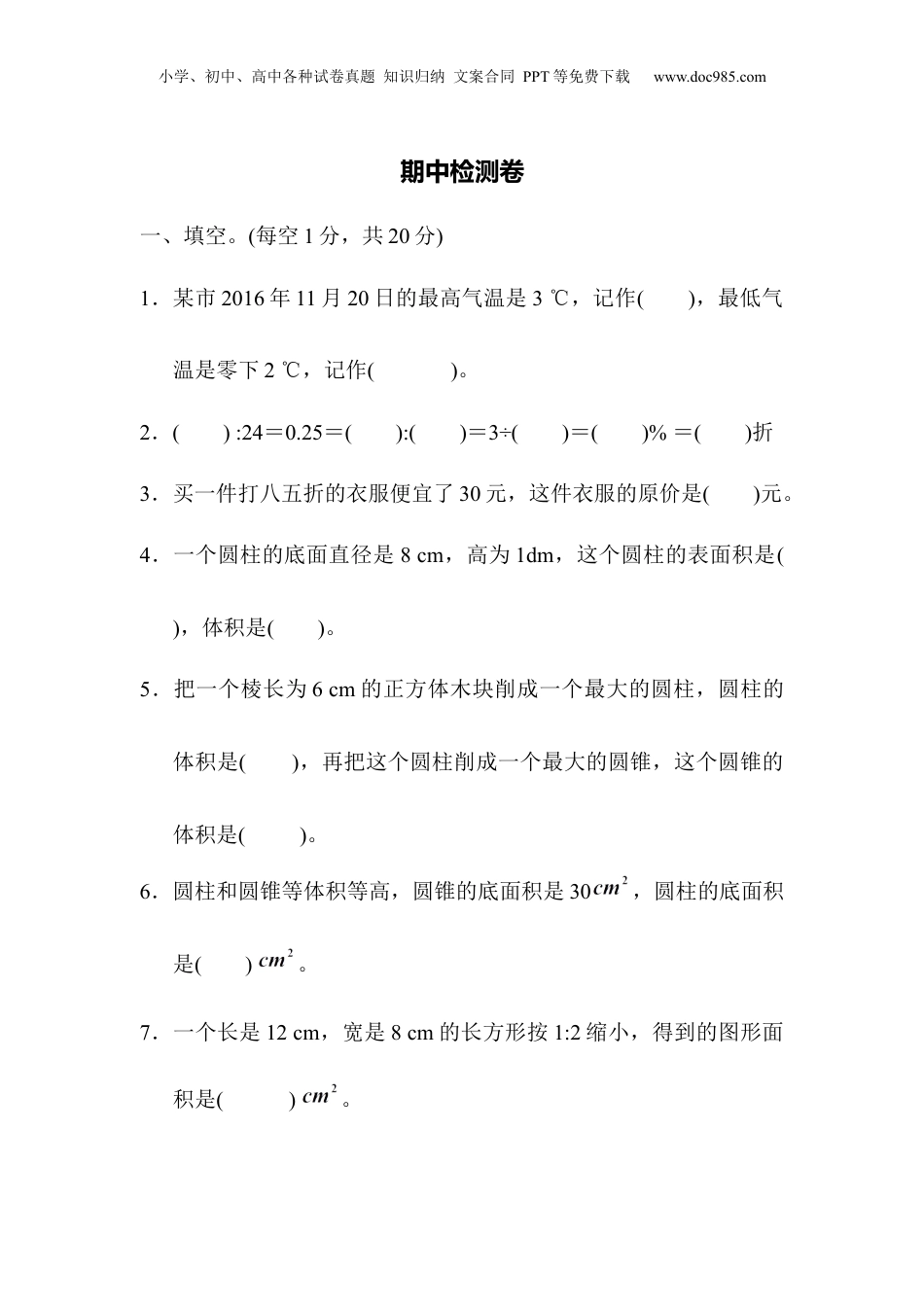 小学、初中、高中各种试卷真题知识归纳文案合同PPT等免费下载www.doc985.com期中检测卷一、填空。(每空1分,共20分)1.某市2016年11月20日的最高气温是3℃,记作(),最低气温是零下2℃,记作()。2.():24=0.25=():()=3÷()=()%=()折3.买一件打八五折的衣服便宜了30元,这件衣服的原价是()元。4.一个圆柱的底面直径是8cm,高为1dm,这个圆柱的表面积是(),体积是()。5.把一个棱长为6cm的正方体木块削成一个最大的圆柱,圆柱的体积是(),再把这个圆柱削成一个最大的圆锥,这个圆锥的体积是()。6.圆柱和圆锥等体积等高,圆锥的底面积是30,圆柱的底面积是()。7.一个长是12cm,宽是8cm的长方形按1:2缩小,得到的图形面积是()。小学、初中、高中各种试卷真题知识归纳文案合同PPT等免费下载www.doc985.com8.如果a×=b×2(b≠0),那么a:b=():()。9.图上距离8cm表示实际距离2mm,这幅地图的比例尺是()。10.如果x÷y=42÷3.5,那么x和y成()比例关系;如果m:1.2=1.5:n,那么m和n成()比例关系。二、判断。(对的画“√”,错的画“×”)(每题2分,共10分)1.正数和负数可以表示两种相反意义的量。()2.一种商品先提价10%,后又按九折出售,现价与原价相等。()3.圆柱的底面半径扩大到原来的2倍,高缩小到原来的,它的体积不变。()4.除数一定,被除数和商成正比例关系。()小学、初中、高中各种试卷真题知识归纳文案合同PPT等免费下载www.doc985.com5.圆锥的体积比与它等底等高的圆柱体积少。()三、选择。(将正确答案的字母填在括号里)(每题2分,共10分)1.()不是-4与-2之间的数。A.-3B.-2.5C.-1D.-3.52.妈妈买了一瓶香水花了240元,其中消费税为售价的25%,妈妈为此支付消费税()元。A.60B.192C.48D.1803.等底等高的圆柱、正方体、长方体相比,()。A.圆柱体积最大B.正方体体积最大C.长方体体积最大D.体积一样大4.在比例尺是1:6000000的地图上,量得南京到北京的图上距离是15cm,南京到北京的实际距离大约是()。A.800千米B.90千米C.900千米D.80千米小学、初中、高中各种试卷真题知识归纳文案合同PPT等免费下载www.doc985.com5.一个圆柱和一个圆锥的底面积相等,圆柱的高是圆锥高的2倍,则圆锥的体积是圆柱体积的()。A.B.C.D.2倍四、解比例。(12分)3:8=24:x=:=:x:=x:10五、计算下面图形的体积。(得数保留一位小数。单位:cm)(6分)小学、初中、高中各种试卷真题知识归纳文案合同PPT等免费下载www.doc985.com六、解决问题。(每题6分,共42分)1.小明家建了一个圆柱形沼气池,底面直径是4m,深2m。(1)将沼气池的内壁与下底面抹上水泥,抹水泥部分的面积是多少?(2)沼气池的容积是多少立方米?2.王叔叔将24000元存入银行,定期三年。到期时,王叔叔从银行取出本金和利息共27600元。王叔叔存款时的年利率是多少?3.百货大楼搞促销活动,甲品牌鞋满200元减100元,乙品牌鞋小学、初中、高中各种试卷真题知识归纳文案合同PPT等免费下载www.doc985.com“折上折”,就是先打六折,在此基础上再打九五折。现在两个品牌都有一双标价400元的鞋,哪个品牌的更便宜?4.把一个底面积是16dm2,高是6dm的圆柱形钢材熔铸成一个底面积是18dm2的圆锥,这个圆锥的高是多少分米?5.我国发射的人造地球卫星,在空中绕地球运行3周需要5.7小时。照这样计算,运行12周需要多少小时?(列比例解)6.在一幅比例尺是1:2000000的地图上,A城与B城的图上距离是27cm,一辆汽车从A城开往B城,每小时行驶90km,几小时可以到达?小学、初中、高中各种试卷真题知识归纳文案合同PPT等免费下载www.doc985.com7.一项工程,10人去做,12天刚好完成,如果每个人的工作效率不变,现在要提前4天完成,需要增加多少人?小学、初中、高中各种试卷真题知识归纳文案合同PPT等免费下载www.doc985.com答案一、1.3℃-2℃2.6141225二五(第2、3个空答案不唯一)3.2004.351.68502.45.169.5656.526.107.248.1659.40:110.正反二、1.√2.×3.×4.√5.√三、1.C2.A3.D4.C5.C四、x=64x=x=x=5五、8÷2=4(cm)3.14××12-×3.14××8≈468.9()六、1.(1)3.14×+3.14×4×2=37.68()小学、初中...