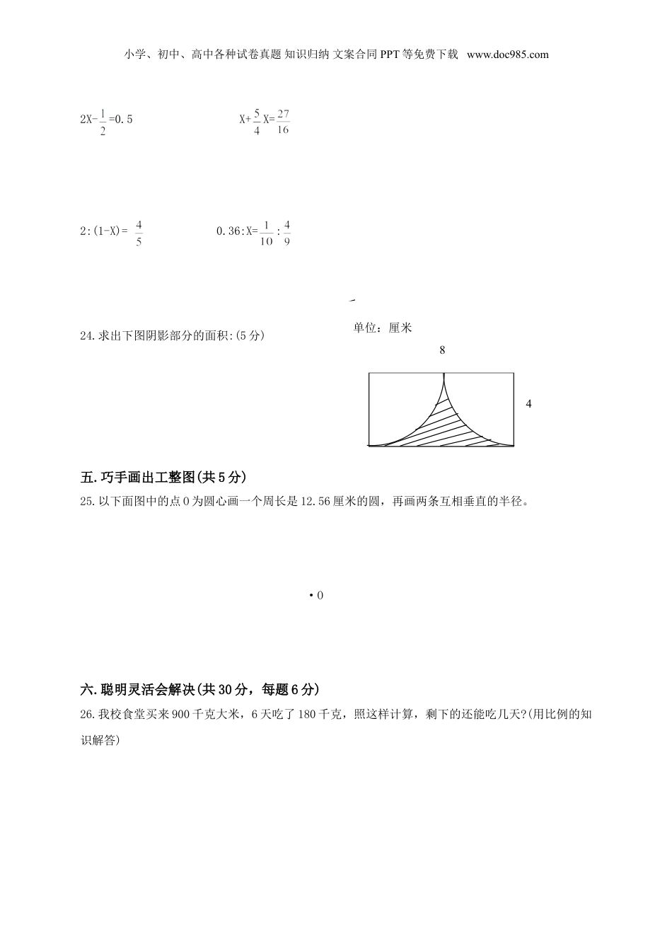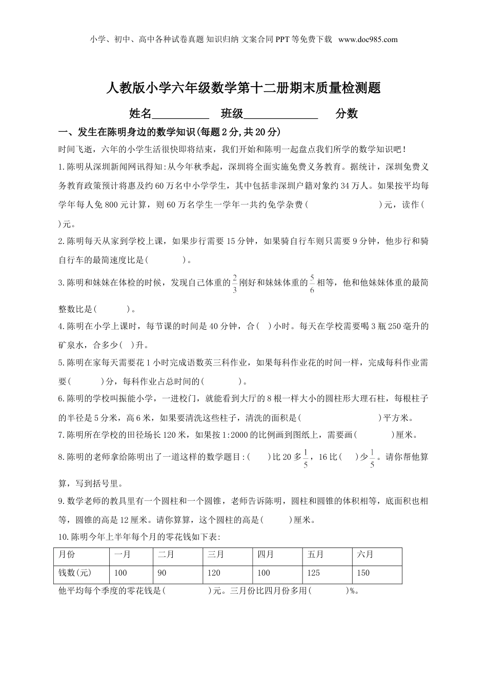 小学、初中、高中各种试卷真题知识归纳文案合同PPT等免费下载www.doc985.com人教版小学六年级数学第十二册期末质量检测题姓名班级分数一、发生在陈明身边的数学知识(每题2分,共20分)时间飞逝,六年的小学生活很快即将结束,我们开始和陈明一起盘点我们所学的数学知识吧!1.陈明从深圳新闻网讯得知:从今年秋季起,深圳将全面实施免费义务教育。据统计,深圳免费义务教育政策预计将惠及约60万名中小学学生,其中包括非深圳户籍对象约34万人。如果按平均每学年每人免800元计算,则60万名学生一学年一共约免学杂费()元,读作()元。2.陈明每天从家到学校上课,如果步行需要15分钟,如果骑自行车则只需要9分钟,他步行和骑自行车的最简速度比是()。3.陈明和妹妹在体检的时候,发现自己体重的刚好和妹妹体重的相等,他和他妹妹体重的最简整数比是()。4.陈明在小学上课时,每节课的时间是40分钟,合()小时。每天在学校需要喝3瓶250毫升的矿泉水,合多少()升。5.陈明在家每天需要花1小时完成语数英三科作业,如果每科作业花的时间一样,完成每科作业需要()分,每科作业占总时间的()。6.陈明的学校叫振能小学,一进校门,就能看到大厅的8根一样大小的圆柱形大理石柱,每根柱子的半径是5分米,高6米,如果要清洗这些柱子,清洗的面积是()平方米。7.陈明所在学校的田径场长120米,如果按1:2000的比例画到图纸上,需要画()厘米。8.陈明的老师拿给陈明出了一道这样的数学题目:()比20多,16比()少。请你帮他算算,写到括号里。9.数学老师的教具里有一个圆柱和一个圆锥,老师告诉陈明,圆柱和圆锥的体积相等,底面积也相等,圆锥的高是12厘米。请你算算,这个圆柱的高是()厘米。10.陈明今年上半年每个月的零花钱如下表:月份一月二月三月四月五月六月钱数(元)10090120100125150他平均每个季度的零花钱是()元。三月份比四月份多用()%。小学、初中、高中各种试卷真题知识归纳文案合同PPT等免费下载www.doc985.com二.火眼金睛辩正误(对的打“√”,错的打“X”,共10分)11.圆的周长和直径成正比例。()12.兴趣小组做发芽实验,浸泡了20粒种子,结果16课发芽了,发芽率是16%。()13.不相交的两条直线是平行线。()14.联合国在调查200个国家中,发现缺水的国家有100个,严重缺水的国家有40个,严重缺水的国家占调查国家的40%。()15.一个半圆的半径是r,它的周长是(π+2)r。()三.心灵眼快妙选择(把正确的答案序号写到括号里,共12分)16.在学过的统计图中,要表示数量增减变化的情况,()统计图最好。A.条形B.扇形C.折线17.在1—10的自然数中,质数有()个。A.3B.4C.5D.618.数学课本的封面面积大约是()。A.30平方厘米B.3平方分米C.0.3平方米D.3分米19.右图是日本三菱汽车的标志,这个标志有()条对称轴。A.1B.2C.3D.420.与相等的分数()。A.只有一个B.只有两个C.有无数个D.没有21.两根同样长的绳子,第一根截去它的,第二根截去米,余下的部分()。A.第一根长B.第二根长C.同样长D.无法比较四.神机妙算技巧高(共23分)22.怎样计算简单就怎样算:(6分,每题3分)(-)÷0.5×2.5×12.5×6423.求未知数X:(共12分,每题3分)小学、初中、高中各种试卷真题知识归纳文案合同PPT等免费下载www.doc985.com2X-=0.5X+X=2:(1-X)=0.36:X=:24.求出下图阴影部分的面积:(5分)五.巧手画出工整图(共5分)25.以下面图中的点O为圆心画一个周长是12.56厘米的圆,再画两条互相垂直的半径。·O六.聪明灵活会解决(共30分,每题6分)26.我校食堂买来900千克大米,6天吃了180千克,照这样计算,剩下的还能吃几天?(用比例的知识解答)84单位:厘米小学、初中、高中各种试卷真题知识归纳文案合同PPT等免费下载www.doc985.com27.我校在“创建绿色循环经济示范单位”活动中,打算在生物园新挖一个直径是6米,深12分米的圆形水池。(1)这个水池的占地面积是多少?(2)如果这个水池修好后,需要用水泥把池底和侧壁粉刷,粉刷的面积有多大?28.惊悉我国南方6省遭遇百年难遇的雪灾后,我校师生踊跃捐款,六年某班女生捐款数占全班的40%多160元,男生捐款数是女生捐款数的,这个班一共为灾区捐款多少元?29.学校把一个堆成底面直径是2米,高5米的圆锥形沙子,填铺到一...
