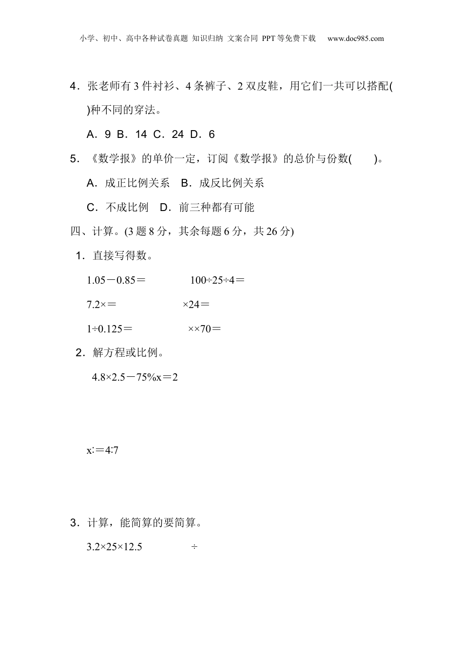 小学、初中、高中各种试卷真题知识归纳文案合同PPT等免费下载www.doc985.com毕业会考模拟检测卷(2)一、填空。(3题2分,其余每空1分,共20分)1.=()÷10=24∶()==()%=()(填小数)2.18的因数中,既是偶数又是质数的是(),既是奇数又是合数的是()。3.把0.18、、18.8%、0.1818这四个数按从小到大的顺序排列是()。4.36m增加它的后是()m。36m减少m后是()m。5.一幅地图的线段比例尺是,改写成数值比例尺是(),在这幅地图上量得A地到B地的距离是4.2cm,A地到B地的实际距离是()km。6.一个三角形,三个内角的度数比为1∶4∶5,这是一个()三角形。7.6个点可以连成()条线段。8.六(1)班有45名同学,至少有()名同学在同一个月过生日。9.的分数单位是(),再添()个这样的分数单位就是最小的质数。10.一个布袋中有2个黄球,3个白球,5个红球。如果每次从布袋中取出一个球,摸到()球的可能性最小,至少摸出()个小学、初中、高中各种试卷真题知识归纳文案合同PPT等免费下载www.doc985.com球才能保证摸到2个同色球。二、判断。(对的画“√”,错的画“×”)(每题2分,共10分)1.周长相等的两个圆,面积也相等。()2.甲比乙多,则乙比甲少。()3.三个连续自然数的和一定是3的倍数。()4.100克水中放入10克盐,盐占盐水的10%。()5.2.5÷0.7=25÷7=3……4()三、选择。(把正确答案的序号填在括号里)(每题2分,共10分)1.某校有将近50人参加“楚才杯”作文竞赛,其中有的人获得一等奖,的人获得二等奖,的人获得三等奖,其余的人获得优秀奖,该校可能有()人参加作文竞赛。A.36B.48C.47D.492.要使是假分数,是真分数,x应该是()。A.11B.10C.9D.123.用大小相同的小正方体摆成的物体,从正面看是,从上面看是,从左面看是()。小学、初中、高中各种试卷真题知识归纳文案合同PPT等免费下载www.doc985.com4.张老师有3件衬衫、4条裤子、2双皮鞋,用它们一共可以搭配()种不同的穿法。A.9B.14C.24D.65.《数学报》的单价一定,订阅《数学报》的总价与份数()。A.成正比例关系B.成反比例关系C.不成比例D.前三种都有可能四、计算。(3题8分,其余每题6分,共26分)1.直接写得数。1.05-0.85=100÷25÷4=7.2×=×24=1÷0.125=××70=2.解方程或比例。4.8×2.5-75%x=2x∶=47∶3.计算,能简算的要简算。3.2×25×12.5÷小学、初中、高中各种试卷真题知识归纳文案合同PPT等免费下载www.doc985.com96×3.28×37+6.4×32.8-328×1%4.计算下面立体图形的体积。(单位:cm)五、动手操作。(每题3分,共9分)1.把图1先向下平移6格,再向右平移6格,画出平移后的图形。2.把图2绕A点逆时针旋转90°。3.图3是一个轴对称图形的一半,请画出另一半。小学、初中、高中各种试卷真题知识归纳文案合同PPT等免费下载www.doc985.com六、解决问题。(每题5分,共25分)1.印刷厂装订一种练习本。(用比例解)2.食堂有一些大米,第一周吃掉了总数的35%,第二周吃掉了180kg,这时剩下的大米与吃了的大米一样多,食堂原来有大米多少千克?3.一群猴子分桃子吃,如果每只猴子吃5个,还剩7个;如果每只猴子吃7个,就少5个。这群猴子一共有多少只?(用方程解)4.一个正方体容器的棱长为4cm,装满水后倒入另一个深6cm的圆锥形容器中,刚好倒满,则圆锥形容器的底面积为多少平方厘米?(容器的厚度均忽略不计)小学、初中、高中各种试卷真题知识归纳文案合同PPT等免费下载www.doc985.com5.某电脑专卖店开展促销活动,降价12%。在此基础上,商场又返还售价6%的现金。此时在专卖店买电脑,相当于降价了百分之几?小学、初中、高中各种试卷真题知识归纳文案合同PPT等免费下载www.doc985.com答案一、1.1220181201.22.293.0.1818<18.8%<0.18<4.63355.10506.直角7.158.49.1010.黄4二、1.√2.×3.√4.×5.×三、1.B2.B3.A4.C5.A四、1.0.214.5208122.x=x=3.原式=4×25×0.8×12.5=100×10=1000原式=÷=÷=原式=(95+1)×=89+=89原式=3.28×(37+64-1)=3.28×100小学、初中、高中各种试卷真题知识归纳文案合同PPT等免费下载www.doc985.com=3284.3.14××6×=100.48(cm3)五、略六、1.解:设装订30本共用纸x张。60020∶=x∶30x=9002.180÷(-35%)=1200(kg)3.解:设这群猴子一共有x只。5x+7=7x-5x=64.4×4×4×3÷6=32(cm2)5.1-(1-12%)×(1-6%)=17.28%