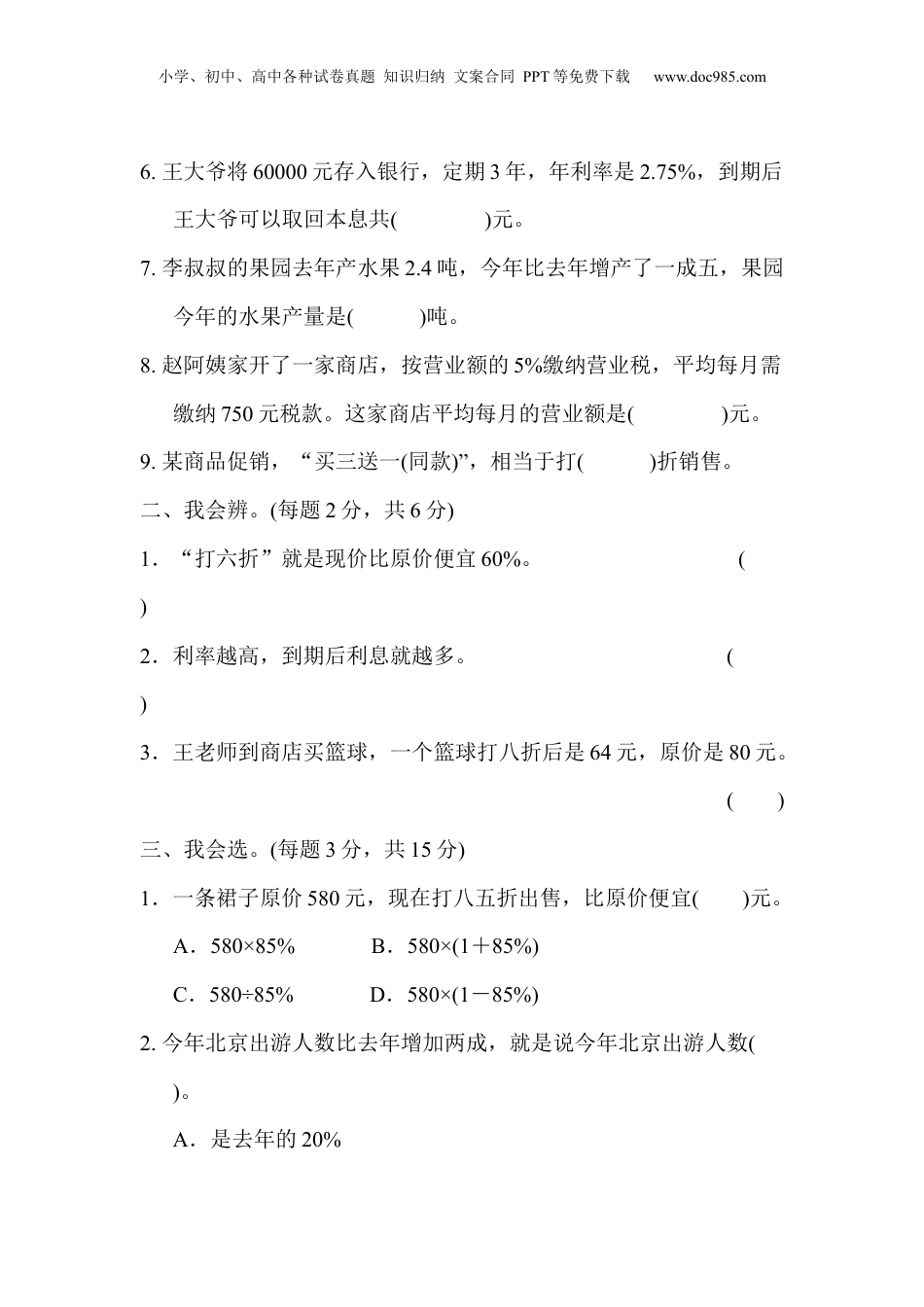 小学、初中、高中各种试卷真题知识归纳文案合同PPT等免费下载www.doc985.com周测培优卷百分数(二)的应用能力检测卷一、我会填。(每空2分,共28分)1.缴纳的税款叫做(),()与各种收入(销售额、营业额……)的比率叫做()。2.8000的10%是(),60减少15%是()。3.今年稻谷产量是去年的120%,今年稻谷产量比去年增产()成。4.算出下面各商品打折后的价钱。九折:______八五折:______5.根据打折后的价格算出各物品的原价。原价:______原价:______小学、初中、高中各种试卷真题知识归纳文案合同PPT等免费下载www.doc985.com6.王大爷将60000元存入银行,定期3年,年利率是2.75%,到期后王大爷可以取回本息共()元。7.李叔叔的果园去年产水果2.4吨,今年比去年增产了一成五,果园今年的水果产量是()吨。8.赵阿姨家开了一家商店,按营业额的5%缴纳营业税,平均每月需缴纳750元税款。这家商店平均每月的营业额是()元。9.某商品促销,“买三送一(同款)”,相当于打()折销售。二、我会辨。(每题2分,共6分)1.“打六折”就是现价比原价便宜60%。()2.利率越高,到期后利息就越多。()3.王老师到商店买篮球,一个篮球打八折后是64元,原价是80元。()三、我会选。(每题3分,共15分)1.一条裙子原价580元,现在打八五折出售,比原价便宜()元。A.580×85%B.580×(1+85%)C.580÷85%D.580×(1-85%)2.今年北京出游人数比去年增加两成,就是说今年北京出游人数()。A.是去年的20%小学、初中、高中各种试卷真题知识归纳文案合同PPT等免费下载www.doc985.comB.是去年的80%C.是去年的102%D.是去年的120%3.张叔叔买了一套总价180万元的商品房,按规定缴纳1.5%的契税那么张叔叔应缴纳契税()元。A.270B.2700C.27000D.2700004.爷爷购买了年利率是4.5%的国库券3000元,定期3年,3年后到期可取出()元。A.3405B.3135C.135D.4055.一个保温杯的价格是100元,打八折销售,买两个这样的保温杯比原来便宜()元。A.20B.80C.40D.160四、计算挑战。(共12分)1.口算。(每题1分,共4分)12×0.4=45÷58=0.2÷20%=10÷10%=2.解方程。(每题4分,共8分)49+40%x=89120%x-x=0.8五、走进生活,解决问题。(1题7分,其余每题8分,共39分)1.小学、初中、高中各种试卷真题知识归纳文案合同PPT等免费下载www.doc985.com这架玩具飞机原价多少元?2.买三支洁面乳,需要付多少元?3.2017年8月,小红的妈妈将4000元钱存入银行,定期三年,年利率为2.75%,三年到期后,准备用这笔钱购买下面的电脑,钱够吗?小学、初中、高中各种试卷真题知识归纳文案合同PPT等免费下载www.doc985.com4.实际缴纳房款多少万元?需要缴纳契税多少元?5.李阿姨购置了一辆汽车,一共花了10.38万元,含祼车价格和增值税,增值税是祼车价格的17%。这辆汽车的祼车价格是多少元?(得数保留整数)小学、初中、高中各种试卷真题知识归纳文案合同PPT等免费下载www.doc985.com答案一、1.应纳税额应纳税额税率2.800513.二4.4500元646元5.2000元2500元6.649507.2.768.150009.七五二、1.×2.×3.√三、1.D2.D3.C4.A5.C[点拨]关注重要条件“买两个”。四、1.0.27211002.49+40%x=89120%x-x=0.8解:0.4x=40解:1.2x-x=0.8x=1000.2x=0.8x=4五、1.5.7÷(1-85%)=38(元)答:这架玩具飞机原价38元。2.59×70%×3=123.9(元)答:需要付123.9元。3.4000+4000×3×2.75%=4330(元)4330<4350答:钱不够。4.46×96%=44.16(万元)=441600(元)441600×1.5%=6624(元)答:实际缴纳房款44.16万元,需要缴纳契税6624元。5.10.38万元=103800元103800÷(1+17%)≈88718(元)答:这辆汽车的裸车价格约是88718元。