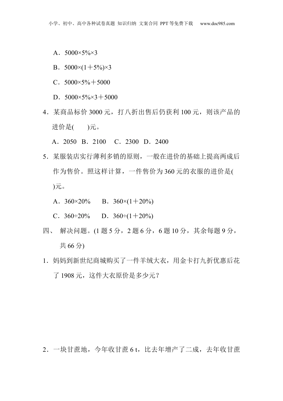 小学、初中、高中各种试卷真题知识归纳文案合同PPT等免费下载www.doc985.com第二单元过关检测卷一、填空。(每空1分,共14分)1.八五折=()%65%=()折二成五=()%40%=()成2.一个足球标价180元,按标价的九折出售,这个足球卖()元;一把雨伞打八折后售价是40元,原价是()元。3.某旅游景点2016年五一期间接待游客240万人次,比2015年同期增长了二成,2015年接待游客()人次。4.利民超市某月的营业额是64万元,按营业额的5%缴纳营业税,这个月该超市要缴纳营业税()元。5.蓉蓉将2000元压岁钱存入银行一年,年利率是3.00%,到期时她可得到利息()元。6.张老师出版一本书获得稿费3800元,其中800元是免税的,其余部分应缴纳14%的个人所得税,张老师实际得到()元。7.商场搞“每满100元减20元”促销活动,一件衣服标价450元,优惠后需付()元。8.金凯乐服装专卖店的一款上衣打八折销售,结果比原来便宜45元,这款上衣的原价是()元。9.胡阿姨准备买一部手机,原价3500元,现手机专卖店打八折优惠,在此基础上再享受5%的优惠,她买这部手机实际要付()元。小学、初中、高中各种试卷真题知识归纳文案合同PPT等免费下载www.doc985.com10.一件商品的成本是150元,按成本提高20%标价,然后打九折出售,这件商品的售价是()元。二、判断。(对的画“√”,错的画“×”)(每题2分,共10分)1.商品打五折就是按原价的50%出售。()2.“增加二成”与“打二折”表示的意义相同。()3.一种商品先打九折,再提价10%,仍是原价。()4.存入银行的本金越多,到期后得到的利息就越多。()5.一家保险公司去年的营业额是6.2亿元,如果按营业额的5%缴纳营业税,该保险公司去年应缴纳营业税0.31亿元。()三、选择。(将正确答案的字母填在括号里)(每题2分,共10分)1.妈妈按八五折的优惠价格买了5张游乐园门票(价格相同),一共用了340元,每张游乐园门票的原价是()元。A.68B.400C.80D.57.82.六(2)班有四成的学生是女生,那么男生占全班人数的()。A.23B.40%C.35D.五成3.小王买了5000元的国家建设债券,定期3年,年利率5%,到期时,他能取回多少钱?下面列式正确的是()。小学、初中、高中各种试卷真题知识归纳文案合同PPT等免费下载www.doc985.comA.5000×5%×3B.5000×(1+5%)×3C.5000×5%+5000D.5000×5%×3+50004.某商品标价3000元,打八折出售后仍获利100元,则该产品的进价是()元。A.2050B.2100C.2300D.24005.某服装店实行薄利多销的原则,一般在进价的基础上提高两成后作为售价。照这样计算,一件售价为360元的衣服的进价是()元。A.360×20%B.360×(1+20%)C.360÷20%D.360÷(1+20%)四、解决问题。(1题5分,2题6分,6题10分,其余每题9分,共66分)1.妈妈到新世纪商城购买了一件羊绒大衣,用金卡打九折优惠后花了1908元,这件大衣原价是多少元?2.一块甘蔗地,今年收甘蔗6t,比去年增产了二成,去年收甘蔗小学、初中、高中各种试卷真题知识归纳文案合同PPT等免费下载www.doc985.com多少吨?3.小兰家买了一套普通住房,房子的售价为80万元,如果一次性付清房款就有九五折的优惠价,买房还需要缴纳实际房价的1.5%的契税。小兰家这次买房若选择一次性付清房款,共需付多少钱?4.妈妈把8000元存入银行,定期5年,如果年利率按3%计算,到期后从银行可以取回多少元?小学、初中、高中各种试卷真题知识归纳文案合同PPT等免费下载www.doc985.com5.2016年春,育才小学有学生2145人,比2015年秋增长了-2.5%,2015年秋育才小学有学生多少人?6.某品牌电脑五一期间开展促销活动,甲商场按“每满1000元减100元”的方式促销;乙商场打九折销售。爸爸准备买一台标价是3200元的该品牌电脑。(1)在甲、乙两个商场买各应付多少元?小学、初中、高中各种试卷真题知识归纳文案合同PPT等免费下载www.doc985.com(2)去哪个商场买更省钱?7.某品牌西服,打七折销售赔80元,打八折销售赚100元,这种西服的进价是多少元?8.一个商店购进每支成本为0.6元的圆珠笔800支,按获利50%定价,当出售80%后,剩下的按照售价的七折出售,这个商店共获利多少元?小学、初中、高中各种试卷真题知识归纳文案合同PPT...