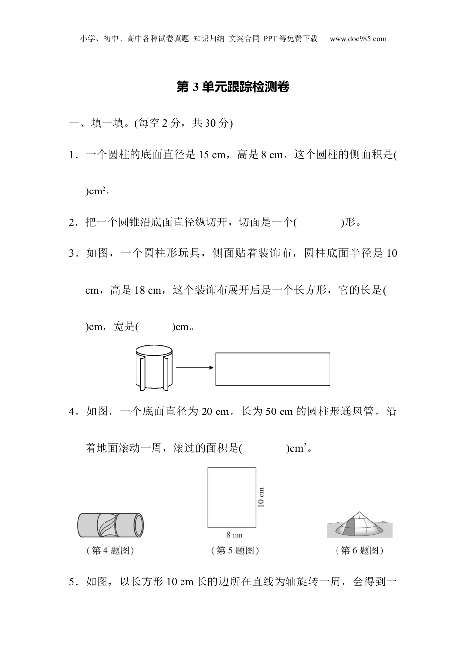 小学、初中、高中各种试卷真题知识归纳文案合同PPT等免费下载www.doc985.com第3单元跟踪检测卷一、填一填。(每空2分,共30分)1.一个圆柱的底面直径是15cm,高是8cm,这个圆柱的侧面积是()cm2。2.把一个圆锥沿底面直径纵切开,切面是一个()形。3.如图,一个圆柱形玩具,侧面贴着装饰布,圆柱底面半径是10cm,高是18cm,这个装饰布展开后是一个长方形,它的长是()cm,宽是()cm。4.如图,一个底面直径为20cm,长为50cm的圆柱形通风管,沿着地面滚动一周,滚过的面积是()cm2。5.如图,以长方形10cm长的边所在直线为轴旋转一周,会得到一小学、初中、高中各种试卷真题知识归纳文案合同PPT等免费下载www.doc985.com个(),它的表面积是()cm2,体积是()cm3。6.一个近似于圆锥形状的野营帐篷(如上图所示),它的底面半径是3米,高是2.4米。帐篷的占地面积是()平方米,所容纳的空间是()。7.如图是一个直角三角形,以6cm长的直角边所在直线为轴旋转一周,所得到的图形是(),它的体积是()cm3。8.上图是一个用纸板做成的圆柱形的蛋糕盒,底面半径是10厘米,高是12厘米。用彩带包扎这个蛋糕盒,至少需要彩带()厘米。(打结处大约用20厘米彩带)9.一个圆柱和一个圆锥等底等高,如果圆柱比圆锥的体积多42dm3,那么圆柱的体积是(),圆锥的体积是()。小学、初中、高中各种试卷真题知识归纳文案合同PPT等免费下载www.doc985.com二、辨一辨。(对的画“√”,错的画“×”)(每题2分,共10分)1.圆锥的体积比圆柱的体积少。()2.圆锥的底面积不变,高扩大为原来的6倍,则体积扩大为原来的2倍。()3.圆柱的侧面展开图一定是长方形。()4.圆柱的底面直径是3cm,高是9.42cm,它的侧面沿高展开后是一个正方形。()5.圆柱有无数条高,而圆锥只有一条高。()三、选一选。(把正确答案的序号填在括号里)(每题2分,共10分)1.如果把圆柱的底面半径和高都扩大为原来的2倍,则它的体积将扩大为原来的()。A.2倍B.4倍C.6倍D.8倍2.做一个无盖的圆柱形水桶,求至少需要多少铁皮,就是求水桶的()。A.底面积B.侧面积C.侧面积+两个底面积D.侧面积+一个底面积小学、初中、高中各种试卷真题知识归纳文案合同PPT等免费下载www.doc985.com3.一根圆柱形木料,底面半径是6dm,高是4dm,把这根木料沿底面直径锯成两个相等的半圆柱,表面积比原来增加()dm2。A.226.08B.24C.48D.964.一个圆柱的底面半径是5dm,若高增加2dm,则侧面积增加()dm2。A.20B.31.4C.62.8D.109.95.图中圆锥的体积与圆柱()的体积相等。四、我会按要求正确解答。(每题6分,共18分)1.求下图中圆柱的表面积。小学、初中、高中各种试卷真题知识归纳文案合同PPT等免费下载www.doc985.com2.你会求它的体积吗?3.求下图中空心圆柱的体积。(单位:cm)五、走进生活,解决问题。(4、5题每题7分,其余每题6分,共32分)1.下图的“博士帽”是用卡纸做成的(帽穗除外),上面是边长为30cm的正方形,下面是底面直径是18cm、高是8cm的无盖无底的小学、初中、高中各种试卷真题知识归纳文案合同PPT等免费下载www.doc985.com圆柱。制作100顶这样的“博士帽”,至少需要卡纸多少平方分米?2.牧民搭起的蒙古包如图所示,这个蒙古包的体积是多少立方米?小学、初中、高中各种试卷真题知识归纳文案合同PPT等免费下载www.doc985.com3.一根圆柱形木材长30dm,底面直径是4dm,分成3个相等的圆柱后,表面积增加了多少平方分米?4.葡萄酒瓶内装酒的高度正好等于圆锥形高脚酒杯的高度(如图),小学、初中、高中各种试卷真题知识归纳文案合同PPT等免费下载www.doc985.com已知酒瓶底面内直径是8cm,高脚酒杯上口内直径也是8cm,如果把酒瓶中的葡萄酒全部倒入高脚酒杯中,可以满倒几杯?5.如图,一个奶瓶深30cm,从里面量得底面直径是10cm,瓶里奶深15cm,把瓶口塞紧后,使其瓶口向下倒立,这时奶深25cm,奶瓶的容积是多少毫升?小学、初中、高中各种试卷真题知识归纳文案合同PPT等免费下载www.doc985.com答案一、1.376.82.等腰三角3.62.8184.31405.圆柱904.322009.6[点拨]旋转之后,8cm成为了圆柱的底面半径。6.28.2622.608立方米[点拨]别忘了带单位。7.圆锥2...