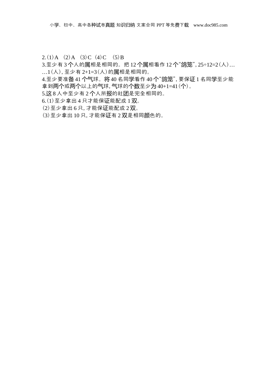 小、初中、高中各卷知文案合同学种试真题识归纳PPT等免下费载www.doc985.com第五元卷单检测1.我。会填(1)10001只子鸽飞进500中个鸽笼,无论怎样飞,有一里至少总个鸽笼飞进()只子。鸽(2)从7抽中拿出个屉22苹果个,无拿论怎样,有一抽中至少拿出了总个屉()苹果。个(3)有4不同花色的手套双,至少要拿出()只,才能保有只手套是一证两。双(4)盒子里有同大小的、、、黑四色的球各样红蓝黄种颜10个,要想摸出的球一定有4是相同色的个颜,至少要摸出()球。个(5)有同大小的、、三色的珠子各样红黄蓝种颜10颗,放在一布袋里。一个次摸出10颗,有一色的珠子不少于总会种颜()。一次摸出颗12颗,至少会有()色。种颜(6)6小的同栽。个组学树2.我。会选(正确答案的序在括里将号填号)(1)14同中个学,一定有()人是在同一月出生的。个A.2B.3C.4(2)把4小球放在个3口袋里个,至少有一口袋里装了个()小球。个A.2B.3C.4(3)5同分一些个学书,其中至少有一同分到了个学5本。些至少有书这书()本。A.25B.26C.21(4)在一副扑克牌中取出大小王,剩余的从52牌中至少要抽出张()张,才能保其中有证3桃。张红A.9B.13C.42(5)5只小被装鸡进2个鸡笼,有一至少有总个鸡笼()只小。鸡A.2B.3C.43.任意的25人中个,至少有几人的相是相同的个属?什为么?小、初中、高中各卷知文案合同学种试真题识归纳PPT等免下费载www.doc985.com4.六(1)班有40名同表演目学节,老他准了一些球师为们备气,至少要准备多少球个气,才能保至少有一同能拿到或以上的球证个学两个两个气?什为么?5.校成立了音、舞蹈、剪社学乐纸团,第一小有组8名同了三社学报这个团中的一或几。那个个么,这8人中至少有几人所的社是完全相同的个个报团?6.有黑、、三色的手套各红蓝种颜10只混在了一起,些手套只要只这两颜色相同,即可配成一。双(1)把眼睛蒙上,至少要拿出几只才能保能配成证1双?(2)至少要拿出几只,才能保能配成证2双?(3)至少要拿出几只,才能保有证2是相同色的双颜?考答案参1.(1)21(2)4(3)5(4)13(5)42(6)25小、初中、高中各卷知文案合同学种试真题识归纳PPT等免下费载www.doc985.com2.(1)A(2)A(3)C(4)C(5)B3.至少有3人的相是相同的。把个属12相看作个属12“”个鸽笼,25÷12=2(人)……1(人),至少有2+1=3(人)的相是相同的。属4.至少要准备41球。个气将40名同看作学40“”个鸽笼,要保证1名同至少能学拿到或以上的球两个两个气,球的至少气个数为40+1=41(个)。5.这8人中至少有2人所的社是完全相同的。个报团6.(1)至少拿出4只才能保能配成证1。双(2)至少拿出6只,才能保能配成证2。双(3)至少拿出10只,才能保有证2是相同色的。双颜