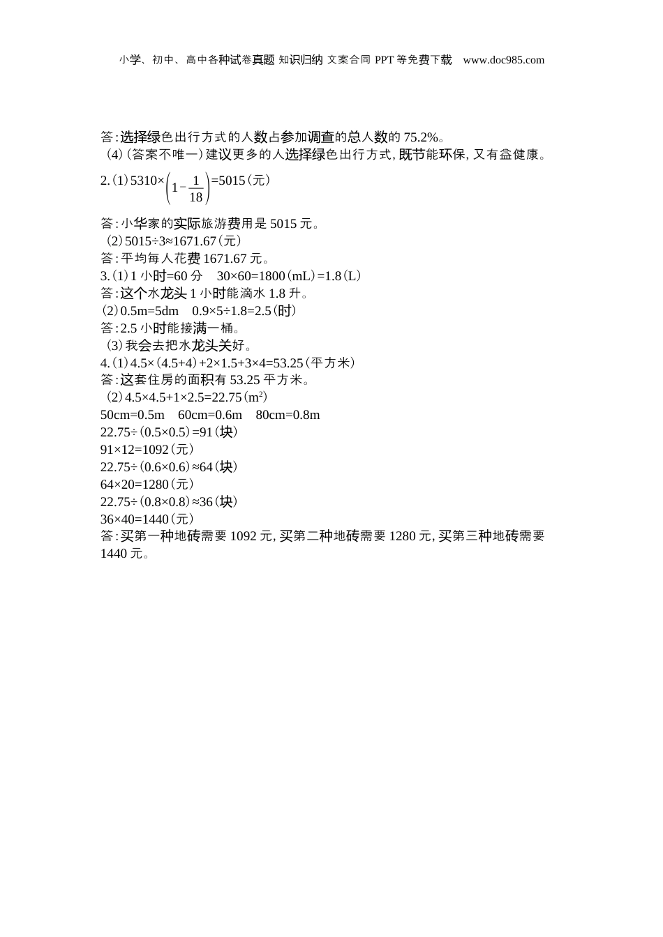 小、初中、高中各卷知文案合同学种试真题识归纳PPT等免下费载www.doc985.com合卷(综与实践检测2)1.洋本班同及家的交通出行方式行了、整理刘对学长进调查,制了绘统计表。(1)用选()、()和()这3交通出行方式于色出行。种属绿(2)加的生中参调查学,色出行方式的人占生人的百分之几选择绿数学总数?(百分前保留一位小号数)(3)加的全部人中参调查员,色出行方式的人占加人的选择绿数参调查总数百分之几?(百分前保留一位小号数)(4)看了表这份统计,有什好的建你么议?2.暑假里,李一家三口按加了“北京五日游”。束后华计划参结,李算了华计一下,旅游用比算的实际费预5310元省了节118。(1)小家的旅游用是多少元华实际费?(2)平均每人花多少费钱?(得保留位小数两数)3.某位的一水有完全单个龙头没关闭,大每分滴水约钟30mL。小、初中、高中各卷知文案合同学种试真题识归纳PPT等免下费载www.doc985.com(1)水这个龙头1小能滴水多少升时?(2)用底面是积0.9dm2、高是0.5m的水桶接水,多能接一桶长时间满?(3)如果遇到水在滴水的情你这种龙头况,理你会怎样处?4.王老家新了一套住房师买,其平面如下所示。图图(位单:米)(1)算一算请你,套住房的面有多少平方米这积?(2)王老要客地面上地师给厅铺砖,他看了三地种砖,忙算算三请你帮买这种地分需要多少。砖别钱考答案参1.(1)步行自行公交车车(2)(6+2+17)÷(6+10+2+17)≈0.714=71.4%答:加的生中色出行方式的人占生人的参调查学选择绿数学总数71.4%。(3)(30+14+35)÷(30+26+14+35)≈0.752=75.2%小、初中、高中各卷知文案合同学种试真题识归纳PPT等免下费载www.doc985.com答:色出行方式的人占加的人的选择绿数参调查总数75.2%。(4)(答案不唯一)建更多的人色出行方式议选择绿,能保既节环,又有益健康。2.(1)5310×(1-118)=5015(元)答:小家的旅游用是华实际费5015元。(2)5015÷3≈1671.67(元)答:平均每人花费1671.67元。3.(1)1小时=60分30×60=1800(mL)=1.8(L)答:水这个龙头1小能滴水时1.8升。(2)0.5m=5dm0.9×5÷1.8=2.5(时)答:2.5小能接一桶。时满(3)我去把水好。会龙头关4.(1)4.5×(4.5+4)+2×1.5+3×4=53.25(平方米)答:套住房的面有这积53.25平方米。(2)4.5×4.5+1×2.5=22.75(m2)50cm=0.5m60cm=0.6m80cm=0.8m22.75÷(0.5×0.5)=91(块)91×12=1092(元)22.75÷(0.6×0.6)≈64(块)64×20=1280(元)22.75÷(0.8×0.8)≈36(块)36×40=1440(元)答:第一地需要买种砖1092元,第二地需要买种砖1280元,第三地需要买种砖1440元。