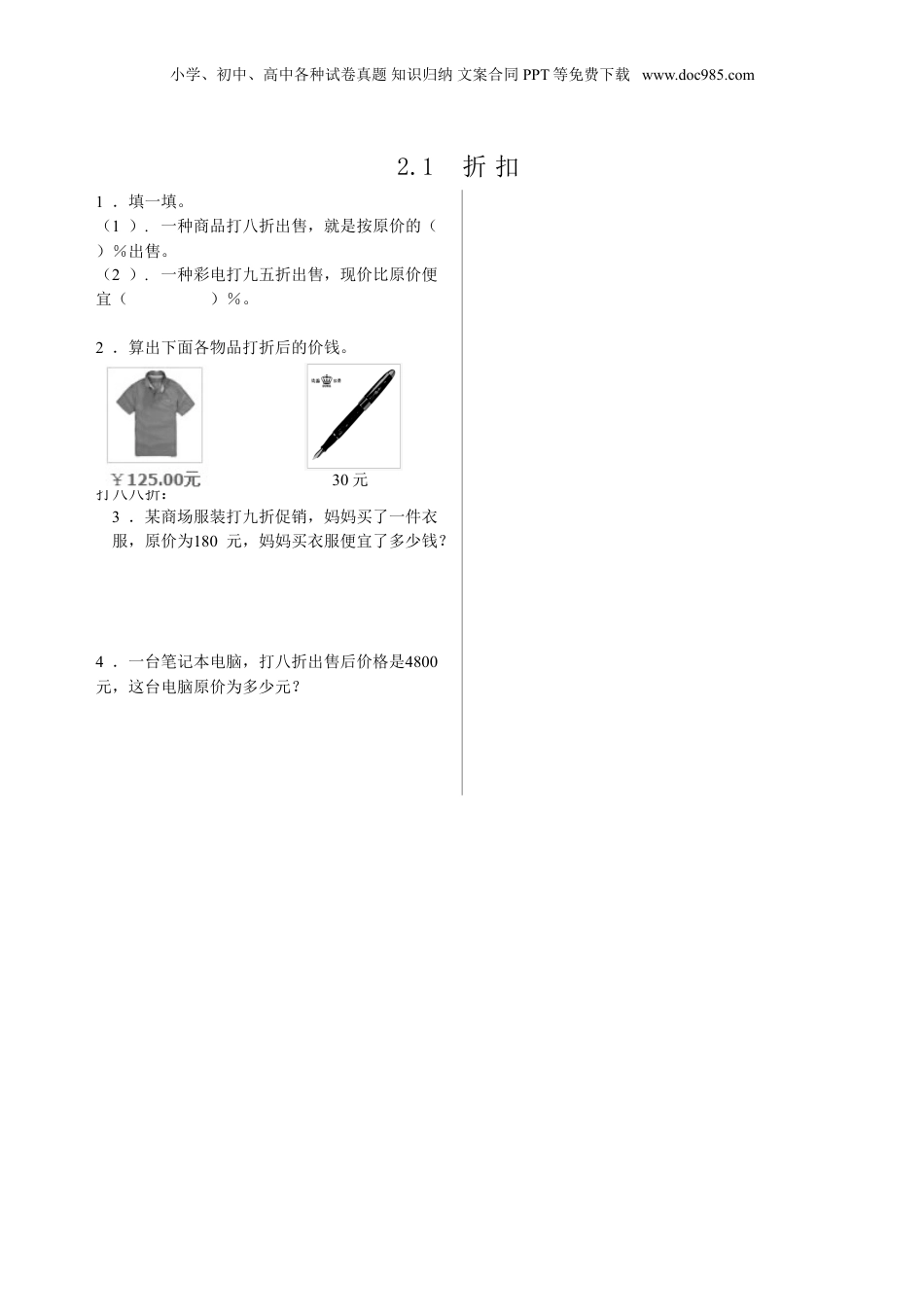 小学、初中、高中各种试卷真题知识归纳文案合同PPT等免费下载www.doc985.com2.1折扣1.填一填。(1).一种商品打八折出售,就是按原价的()%出售。(2).一种彩电打九五折出售,现价比原价便宜()%。2.算出下面各物品打折后的价钱。打五折:打八八折:3.某商场服装打九折促销,妈妈买了一件衣服,原价为180元,妈妈买衣服便宜了多少钱?4.一台笔记本电脑,打八折出售后价格是4800元,这台电脑原价为多少元?30元小学、初中、高中各种试卷真题知识归纳文案合同PPT等免费下载www.doc985.com答案:1.(1)80(2)52.125×50%=62.5(元)30×88%=26.4(元)3.180-180×90%=18(元)4.(2)4800÷80%=6000(元)