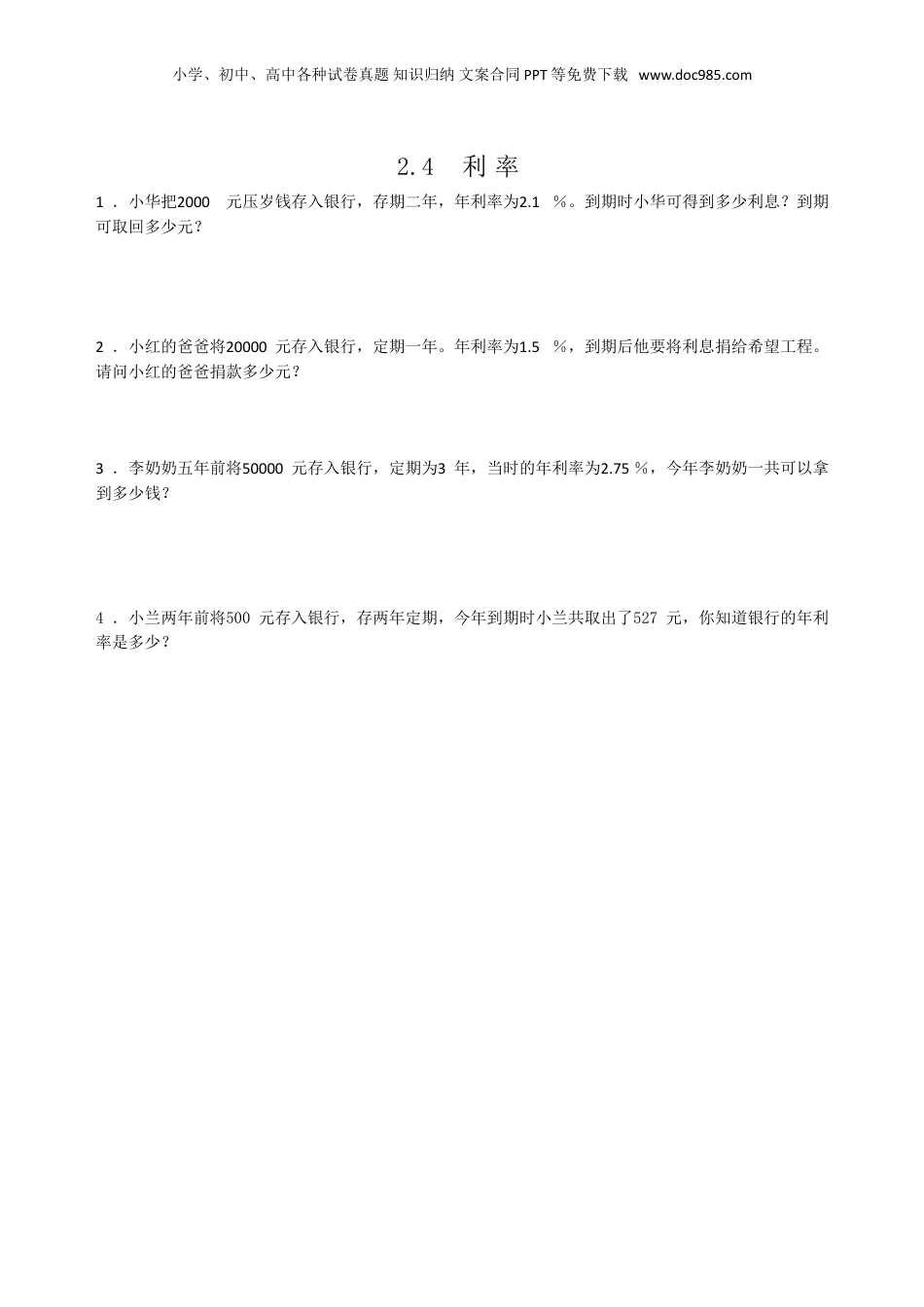 小学、初中、高中各种试卷真题知识归纳文案合同PPT等免费下载www.doc985.com2.4利率1.小华把2000元压岁钱存入银行,存期二年,年利率为2.1%。到期时小华可得到多少利息?到期可取回多少元?2.小红的爸爸将20000元存入银行,定期一年。年利率为1.5%,到期后他要将利息捐给希望工程。请问小红的爸爸捐款多少元?3.李奶奶五年前将50000元存入银行,定期为3年,当时的年利率为2.75%,今年李奶奶一共可以拿到多少钱?4.小兰两年前将500元存入银行,存两年定期,今年到期时小兰共取出了527元,你知道银行的年利率是多少?小学、初中、高中各种试卷真题知识归纳文案合同PPT等免费下载www.doc985.com答案:1.2000×2.1%×2=84(元)2000+84=2084(元)2.20000×1.5%×1=300(元)3.50000×(1+2.75%×3)=54125(元)4.(527-500)÷2÷500×100%=2.7%