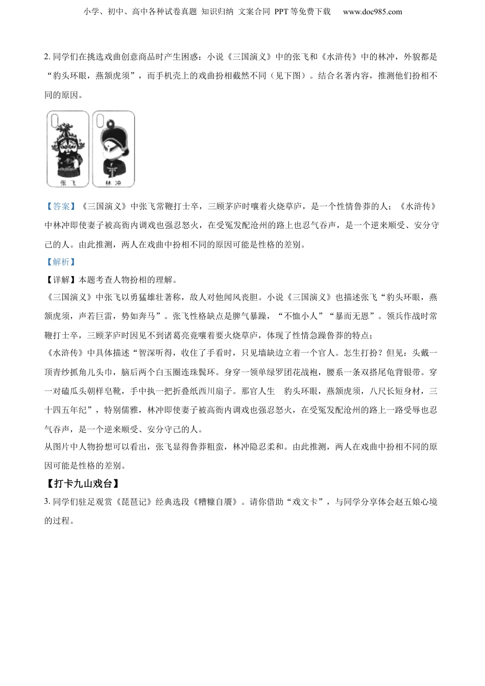 小学、初中、高中各种试卷真题知识归纳文案合同PPT等免费下载www.doc985.com2023年浙江省温州市中考语文试题一、温州“九山书会·大宋戏仓”是中国首个集戏曲文化、游园体验为一体的戏曲生活市集,定期推出系列文化活动。请你作为戏曲推广人,与同学一起去打卡。(38分)【打卡戏文大道】1.同学们漫步在悬挂着戏文灯带的林荫大道,赏读戏文,浮想联翩。窗外日光弹指过,席前花影坐间移。“日光弹指过”让人想起《论语》中孔子的感慨:“(1)____________,____________。”惟愿取,年年此夜,人月双清。“人月双清”使人想起苏轼《水调歌头(明月几时有)》中“(2)____________,____________”的美好祝愿。湘浦鱼沉,衡阳雁断,音书要寄无方便。()这一意象,让人想起“(3)____________,____________”两句。【答案】①.逝者如斯夫②.不舍昼夜③.但愿人长久④.千里共婵娟⑤.示例1:(雁)⑥.乡书何处达⑦.归雁洛阳边示例2:(书)寄书长不达况乃未休兵【解析】【详解】本题考查名篇默写。解答此类题目,一是要透彻理解诗文内容,二是要认真审题,找出符合题意的句子,三是答题内容要准确,做到不添字、不漏字、不错字。理解性识记,注意结合语境填充。本题需要注意“逝、昼、婵娟”这几个字词的书写。第(3)题中,要注意根据不同的意象填写不同的诗句。示例:雁——征蓬出汉塞,归雁入胡天;书——书中自有黄金屋,书中自有颜如玉。【打卡主题市集】小学、初中、高中各种试卷真题知识归纳文案合同PPT等免费下载www.doc985.com2.同学们在挑选戏曲创意商品时产生困惑:小说《三国演义》中的张飞和《水浒传》中的林冲,外貌都是“豹头环眼,燕颔虎须”,而手机壳上的戏曲扮相截然不同(见下图)。结合名著内容,推测他们扮相不同的原因。【答案】《三国演义》中张飞常鞭打士卒,三顾茅庐时嚷着火烧草庐,是一个性情鲁莽的人;《水浒传》中林冲即使妻子被高衙内调戏也强忍怒火,在受冤发配沧州的路上也忍气吞声,是一个逆来顺受、安分守己的人。由此推测,两人在戏曲中扮相不同的原因可能是性格的差别。【解析】【详解】本题考查人物扮相的理解。《三国演义》中张飞以勇猛雄壮著称,敌人对他闻风丧胆。小说《三国演义》也描述张飞“豹头环眼,燕颔虎须,声若巨雷,势如奔马”。张飞性格缺点是脾气暴躁,“不恤小人”“暴而无恩”。领兵作战时常鞭打士卒,三顾茅庐时因见不到诸葛亮竟嚷着要火烧草庐,体现了性情急躁鲁莽的特点;《水浒传》中具体描述“智深听得,收住了手看时,只见墙缺边立着一个官人。怎生打扮?但见:头戴一顶青纱抓角儿头巾,脑后两个白玉圈连珠鬓环。身穿一领单绿罗团花战袍,腰系一条双搭尾龟背银带。穿一对磕瓜头朝样皂靴,手中执一把折叠纸西川扇子。那官人生的豹头环眼,燕颔虎须,八尺长短身材,三十四五年纪”,特别儒雅,林冲即使妻子被高衙内调戏也强忍怒火,在受冤发配沧州的路上一路受辱也忍气吞声,是一个逆来顺受、安分守己的人。从图片中人物扮想可以看出,张飞显得鲁莽粗蛮,林冲隐忍柔和。由此推测,两人在戏曲中扮相不同的原因可能是性格的差别。【打卡九山戏台】3.同学们驻足观赏《琵琶记》经典选段《糟糠自餍》。请你借助“戏文卡”,与同学分享体会赵五娘心境的过程。小学、初中、高中各种试卷真题知识归纳文案合同PPT等免费下载www.doc985.com戏文卡(赵五娘)唱词:滴溜溜难穷尽的珠泪,乱纷纷难宽解的愁绪。骨崖崖难扶持的病体,战钦钦难捱过的时和岁。这糠呵,我待不吃你,教奴怎忍饥?我待吃呵,怎吃得?(选自《元本琵琶记校注》)【剧情简介】蔡伯喈辞别新婚妻子赵五娘,进京赴试,远去三年杳无音讯。家乡连年旱灾,赵五娘把仅有的米饭给了公婆,自己吃糠,换来的却是婆婆的猜忌。【答案】示例1:丈夫“三年杳无音讯”,又遭受“连年旱灾”,赵五娘不得不吃糠度日,唱词中的两个反问句,表达赵五娘在这种艰难处境下吃糠与否的矛盾心理。结合她的生活和唱词,我强烈体会到她内心的悲苦辛酸。示例2:唱词中“滴溜溜”等ABB式叠词,让我仿佛感受到她声音中的柔弱与颤抖,从而体会她泪流不尽、心绪愁乱、体弱多病、荒年艰难的生命...
