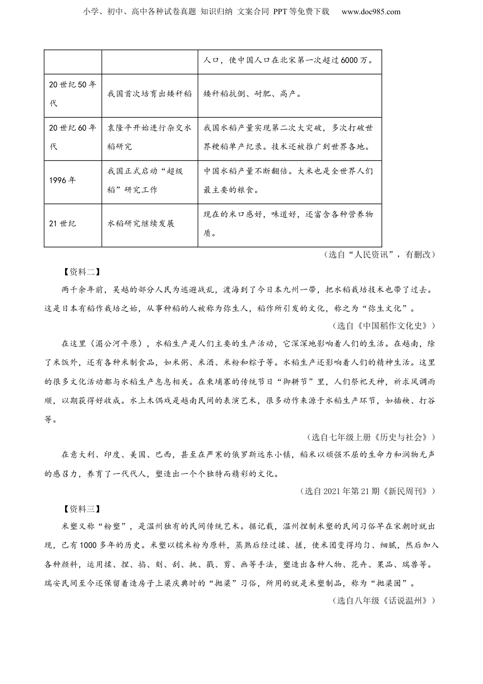 小学、初中、高中各种试卷真题知识归纳文案合同PPT等免费下载www.doc985.com2022年浙江省温州市中考语文真题一、在“身边的文化遗产”综合性学习活动中,班级举行“一米一世界”主题展览会,请你参与。开始筹备展览会啦!你可以借助任务后面的资料夹,完成任务。“一米一世界”主题展览会筹备说明目的传承稻作文化,弘扬节俭美德形式主题展览时间12月8日下午2点地点学校展览厅展区主题成果中国区一粒米的万年演变史展板世界区丰富多彩的世界稻作文化小视频体验区走进非物质文化遗产米塑设计海报1.宣传组为展览会设计了如下活动海报,请你参与讨论。同学:宣传组制作的海报将“种”“秋”“稠”“稚”“称”“秽”六个禾字旁的字设计成背景,与“米”呼应,真有创意!我:还真是这样。这几个字中,“(1)____”本义是指幼禾,“秋”为庄稼成熟。这两个字放在一起,就是米的“成长记”啊!但像“(2)____”这个字有点不雅,作为背景不太合适吧?同学:有道理。那换成什么字好呢?我:可不可以换成“(3)____”?它和“稠”正好是一对反义词。或者换成像“季”“(4)____”这些上下结构的字也可以。制作展板2.编辑组准备将“一粒米的万年演变史”制作成系列展板。请从下面两个阶段中任选一个,借助资料一,以“稻穗”的口吻撰写介绍词。(80字左右)小学、初中、高中各种试卷真题知识归纳文案合同PPT等免费下载www.doc985.com确定标语3.策划组准备为世界区挑选宣传标语,你会推荐下面哪一条?根据“筹备说明”和资料二,简述理由。A.一片田,一个国家,一种凝聚力。B.五洲四海一粒米,稻作文化万里传。邀请嘉宾4.外联组准备邀请家长参加体验区的亲子活动,跟着米塑传承人体验米塑工艺。根据要求,借助资料,代表班级给家长写一封邀请函。要求:(1)说明活动的背景、意义等相关信息;(2)120字左右;(3)不得出现人名、校名。预估效果5.以上筹备的内容能否达成展览会目的?根据“筹备说明”,借助资料,发表你的看法。资料夹【资料一】一粒米的万年演变史时间主要事件意义10000年前浙江浦江县上山遗址的先民驯化野生稻稻开始被人类种植,稻米成为重要食物。7000年—4000年前河姆渡遗址、良渚遗址中发现大量碳化稻米稻米已经成为当时人们的主要食物。后来由于我国南方洪涝灾害严重等原因,稻米的痕迹消失了很久。唐朝时期方便好用的曲辕犁出现使水稻在贫瘠的土地、山地都能播种,梯田也随之出现。南方越来越多的人开始种水稻宋朝时期优势明显的占城稻出现一年可以种两季,稻米产量的增加供养了更多小学、初中、高中各种试卷真题知识归纳文案合同PPT等免费下载www.doc985.com人口,使中国人口在北宋第一次超过6000万。20世纪50年代我国首次培育出矮秆稻矮秆稻抗倒、耐肥、高产。20世纪60年代袁隆平开始进行杂交水稻研究我国水稻产量实现第二次大突破,多次打破世界粳稻单产纪录。技术还被推广到世界各地。1996年我国正式启动“超级稻”研究工作中国水稻产量不断翻倍。大米也是全世界人们最主要的粮食。21世纪水稻研究继续发展现在的米口感好,味道好,还富含各种营养物质。(选自“人民资讯”,有删改)【资料二】两千余年前,吴越的部分人民为逃避战乱,渡海到了今日本九州一带,把水稻栽培技术也带了过去。这是日本有稻作栽培之始,从事种稻的人被称为弥生人,稻作所引发的文化,称之为“弥生文化”。(选自《中国稻作文化史》)在这里(湄公河平原),水稻生产是人们主要的生产活动,它深深地影响着人们的生活。在越南,除了米饭外,还有各种米制食品,如米粥、米酒、米粉和粽子等。水稻生产还影响着人们的精神生活。这里的很多文化活动都与水稻生产息息相关。在柬埔寨的传统节日“御耕节”里,人们祭祀天神,祈求风调雨顺,以期获得好收成。水上木偶戏是越南民间的表演艺术,很多动作来源于水稻生产环节,如插秧、打谷等。(选自七年级上册《历史与社会》)在意大利、印度、美国、巴西,甚至在严寒的俄罗斯远东小镇,稻米以顽强不屈的生命力和润物无声的感召力,养育了一代代人,塑造出一个个独特而精彩的文化。(选自2021年第21期《新民周刊》)【资料三】米塑又称“粉塑”,...