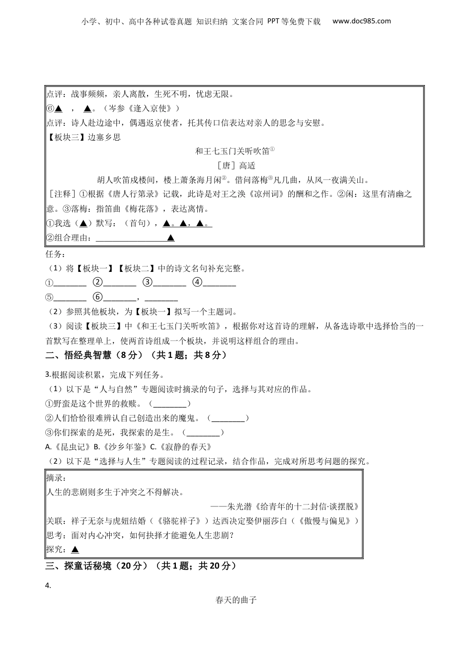 小学、初中、高中各种试卷真题知识归纳文案合同PPT等免费下载www.doc985.com浙江省温州市2021年中考语文真题试卷一、品古典之美(19分)(共2题;共19分)1.牛年说“牛”字。(1)甲骨文中“牛”是个象形字,下列哪个是“牛”字?()A.B.C.(2)不少汉字以“牛”为偏旁。如①“________(mù)”字,本义是手拿鞭子放牛;如②“________(lí)”字,是耕地用的农具;如“牢”字,本义是圈养牲畜的栏圈,成语③“________”(A.亡羊补牢B.画地为牢)里“牢”就是这个意思。(提示:③处从括号里选择一项,填序号即可)2.根据相关任务,完成整理单。[备选诗歌](甲)李白《春夜洛城闻笛》(首句:谁家玉笛暗飞声)(乙)李益《夜上受降城闻笛》(首句:回乐烽前沙似雪)战争类古诗词·主题整理单【板块一】▲八百里分麾下炙,五十弦翻塞外声,①▲。(辛弃疾《破阵子·为陈同甫赋壮词以寄之》)点评:写军营生活,展现了豪气满怀的将军形象。②▲,留取丹心照汗青。(文天祥《过零丁洋》)点评:诗人被俘之后,视死如归,诚如孟子所言“二者不可得兼,③▲④▲,铁马秋风大散关。(陆游《书愤》)点评:诗人追述征战生活,心系收复中原大业,有“三军可夺帅也,⑤▲”的豪情。【板块二】家书难达寄书长不达,况乃未休兵。(杜甫《月夜忆舍弟》)小学、初中、高中各种试卷真题知识归纳文案合同PPT等免费下载www.doc985.com点评:战事频频,亲人离散,生死不明,忧虑无限。⑥▲,▲。(岑参《逢入京使》)点评:诗人赴边途中,偶遇返京使者,托其传口信表达对亲人的思念与安慰。【板块三】边塞乡思和王七玉门关听吹笛①[唐]高适胡人吹笛戍楼间,楼上萧条海月闲②。借问落梅③凡几曲,从风一夜满关山。[注释]①根据《唐人行第录》记载,此诗是对王之涣《凉州词》的酬和之作。②闲:这里有清幽之意。③落梅:指笛曲《梅花落》,表达离情。①我选(▲)默写:(首句),▲。▲,▲。②组合理由:▲任务:(1)将【板块一】【板块二】中的诗文名句补充完整。①________②________③________④________⑤________⑥________,________(2)参照其他板块,为【板块一】拟写一个主题词。(3)阅读【板块三】中《和王七玉门关听吹笛》,根据你对这首诗的理解,从备选诗歌中选择恰当的一首默写在整理单上,使两首诗组成一个板块,并说明这样组合的理由。二、悟经典智慧(8分)(共1题;共8分)3.根据阅读积累,完成下列任务。(1)以下是“人与自然”专题阅读时摘录的句子,选择与其对应的作品。①野蛮是这个世界的救赎。(________)②人们恰恰很难辨认自己创造出来的魔鬼。(________)③你们探索的是死,我探索的是生。(________)A.《昆虫记》B.《沙乡年鉴》C.《寂静的春天》(2)以下是“选择与人生”专题阅读的过程记录,结合作品,完成对所思考问题的探究。摘录:人生的悲剧则多生于冲突之不得解决。——朱光潜《给青年的十二封信·谈摆脱》关联:祥子无奈与虎妞结婚(《骆驼祥子》)达西决定娶伊丽莎白(《傲慢与偏见》)思考:面对内心冲突,如何抉择才能避免人生悲剧?探究:▲三、探童话秘境(20分)(共1题;共20分)4.春天的曲子小学、初中、高中各种试卷真题知识归纳文案合同PPT等免费下载www.doc985.com[芬兰]托芙·扬松小嗅嗅沿着四月的田野,走了一天。太阳在桦树间红艳艳地照着,空气凉爽。他喜欢这些树木、这种天气和他自己。这样的傍晚,应该吹一首新曲子,一段歌唱期望,两段歌唱春天的忧伤,其余歌唱独行的乐趣。他有把握作成这首曲子,它已经等在那里,几乎酝酿成熟了。他东闻西嗅,要找个地方过夜。他找到了一个干树桩和一些干树枝,在小溪边生起旺旺的火堆。小嗅嗅一向自己做饭。他尽量避免给别人做饭,也不想吃别人做的饭。一只小爬虫坐在远远的树下看着小嗅嗅,露出害怕但充满好奇的眼神。一蓬头发下两只害羞的眼睛,就是那种从不受人注意的小人物的眼睛。小嗅嗅装作没看见。他拿出烟斗,点着了,等着他的春天的曲子到来。曲子没有到来。他只感到小爬虫在死死盯住他,充满佩服之意。他感到不自在了,拍拍爪子叫道:“嘘!走开!”小爬虫听了他的话,反而从...