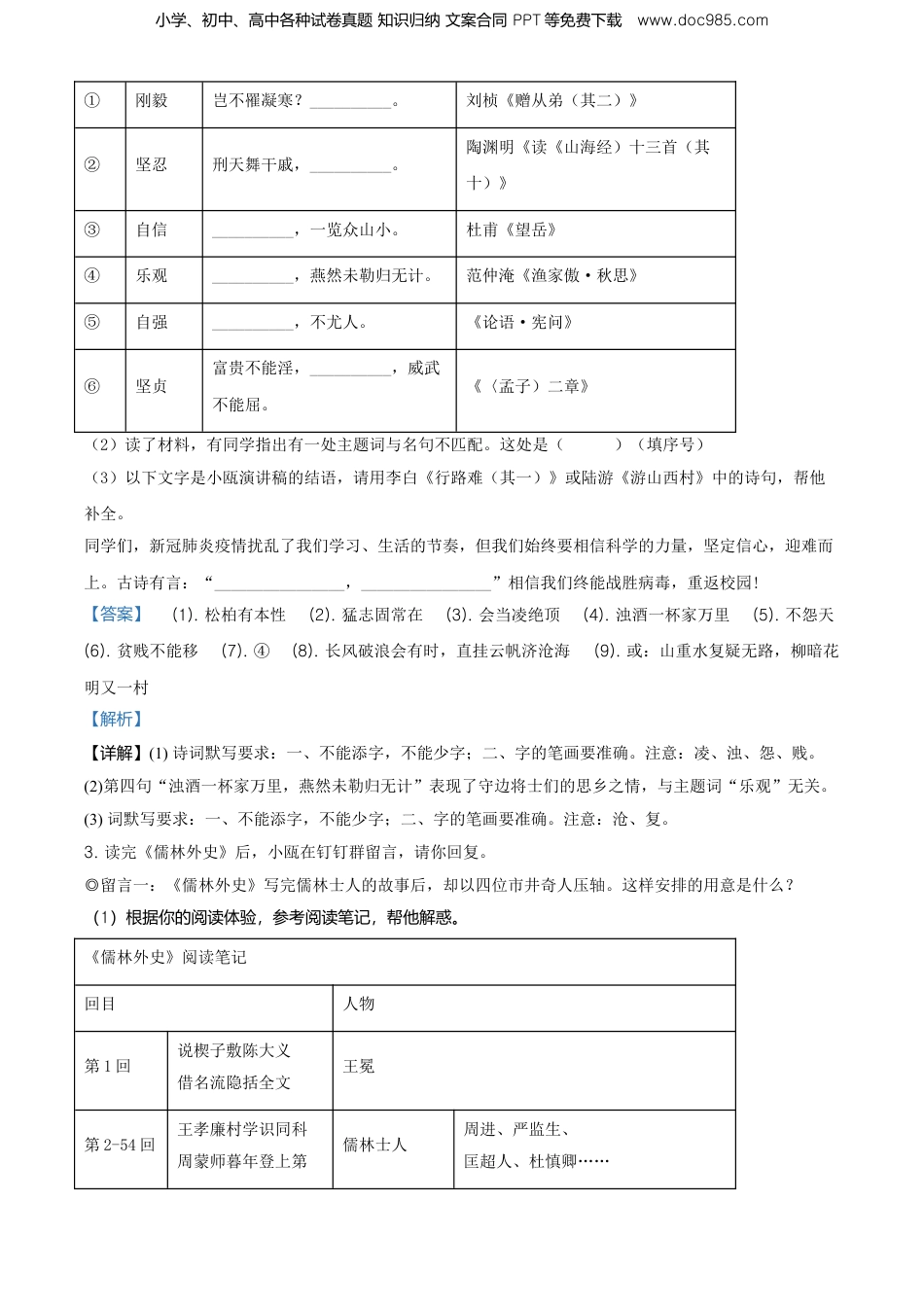 小学、初中、高中各种试卷真题知识归纳文案合同PPT等免费下载www.doc985.com2020年浙江省温州市中考试题语文一、重温线上学习(21分)1.“”“”汉字偏旁探源活动中,老师在钉钉群家校本发布了任务单,请你完成。“汉字偏旁探源”任务单偏旁汉字成语/名句(1)_______人迹~至罗(3)_______(2)_______学而不思则~◎我的发现:通过“汉字”栏的篆文字形,我明白了“”“”“”是汉字“(4)____”作偏旁时的不同形式。【答案】(1).罕(2).天罗地网(门可罗雀、星罗棋布等)(3).罔(4).网【解析】【详解】(1)根据后面的成语“人迹~至”可知这个字是“罕”。人迹罕至:人的足迹很少到达;指荒凉偏僻的地方。(2)含有“罗”字的成语有:星罗棋布、门可罗雀、包罗万象、自投罗网、天罗地网、万象森罗、罗钳吉网、星罗云布、罗织罪名等。(3)根据后面的名句“学而不思则~”可知这个字是“罔”。学而不思则罔:只是学习却不思考就会迷惑而无所得。(4)根据“汉字”一项中的三个汉字的篆文字形可知,这三个字的偏旁都是一个“网”字。2.在撰写题为《迎难而上共克时艰》的演讲稿时,小瓯想引用古诗文名句来丰富内容。他将整理的材料发到钉钉群,请你参与交流。(1)根据积累,帮他补全古诗文名句。序号主题词古诗文名句出处小学、初中、高中各种试卷真题知识归纳文案合同PPT等免费下载www.doc985.com①刚毅岂不罹凝寒?__________。刘桢《赠从弟(其二)》②坚忍刑天舞干戚,__________。陶渊明《读《山海经)十三首(其十)》③自信__________,一览众山小。杜甫《望岳》④乐观__________,燕然未勒归无计。范仲淹《渔家傲·秋思》⑤自强__________,不尤人。《论语·宪问》⑥坚贞富贵不能淫,__________,威武不能屈。《〈孟子)二章》(2)读了材料,有同学指出有一处主题词与名句不匹配。这处是()(填序号)(3)以下文字是小瓯演讲稿的结语,请用李白《行路难(其一)》或陆游《游山西村》中的诗句,帮他补全。同学们,新冠肺炎疫情扰乱了我们学习、生活的节奏,但我们始终要相信科学的力量,坚定信心,迎难而上。古诗有言:“________________,________________”相信我们终能战胜病毒,重返校园!【答案】(1).松柏有本性(2).猛志固常在(3).会当凌绝顶(4).浊酒一杯家万里(5).不怨天(6).贫贱不能移(7).④(8).长风破浪会有时,直挂云帆济沧海(9).或:山重水复疑无路,柳暗花明又一村【解析】【详解】(1)诗词默写要求:一、不能添字,不能少字;二、字的笔画要准确。注意:凌、浊、怨、贱。(2)第四句“浊酒一杯家万里,燕然未勒归无计”表现了守边将士们的思乡之情,与主题词“乐观”无关。(3)词默写要求:一、不能添字,不能少字;二、字的笔画要准确。注意:沧、复。3.读完《儒林外史》后,小瓯在钉钉群留言,请你回复。◎留言一:《儒林外史》写完儒林士人的故事后,却以四位市井奇人压轴。这样安排的用意是什么?(1)根据你的阅读体验,参考阅读笔记,帮他解惑。《儒林外史》阅读笔记回目人物第1回说楔子敷陈大义借名流隐括全文王冕第2-54回王孝廉村学识同科周蒙师暮年登上第儒林士人周进、严监生、匡超人、杜慎卿……小学、初中、高中各种试卷真题知识归纳文案合同PPT等免费下载www.doc985.com……第55-56回添四客述往思来弹一曲高山流水……市井奇人季遐年、王太、盖宽、荆元◎留言二:我还想读一本塑造病态读书人群像的讽刺小说,小伙伴们有推荐吗?(2)下列作品中,你认为最适合推荐的是()A.《世说新语》B.《镜花缘》C.《围城》D.《格列佛游记》【答案】(1)小说主体部分通过展现功名利禄对周进、匡超人等读书人灵魂的毒害,批判了荒谬举制度。在他们之后,作者以四位各怀才艺、淡泊名利的市井奇人作为压轴人物,与儒林鲜明对比,寄托了作者对理想社会的追求。这组人物与楔子中品行高洁的王冕呼应,更加突显了作者的这一追求。(2)C【解析】【详解】(1)周进是作者着力塑造的年纪老大而没有考中科举的可怜虫,是个腐儒的典型,在中举之前很穷困的,受尽别人的白眼和嘲讽。周进所受的种种屈辱做铺垫,揭示了其久不得志的心境,醉心功名而功名无望。匡超人本是一个淳朴的...