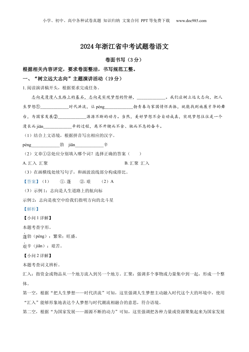 小学、初中、高中各种试卷真题知识归纳文案合同PPT等免费下载www.doc985.com2024年浙江省中考试题卷语文卷面书写(3分)根据相关内容评定,要求卷面整洁,书写规范工整。一、“树立远大志向”主题演讲活动(19分)1.阅读演讲稿开头,根据要求完成任务。志向是漫漫人生路上的基石,志向是实现梦想的阶梯,_____________。我们应树立远大志向,把人生梦想①_____________时代洪流,让péng_____________勃青春与家国情怀共振,就能找到施展才华的舞台,为国家发展②_____________源源不断的动力。当然,美好梦想不会自动成真,实现梦想往往是一个漫长而jiān_____________辛的过程,离不开锲而不舍、驰而不息的奋斗。(1)结合上文语境,根据拼音写出相应的汉字。péng_____________勃jiān_____________辛(2)文章①②处应分别填入哪个词?选择正确的答案()A.汇入汇聚B.汇聚汇入(3)在画横线处续写句子,和画波浪线部分构成排比。【答案】(1)①.蓬②.艰(2)A(3)示例1:志向是人生道路上的航向标示例2:志向是夜空中给我们指明方向的北斗星【解析】【小问1详解】本题考查字形。蓬勃(péng):繁荣;旺盛。艰辛(jiān):艰苦。【小问2详解】本题考查词义辨析。汇入:指资金或物品从一个地方流入到另一个地方。汇聚:强调多个事物或力量集中到一起,形成一个整体。第一空,根据“把人生梦想——时代洪流”可知,这里强调人生梦想主动融入时代这个大的环境中,使用“汇入”能够形象地表达个人梦想与时代潮流相融合的意思,符合语境。第二空,根据“为国家发展——源源不断的动力”可知,这里强调把各种力量或资源聚集起来为国家发展小学、初中、高中各种试卷真题知识归纳文案合同PPT等免费下载www.doc985.com提供动力。使用“汇聚”更合适。故选A。【小问3详解】本题考查仿写句子。画波浪线部分已经构成了两个排比句:“志向是漫漫人生路上的基石,志向是实现梦想的阶梯”。这两个句子都采用了“志向是……”的句式,并分别用“基石”和“阶梯”来比喻志向的重要性和作用。为了保持排比句式的一致性和韵律感,续写的句子也应该采用“志向是……”的句式,并选择一个与“基石”和“阶梯”相似且能够进一步强调志向作用的词语。示例:志向是攀登高峰的绳索。2.请为下面这副对联选择你认为最合适的下联()上联:各勉日新志下联:A.雅量涵高远B.星斗焕文章C.共证岁寒心D.云山起翰墨【答案】C【解析】【详解】本题考查对联。拟写对联时应注意:①字数相等;②词类相当;③结构相应;④平仄相对,仄起平收;⑤内容相关。各勉日新志:动词+偏正短语;表达的是每个人都要勉励自己,保持日新月异的志向和追求。A.名词+动宾短语,不合适;B.名词+动宾短语,不合适;C.动词+偏正短语,“心”是平声,结构符合,内容上表达共同经历艰难困苦,见证彼此的坚贞和忠诚,与上联的“日新志”相呼应,都体现了对坚韧不拔精神的追求。D.名词+动宾短语,不合适;故选C。3.根据段落的语境填写古诗文名句。志向有多高远,天地就有多辽阔。在《望岳》中,杜甫以“会当凌绝顶,①_____________”表达勇于攀登高峰的理想;在《过零丁洋》中,文天祥用“人生自古谁无死?②_____________”彰显舍生取义的气节;在《岳阳楼记》中,范仲淹以“③_____________,④_____________”抒写先忧后乐的抱负。【答案】①.一览众山小②.留取丹心照汗青③.先天下之忧而忧④.后天下之乐而乐【解析】【详解】本题考查名句默写。默写题作答时,一是要透彻理解诗文的内容;二是要认真审题,找出符合题小学、初中、高中各种试卷真题知识归纳文案合同PPT等免费下载www.doc985.com意的诗文句子;三是答题内容要准确,做到不添字、不漏字、不写错字。本题中的“览、汗青、忧”等字词容易写错。4.2024年6月2日,嫦娥六号登月,尽显中国航天科技的智慧与力量。请任选一项,结合所选诗文内容,写一段话致敬中国航天人。A.长风破浪会有时,直挂云帆济沧海B.但愿人长久,千里共婵娟C.抟扶摇而上者九万里【答案】示例1:中国航天人在科学探索的道路上永不停步,“长风破浪会有时,直挂云帆济沧海”正是航天人执着信念的写照。九天...