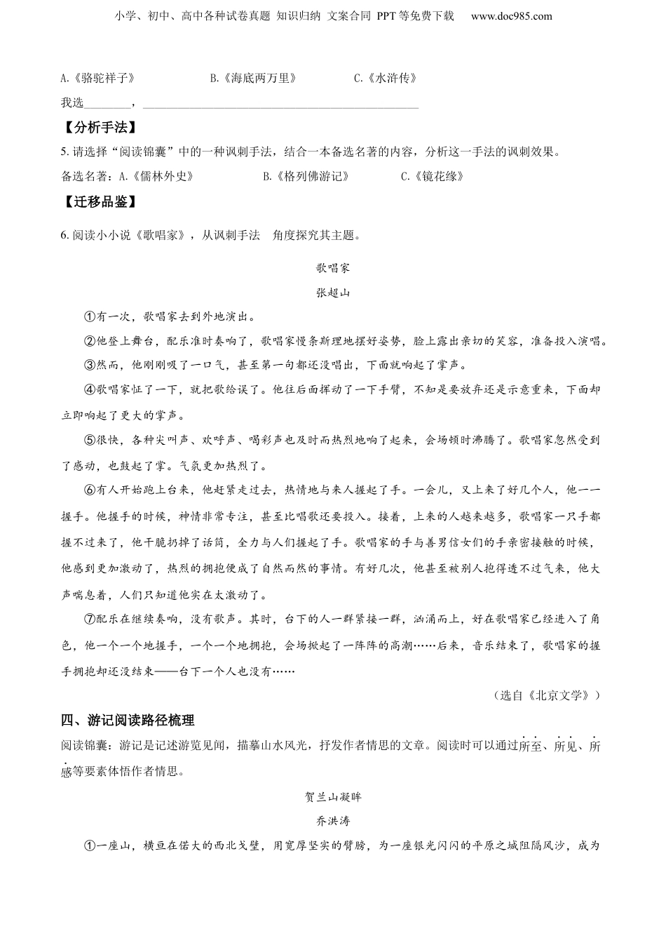 小学、初中、高中各种试卷真题知识归纳文案合同PPT等免费下载www.doc985.com语文试题卷亲爱的考生:欢迎参加考试!请你认真审题,仔细答题,发挥最佳水平。答题时,请注意以下几点:1.全卷共6页,19小题。满分150分,其中卷面书写5分。考试时间120分钟。2.答案必须写在答题纸相应的位置上,写在试题卷、草稿纸上无效。3.答题前,请认真阅读答题纸上的“注意事项”,按规定答题。4.要求书写规范、工整,保持卷面整洁。一、前言1.阅读“前言”,完成各题。三年的语文学习,是一段且行且歌的旅程。我们品读了古朴典(yǎ)____________的诗词、意蕴丰富的小说、各具风情的游记、真实生动的传记、客观鲜活的新闻……这些作品浸(rùn)____________着智慧,承载(A.zàiB.zǎi)着文化。子曰:“温故而知新,可以为师矣。”同学们,让我们梳理不同文体的阅读路径,走进异彩纷(chéng)____________的文本世界。(1)根据拼音写出相应的汉字。典(yǎ)____________浸(rùn)____________异彩纷(chéng)____________(2)给文中加点字“载”选择正确的读音()A.zàiB.zǎi二、古诗词阅读路径梳理阅读锦囊:古诗词是中国文化的瑰宝。阅读时可以从意象、典故、诗题、写作背景、直抒胸臆的词语等角度把握作者情感。2.古诗词填空。阅读古诗词,我们可以通过意象把握情感。如“征蓬出汉塞,(1)_______________”(王维《使至塞上》)中的“雁”带有飘零之感;“正莺儿啼,(2)_______________,蝶儿忙”(秦观《行香子》)中的“燕”带有愉悦之情;“(3)_______________,(4)_______________”(陶渊明《饮酒(其五)》)中的“菊”隐含归隐的闲适。阅读古诗词,我们可以通过直抒胸臆的词语把握情感。如“(5)_______________,绿杨阴里白沙堤”(《钱塘湖春行》)中的“爱”流露出白居易对早春西湖的喜爱;“(6)_______________,独怆然而涕下”(《登幽州台歌》)中的“怆然”表达了陈子昂生不逢时的感伤;“(7)_______________,小学、初中、高中各种试卷真题知识归纳文案合同PPT等免费下载www.doc985.com(8)_______________”(《闻王昌龄左迁龙标遥有此寄》)中的“愁”道出了李白对友人的同情与担忧。阅读古诗词,我们可以通过典故把握情感。“(9)_______________,何日遣冯唐”(《江城子·密州出猎》)中苏轼以魏尚自比,期盼得到朝廷重用;“(10)_______________,(11)_______________”(《渔家傲·秋思》)中范仲淹感慨无法像窦宪一样勒石燕然,表达自己功业未成的愁思。3.阅读下面古诗,补全对话。旅次石头岸〔唐〕张祜行行石头岸,身事两相违。旧国日边远,故人江上稀。水声寒不尽,山色暮相依。惆怅未成语,数行鸦又飞。小语:老师,我发现尾联中有一个直接表达情感的词语“(1)_______________”,还有一个意象“(2)_______________”,从中可以读出这首诗的情感。老师:是的。我们还可以通过诗题中“(3)_______________”一词知道诗人身处异乡。他想起“旧国”“故人”,流露出(4)_______________之情。小语:我不理解“身事两相违”这句诗。老师:这就需要了解作者的经历。张祜性格耿直,被他人排挤,最后无奈归隐,所以这句诗表达了作者怀才不遇的感慨。三、小说阅读路径梳理阅读锦囊:小说是虚构的故事。阅读时可以从情节、人物、环境、写作手法等角度探究小说主题。阅读讽刺小说还要关注夸张、对比和细节描写等讽刺手法。【概括情节】4.请从下面选项中任选一项,简述与插图相关的故事情节。小学、初中、高中各种试卷真题知识归纳文案合同PPT等免费下载www.doc985.comA.《骆驼祥子》B.《海底两万里》C.《水浒传》我选________,_______________________________________________【分析手法】5.请选择“阅读锦囊”中的一种讽刺手法,结合一本备选名著的内容,分析这一手法的讽刺效果。备选名著:A.《儒林外史》B.《格列佛游记》C.《镜花缘》【迁移品鉴】6.阅读小小说《歌唱家》,从讽刺手法的角度探究其主题。歌唱家张超山①有一次,歌唱家去到外地演出。②他登上舞台,配乐准时奏响了,歌唱家慢条斯理地摆好姿势,脸上露出亲切的笑容,准...
