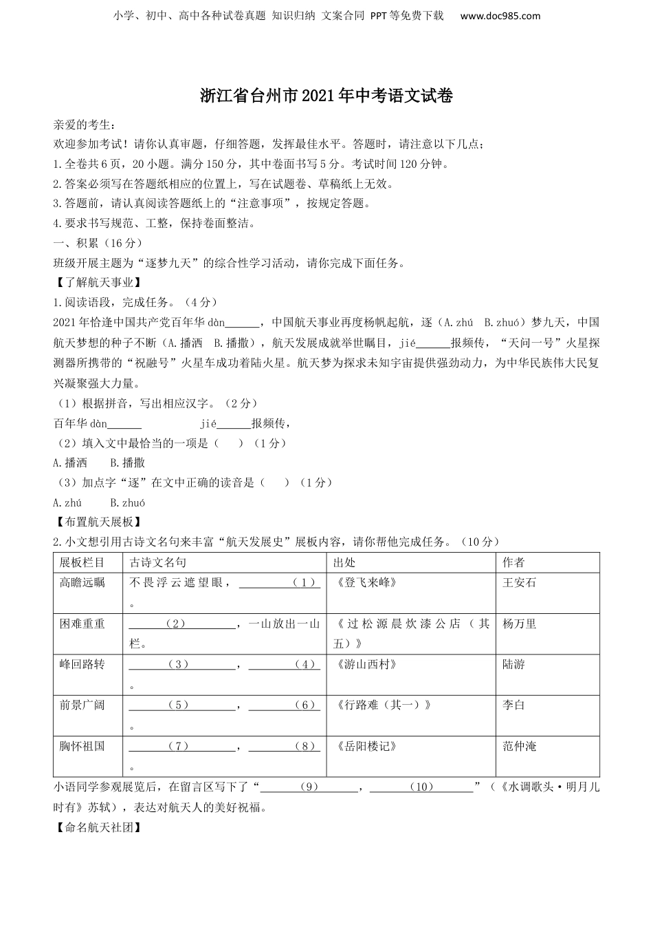 小学、初中、高中各种试卷真题知识归纳文案合同PPT等免费下载www.doc985.com浙江省台州市2021年中考语文试卷亲爱的考生:欢迎参加考试!请你认真审题,仔细答题,发挥最佳水平。答题时,请注意以下几点;1.全卷共6页,20小题。满分150分,其中卷面书写5分。考试时间120分钟。2.答案必须写在答题纸相应的位置上,写在试题卷、草稿纸上无效。3.答题前,请认真阅读答题纸上的“注意事项”,按规定答题。4.要求书写规范、工整,保持卷面整洁。一、积累(16分)班级开展主题为“逐梦九天”的综合性学习活动,请你完成下面任务。【了解航天事业】1.阅读语段,完成任务。(4分)2021年恰逢中国共产党百年华dàn,中国航天事业再度杨帆起航,逐(A.zhúB.zhuó)梦九天,中国航天梦想的种子不断(A.播洒B.播撒),航天发展成就举世瞩目,jié报频传,“天问一号”火星探测器所携带的“祝融号”火星车成功着陆火星。航天梦为探求未知宇宙提供强劲动力,为中华民族伟大民复兴凝聚强大力量。(1)根据拼音,写出相应汉字。(2分)百年华dànjié报频传,(2)填入文中最恰当的一项是()(1分)A.播洒B.播撒(3)加点字“逐”在文中正确的读音是()(1分)A.zhúB.zhuó【布置航天展板】2.小文想引用古诗文名句来丰富“航天发展史”展板内容,请你帮他完成任务。(10分)展板栏目古诗文名句出处作者高瞻远瞩不畏浮云遮望眼,(1)。《登飞来峰》王安石困难重重(2),一山放出一山栏。《过松源晨炊漆公店(其五)》杨万里峰回路转(3),(4)。《游山西村》陆游前景广阔(5),(6)。《行路难(其一)》李白胸怀祖国(7),(8)。《岳阳楼记》范仲淹小语同学参观展览后,在留言区写下了“(9),(10)”(《水调歌头·明月儿时有》苏轼),表达对航天人的美好祝福。【命名航天社团】小学、初中、高中各种试卷真题知识归纳文案合同PPT等免费下载www.doc985.com3.学校将成立航天社团。下面是征集到的航天社团备选名称,请选出你认为最适合的一项,并说明理由。(2分)A.“鲲鹏”航天社B.“北斗”航天社C.“祝融”航天社D.“夸父”航天社二、阅读(59分)(一)、名著阅读(9分)4.请你根据名著内容,完成表格。(5分)主人公相关重要人物相关重大事件主人公结局祥子虎妞(1)(2)保尔·柯察金(3)引导保尔走上革命道路(4)(5)索菲娅晚年不理解他的信仰和追求离家出走,病死在无名小城5.保加利亚作家柳德米尔·斯托亚诺夫说过,优秀的文学作品创作出的人物形象,往往能让成千上万的读者在他身上找到自己。你从下列作品中的哪个人物身上看到了自己的影子?请结合作品中的相关情节和自身实际谈一谈。(4分)A.《水浒传》B.《西游记》C.《简·爱》(二)文学作品阅读(17分)呼唤谢志强①绝望之中,我看见沙包背后走过来一个老汉。②他说:跟我来。③我说,我渴坏了。④他取下腰间挂着的羊皮水袋。我接过来,咕嘟咕嘟喝开了,仿佛在茫茫大漠碰上我想象中的水井。他似乎知道我在这兜转迷了路。我抹抹嘴,真痛快。⑤他说:跟我来。⑥我的心又向往着寻找数日的珍宝了。我说,我还有件要紧的事情,办成了会追上来呢,你稍等。⑦我顾不得老汉的存在,我又开始在这片古城堡的废墟里摸索。汗像小虫一样在我面颊、背脊蠕动,我却一门心思挥着坎土曼①东挖西刨。我的肚子咕噜响起来。我想起我已断水断粮整整两天了。⑧他说:跟我来。⑨我发现他离我十米远伫立着,这个老汉,看来也是探宝的角色,他好像是观望我,一旦有了成效再采取行动。⑩我说:我饿得不行了。⑪他在褡裢里取出了个馕。我接过来,一阵狼吞虎咽。肚里又实在了。⑫他说:跟我来。⑬我想:这个狡猾的老汉,大概看出我已经找着了门道,想设法将我诱开。⑭我说:你先走,我找一样东西,我会跟上来呢。⑮我又忘了他的存在。不知挖了多久,反正太阳像火盆一样吊在头顶,我手里的坎土曼突然触着了一个陶罐,我本能地警戒起来,四下里张望,没了老汉的影子。⑯这当儿,我又饥又渴。我绕了附近的几个沙包,寻找那个神秘的老汉,根本没有他的身影。我又恢复小学、初中、高中各种试卷真题知识归纳文案合同PPT等免费下载www.doc985.com到了老汉...