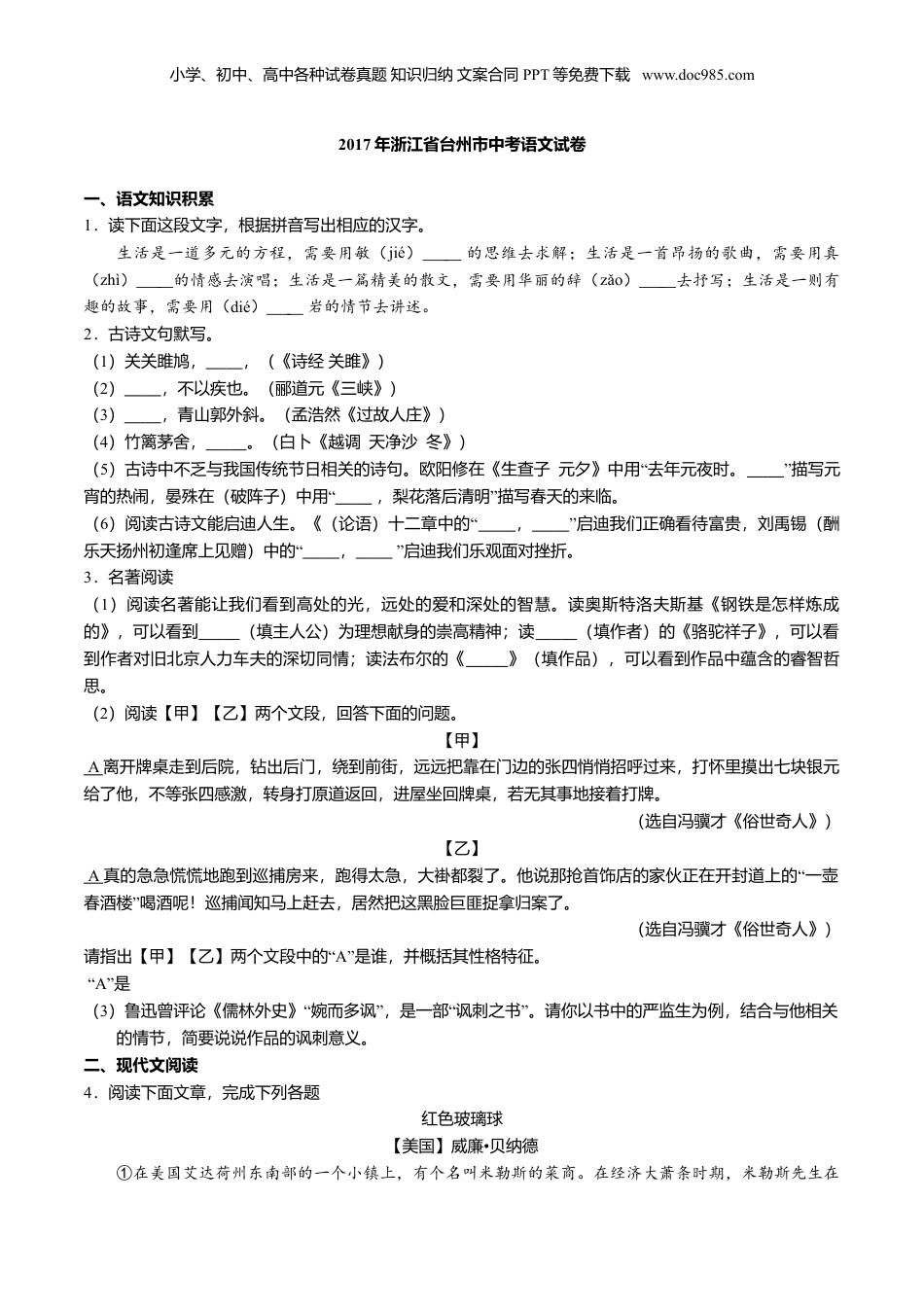 小学、初中、高中各种试卷真题知识归纳文案合同PPT等免费下载www.doc985.com2017年浙江省台州市中考语文试卷一、语文知识积累1.读下面这段文字,根据拼音写出相应的汉字。生活是一道多元的方程,需要用敏(jié)的思维去求解;生活是一首昂扬的歌曲,需要用真(zhì)的情感去演唱;生活是一篇精美的散文,需要用华丽的辞(zǎo)去抒写;生活是一则有趣的故事,需要用(dié)岩的情节去讲述。2.古诗文句默写。(1)关关雎鸠,,(《诗经关雎》)(2),不以疾也。(郦道元《三峡》)(3),青山郭外斜。(孟浩然《过故人庄》)(4)竹篱茅舍,。(白卜《越调天净沙冬》)(5“)古诗中不乏与我国传统节日相关的诗句。欧阳修在《生查子元夕》中用去年元夜时。”描写元“宵的热闹,晏殊在(破阵子)中用”,梨花落后清明描写春天的来临。(6“)阅读古诗文能启迪人生。《(论语)十二章中的,”启迪我们正确看待富贵,刘禹锡(酬“乐天扬州初逢席上见赠)中的,”启迪我们乐观面对挫折。3.名著阅读(1)阅读名著能让我们看到高处的光,远处的爱和深处的智慧。读奥斯特洛夫斯基《钢铁是怎样炼成的》,可以看到(填主人公)为理想献身的崇高精神;读(填作者)的《骆驼祥子》,可以看到作者对旧北京人力车夫的深切同情;读法布尔的《》(填作品),可以看到作品中蕴含的睿智哲思。(2)阅读【甲】【乙】两个文段,回答下面的问题。【甲】A离开牌桌走到后院,钻出后门,绕到前街,远远把靠在门边的张四悄悄招呼过来,打怀里摸出七块银元给了他,不等张四感激,转身打原道返回,进屋坐回牌桌,若无其事地接着打牌。(选自冯骥才《俗世奇人》)【乙】A“真的急急慌慌地跑到巡捕房来,跑得太急,大褂都裂了。他说那抢首饰店的家伙正在开封道上的一壶”春酒楼喝酒呢!巡捕闻知马上赶去,居然把这黑脸巨匪捉拿归案了。(选自冯骥才《俗世奇人》)“请指出【甲】【乙】两个文段中的A”是谁,并概括其性格特征。“A”是(3“”“”)鲁迅曾评论《儒林外史》婉而多讽,是一部讽刺之书。请你以书中的严监生为例,结合与他相关的情节,简要说说作品的讽刺意义。二、现代文阅读4.阅读下面文章,完成下列各题红色玻璃球【美国】•威廉贝纳德①在美国艾达荷州东南部的一个小镇上,有个名叫米勒斯的菜商。在经济大萧条时期,米勒斯先生在小学、初中、高中各种试卷真题知识归纳文案合同PPT等免费下载www.doc985.com路边摆了个小菜摊,人们下班的时候路过这里,顺便采购一些新鲜的蔬菜,那个时候,钱和食品非常匮乏,所以,以物易物的交易方式十分流行。②镇上有几个穷人家的孩子,他们经常到米勒斯先生的菜摊跟前晃悠。当然,他们不想买菜,只是来欣赏一下那些当时非常珍贵的物品。尽管如此,米勒斯先生也总是热情地招待他们,就像招待每个到这里买菜的大人一样。③“你好,巴里!今天过得怎么样?”④“你好,米勒斯先生,我过得不错,谢谢。这些豌豆看起来真新鲜。”⑤“是的,巴里,你妈妈身体好点没?”⑥“是的,正在好转。”⑦“那就好,你想要点什么?”⑧“不,先生,我就是看看,这些豌豆真的很不错!”⑨“你想带点回去吗?”⑩“不,先生,我没有钱。”“⑪可以用东西交换啊!你有什么东西跟我换吗?”“⑫哦﹣﹣﹣我只有几个刚赢来的玻璃球。”“⑬是吗?给我看看。”“⑭给,你看,这个多漂亮。”“⑮嗯,是这样的。不过这是蓝色的,我想要个红色的。你家里有红色的吗?”“⑯好像有。”“⑰这样,你把这袋豌豆带回去,下次把那个红色的玻璃球带来。”“⑱一定,谢谢你,米勒斯先生。”⑲每当米勒斯先生和这些小顾客“讨价还价”是,米勒斯太太都静静地站在一旁看着,面带微笑。她很熟悉这些“交易”,也很理解丈夫的行为。除了巴里,镇上还有两个穷孩子,他们的家里拿不出钱来买菜,也没有值钱的东西来交换。为了帮助他们,又显得自然,米勒斯就这样假装和他们为了一个玻璃球进行谈判。就像这次巴里有个蓝色的玻璃球,可米勒斯先生却想要红色的,下次他带红色玻璃球来的时候,米勒斯先生又想要绿色或橘红色的了。当然了,每次打发这个男孩回家的时候,总会让他带上一袋新鲜的蔬菜...