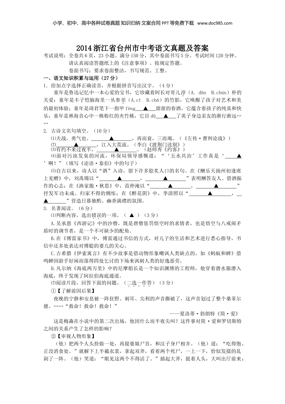 小学、初中、高中各种试卷真题知识归纳文案合同PPT等免费下载www.doc985.com2014浙江省台州市中考语文真题及答案考试说明:全卷共6页,23小题。满分150分,其中卷面书写5分。考试时间120分钟。请认真阅读答题纸上的《注意事项》。按规定答题。卷面书写:要求卷面整洁,书写规范、工整。一、语文知识积累与运用(27分)1.给加点字选择正确读音,并根据拼音写出汉字。(4分)童年是鲁迅记忆中一本心爱的宝书,它珍藏着阿长对哥儿淳(A.dūnB.chún)朴的关爱;童年是丰子恺脑海里一丛参差(A.cīB.chā)的竹影,它唤醒了孩子对艺术和美的最初体验;童年是琦君笔下一指甲fèng▲甜甜的春酒,它蕴含着孩子的纯真和快乐;童年是林海音心中一株粉红的夹竹桃,它目dǔ▲了英子身边亲友的渐行渐远……2.古诗文名句填空。(10分)⑴夫战,勇气也。▲,再而衰,三而竭。(《左传·曹刿论战》)⑵▲,江入大荒流。(李白《渡荆门送别》)⑶有约不来过夜半,▲。(赵师秀《约客》)⑷面对污浊发臭的河流,环保局领导感慨道:“‘五水共治’工作真是‘▲’啊!”(填写《论语·泰伯》中的句子)⑸自古以来,诗人以“酒”入诗,留下许多脍炙人口的名句。在《酬乐天扬州初逢席上见赠》中,刘禹锡以“▲,▲”表明酬答友人、借酒振作的心志;在《渔家傲·秋思》中,范仲淹以“▲,▲”抒发军功未成、归家不得的惆怅;在《醉花阴》中,李清照以“▲,▲”营造日暮独酌、幽香满襟的氛围。3.名著阅读。(6分)⑴判断内容,选出错误的一项。(▲)(3分)A.吴承恩《西游记》中的沙僧,既是唐僧惩罚悟空时的求情者,也是悟空与八戒闹矛盾时的调节者,是一个不可缺少的配角。B.在《傅雷家书》中,傅雷通过书信的方式,对儿子的生活和艺术进行悉心指导,书信中还多处表达对傅聪的妻儿的关心。C.古希腊《伊索寓言》有不少故事是借动物形象嘲讽人类缺点的,如《蚂蚁和蝉》借鸣蝉因游手好闲而落得四处乞讨的下场来讽刺人类的好逸恶劳。D.凡尔纳《海底两万里》中的尼摩船长是一个知识渊博的工程师,他穿着潜水服潜入海底,终于发现了阿拉伯海底通道。⑵阅读片段,回答下面的问题。(二选一作答)(3分)①【了解前因后果】夜晚的宁静和安息被一阵狂野、刺耳、尖利的声音撕破了,这声音划过了整个桑菲尔德。……“救命!救命!救命!”——夏洛蒂·勃朗特《简·爱》这是梅森在小说中的第二次出场,他因什么而半夜尖叫?这件事对简·爱和罗切斯特之间的关系产生了怎样的影响?②【审视人物形象】(他)把两个人头拴做一处,再提婆娘尸首,和汉子身尸相并。(他)道:“吃得饱,正没消食处。”就解下上半截衣裳,拿起双斧,看着两个死尸,一上一下,恰似发擂的乱剁了一阵。(他)笑道:“眼见这两个不得活了。”插起大斧,提着人头,大叫出厅前来:小学、初中、高中各种试卷真题知识归纳文案合同PPT等免费下载www.doc985.com“两个鬼我都捉了。”撇下人头……太公哭道:“师父,留得我女儿也罢。”——施耐庵《水浒传》(第七十三回)先指出“他”是谁,再结合以上文字谈谈你对“他”的看法。我选做(▲)题。▲4.综合性学习。(7分)为进一步增强同学们的环保意识,学校开展“废旧电池回收”的系列活动,请你参加并完成相关任务。⑴右边是问卷调查结果统计图,请用简洁的文字写出该图的主要信息。(不得出现数字)(2分)▲⑵校园内设置废旧电池回收箱,箱上有两句宣传语,请你紧扣“环保”主题,运用对偶知识补写下句。(2分)上句:回收废旧电池下句:⑶学校志愿者行动队到某小区发放有关废旧电池危害的宣传单时,看见一位小伙子正把几节旧电池扔到草坪上,你赶忙上前劝阻。针对小伙子下面这句话,请你结合【相关链接】中的知识对其进行规劝,规劝时语言得体,内容恰当。(3分)【相关链接】电池主要成份为锰、汞、锌等重金属。被遗弃的废电池腐烂后,其重金属成份会随渗液溢出,造成地下水和土壤的污染,并严重危害人类健康。小伙子说:小毛孩管什么闲事!我只是扔个破电池而已,有什么大不了的!你说:▲二、现代文阅读(32分)阅读下面的文章,完成5~12题。(一)(17分)钓虾鲁彦①每年一到夏天,河水渐...