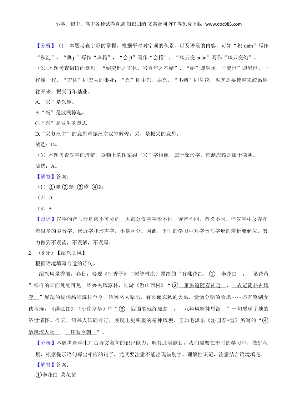 小学、初中、高中各种试卷真题知识归纳文案合同PPT等免费下载www.doc985.com2021年浙江省绍兴市中考语文试卷参考答案与试题解析“你能看见多远的过去,就能看见多远的未来。”以下是“绍兴印象”“百年征程”“社会观察”三个主题学习任务,共6页,18小题,满分34分。请在120分钟内完成,答案须写在答题纸规定区城内的相应位置上,写在试卷上、草稿纸上均无效。绍兴印象1.(10分)【绍兴之名】绍兴历史悠久,积diàn①_____深厚。据古代典jí②_____记载:春秋战国时期,古代越民族以绍兴为中心建立越国,故称越、大越;秦至南北朝称会jī③_____,隋唐北宋称越州。公元1131年,南宋高宗取“绍奕世之宏休,兴百年之丕绪”之意,改元绍兴,升越州为绍兴府,绍兴之名由此而来,历经近九百年风云变huàn④_____,沿用至今。小贴士宏休:洪福丕绪:大功业(1)根据拼音和语境填写汉字。①淀②籍③稽④幻(2)请选出下列句子所含“兴”与片段画线句的“兴”意义相同的一项DA.兴尽晚回舟,误入藕花深处。(李清照《如梦令》)B.左刻“清风徐来,水波不兴”,石青糁之。(魏学洢《核舟记》C.是故谋闭而不兴,盗窃乱贼而不作,故外户而不闭。(《大道之行也》)D.庶竭驽钝,攘除奸凶,兴复汉室,还于旧都。(诸葛亮《出师表》)(3)某考古现场发掘出一件器物,上面刻的“兴”字写作,请推测这件器物最早可能制作于哪个朝代。AA.商B.秦C.汉D.唐小学、初中、高中各种试卷真题知识归纳文案合同PPT等免费下载www.doc985.com【分析】(1)本题考查字形的掌握。根据平时对字词的积累,以及语段的内容,可知“积diàn”写作“积淀”,“典jí”写作“典籍”,“会jī”写作“会稽”,“风云变huàn”写作“风云变幻”。(2)本题考查词语的意思。“绍奕世之宏休,兴百年之丕绪”,“绍”即继承,“奕世”即累世、一代接一代,“宏休”即宏大的事业;“兴”即中兴、振兴,“丕绪”即皇统,也就是要使赵宋统治继往开来,振兴百年基业。A.“兴”是兴趣。B.“兴”是波澜惊起。C.“兴”是发生的意思。D.“兴复汉室”的意思重振汉室汉室辉煌。兴,是振兴的意思。故选:D。(3)本题考查汉字的理解。器物上的图案跟“兴”字相像,属于象形字,推测应该是属于商朝。故选:A。【解答】答案:(1)①淀②籍③稽④幻(2)D(3)A【点评】汉字的音与形是密不可分的,大部分汉字字形不同,读音不同,意义不同,但汉字中又存在着很多的多音字、形近字和形声字,不易区分。因此,平时的学习中对字音与字形的辨析要到位,努力做到不误读,不误解,不误写。2.(8分)【绍兴之风】根据语境填写合适的诗句。绍兴风景秀丽,春日,秦观《行香子》(树绕村庄)描绘的“有桃花红,①李花白,菜花黄”那样的画面处处可见。绍兴民风淳朴,陆游《游山西村》“②箫鼓追随春社近,衣冠简朴古风存”展现的民俗场景流传至今。绍兴名人辈出,有公而忘私的大禹,爱憎分明的鲁迅……还有鉴湖女侠秋瑾,《满江红》(小住京华)中“③四面歌残终破楚,八年风味徒思浙”一句展现了她的济世情怀。今天,绍兴人砥砺前行,展现出更积极的精神风貌,正如毛泽东《沁园春•雪》所写的“④数风流人物,还看今朝”。【分析】本题考查学生对古诗文名句的识记能力。解答此类题目,我们需要在平时的学习中,做好积累,根据提示语句写出相应的句子,尤其要注意不能出现错别字。理解性识记,注意结合语境填充。【解答】答案:①李花白菜花黄小学、初中、高中各种试卷真题知识归纳文案合同PPT等免费下载www.doc985.com②箫鼓追随春社近衣冠简朴古风存(重点字:箫)③四面歌残终破楚八年风味徒思浙(重点字:徒)④数风流人物还看今朝【点评】为了保证在默写名句时不出错,关键还是平时要加强背诵和记忆,准确书写。下面几种方法可供借鉴:1.保持良好的心态,培养识记兴趣。2.多种方式相结合,提高识记效果。3.提倡使用名句,巩固识记成果。4.留心特别词句,规避识记误区。3.(16分)今年是徐渭诞辰500周年,相关部门打算修葺徐渭故居青藤书屋,设计组在拟订植物造景方案时搜索到下文。阅读文章,完成问题。长物志卷二花木[明]文震亨①弄花一...
