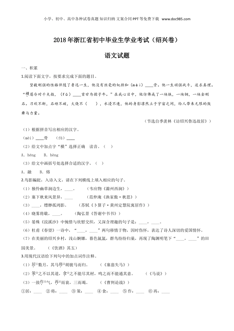 小学、初中、高中各种试卷真题知识归纳文案合同PPT等免费下载www.doc985.com2018年浙江省初中毕业生学业考试(绍兴卷)语文试题一、积累1.阅读下面文字,按要求完成下面的题目。坚毅刚强的性格伴随了鲁迅一生,他没有丝毫的奴颜和(mèi)骨。他一生顽强战斗,追求真理。“横眉冷对千夫指,(fǔ)首甘为孺子牛。”在我心目中,他仿佛成了一块铁,一块钢,一块金刚石。刀砍不断,石砸不破,火烧不(),水浸不透,他的身影凛然立于宇宙之间,给人带来无限的鼓舞与力量。(节选自季羡林《访绍兴鲁迅故居》)(1)根据拼音写出相应的汉字。(mèi)____骨(fǔ)____(2)给文中加点宇“横”选择正确的读音。()A.héngB.hèng(3)给文中画括号处选择合适的汉字。()A.融B.熔2.鸟影蹁跹,入诗入文,请在下列横线上填入相应的句子。(1)独怜幽草涧边生,____。(韦应物《滁州西涧》)(2)塞下秋来风景异,____。(范仲淹《渔家傲·秋思》)(3)____,缥缈孤鸿影。(苏轼《卜算子·黄州定慧院寓居作》)(4)晓雾将歇,____。(陶弘景《答谢中书书》)(5)晏殊《浣溪沙》中惋惜与欣慰交织,又深含理趣的句子是:____,____。(6)杜甫《春望》一诗中,“____,____”两句移情于物,因时伤怀,表达了诗人深切的爱国情怀。(7)在美丽的绍兴乡村,浅山婀娜,暮色氤氲,群鸟纷纷归巢,再现了陶渊明笔下“____,____”的田园美景。(《饮酒》其五)3.用现代汉语给下列句中的加点词作注释。(1)居①数月,其马将②胡骏马而归。(《塞翁失马》)(2)策③之不以其道,食④之不能尽其材,鸣之而不能通其意。(《马说》)(3)一鼓作⑤气,再⑥而衰,三而竭。(《曹刿论战》)①居:____②将:____③策:____④食:____⑤作:____⑥再:____小学、初中、高中各种试卷真题知识归纳文案合同PPT等免费下载www.doc985.com二、阅读(一)名著阅读4.小明在复习自己读过的科幻类小说时,发现一张掉落的插图(见下)。根据画面内容,他应将此页放回《(1)____》一书中去,理由是(2)____。5.文学作品中人物的姓名往往体现作家的匠心。它们或体现了人物性格,或暗示了人物命运,或寄寓了作者态度,或暗示了文章主旨。下列小说中的人物姓名有哪些深意?请参考示例(不要求仿照),选择其中一个,结合小说有关内容写出你的理解。鲁达(《水浒》)翠翠(《边城》)祥子(《骆驼祥子》)【示例】香菱(《红楼梦》):“香”昭示了她的美丽温柔,诗心才情;“菱”是一种浮水水生植物,随波逐流,无所归依,暗示了她的命运——从小被拐,后来被卖,最后被弃,一生悲惨。她的本名“甄英莲”谐音“真应怜”,寄寓了这位女子悲惨的人生际遇,表明了作者对她的怜惜。我选():____(二)文学作品阅读阅读下面文章,完成下列小题。飘逝的风筝徐国平三月的暖风一吹,催着万物,都跟长了翅膀一样。鹞爷也感觉到了,一大早儿就拿起那只“年年有余”的风筝,迈出了家门。整个村庄像被掏空了身子一样,甚至连声犬吠鸡鸣都听不到。鹞爷一边走着,一边四下观望着。若在以往,身后总会尾随着一群欢天喜地的孩子,一个个抢夺着他手中的风筝。唉,娃们一个个都去哪儿了?一路上,那些残墙断壁、破砖瓦砾、树林和那些废弃的打麦场,被风吹过,尘土飞扬,凌乱不堪。两台从早到晚狂叫不止的挖掘机,正一口口地蚕食着那一排排早已空无一人的院落。鹞爷瞧着心痛,就像被抽筋剥皮一般难受。很快,自家那二间旧屋也难逃一劫了,只是满屋子的风筝,又将栖身何处?小学、初中、高中各种试卷真题知识归纳文案合同PPT等免费下载www.doc985.com鹞爷忧心忡忡,步履沉缓,一直走出村外。村外的那大片麦地,整整荒废了一个冬天,听说要建飞机场。一阵春风吹来,那只风筝有些急不可待地拽紧了他的手。若在过去,鹞爷早就手脚利落地将风筝放飞起来,心也随着风筝,飞到天上去了。如今,鹞爷却攥紧风筝,迟迟不肯撒手。鹞爷又想到过去。他自幼就跟师傅扎风筝。这辈子,连他自己也数不清扎了多少只风筝。每只风筝经过他的手,都活灵活现,千姿百态。那些走在归途上的人老远瞅着,就觉得离家近了,浑身的疲惫便飞到九霄云外。后来,...