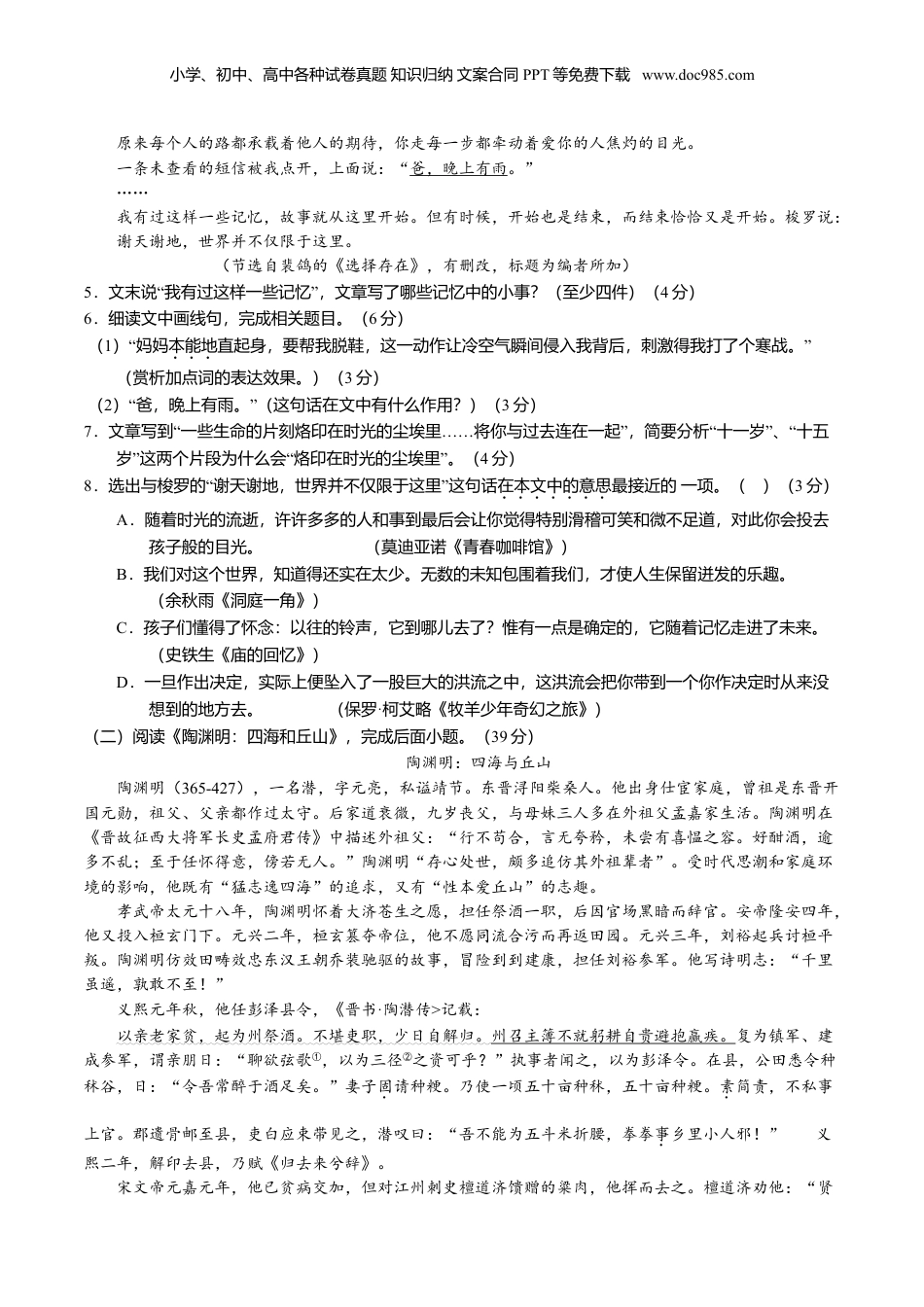 小学、初中、高中各种试卷真题知识归纳文案合同PPT等免费下载www.doc985.com2016年中考真题精品解析语文(浙江绍兴卷)精编word版一、书写(5分)请在答题时努力做到正确、工整、美观。二、知识积累(21分)1.阅读片段,根据拼音写出汉字。(4分)yúnyún______(l)_____众生,究竟该如何生活?历来众说纷yún(2)______,莫哀一是。我比较欣赏农夫“春耕夏yún(3)______,秋敛冬藏,息于聆缶之乐”的方式,与自然合一,张弛有度,yùn(4)______酿着生活与文化的甜蜜。2.选出以下各句加点成语使用正确的一项。()(3分)A.除夕之夜,腾空而起的礼花和不绝于耳的爆响声交相辉映。(《人民日报》2011-2-4)B“”.白马撵蹄近相映,欢声四合壮士呼。无论是打球的,还是观看比赛的,全都精神亢奋、呼天抢地。(《沈阳日报》2014-2-21)C.白纸上,我还没有种上一粒字。多半天,我一文不名。终于,在一阵鸽哨声里,我写下了第八次开头。(《散文》2014年第4期)D.这个十年,季羡林在《中国蔗糖史》的基础上,又完成了80万字的《糖史》。这部呕心沥血之作,被季羡林视为平生最重要的著作。(《中国剪报》2015-10-27)3.品味多彩生活,积累多彩诗文。(8分)(l)客路青山外,。(王湾《次北固山下》)(2)角声满天秋色里,。<李贺《雁门太守行》)(3),隔叶黄鹂空好音。(杜甫《蜀相》)(4)碧云天,黄叶地,秋色连波,。(范仲淹《苏幕遮》)(5)张岱在《湖心亭看雪》中用寥寥十余字描写了一个混沌一片的冰雪世界。这个句子是:,。(6)龚自珍《己亥杂诗》“_,”与李商隐“春蚕到死丝方尽’蜡炬成灰泪始干”有异曲同工之妙,常用来形否无私幂顽的精神。4.名著阅读。(6分)(1“”)奇人,一般解释为:①以独特方式行事的人;②)有某一项奇特技能的人或能力杰出的人。选出对“”《俗世奇人》中的奇人分析正确的一项。()(3分)A.张大力是一个以独特方式行事的奇人,他力大没边,举起石锁后,老板耍赖不给钱,他竞哈哈大笑扬长而去。B.酒婆是一个喝酒能力杰出的人,她能控制酒量,喝酒后能醉出与别人不同的姿态。C.苏七块是有奇特技能的奇人,他接骨技艺高超得令人惊奇;也是一个以独特方式行事的奇人'规矩很奇特,无论什么人看病都得先拿出七块银元。D.杨巴是个行事方式特别奇特的人,人家做茶汤靠手艺,他做茶汤靠口才。(2……)好的封面画,或传递书的整体内容,或呈现代表人物,或展示主题情感或兼而有之。结合你的阅读思考,为《城南旧事》选择一幅最合适的封面画,并简述理由。(3分)小学、初中、高中各种试卷真题知识归纳文案合同PPT等免费下载www.doc985.com我选择__________。理由:_______________________________________________。三、文本阅读(56分)(一)阅读《烙印在时光里的生命片刻》,完成后面小题。(17分)烙印在时光里的生命片刻裴鸽人们常常把一些小事抛在脑后,一些生命的片刻烙印在时光的尘埃里,我们可以试着忽略,但这些微不足道的事却一点一滴形成一条链子,将你与过去连在一起。十一岁初冬的早晨,屋外还是一片漆黑,充溢着暖暖的灯光的厨房便成为世界的中心。睡梦中的我隐约听到窗外大扫帚掠过地面的唰唰声,接着在屋里往往会有“啪”的一声,因为妈妈常会在经过小仓库时碰掉一两个玩具。然后我能想象到腰椎不好的妈妈绝不会弯腰,而是蹲下来,拾起掉落的玩具,摆回原处。她会迈着花仙子般轻盈的步伐进入厨房,当然不是那种小精灵了,应该是睡美人的精灵婶婶。水龙头的流水声,燃气灶被拧开的声音,盖上锅盖的声音,水被煮沸的声音……掀开锅盖,水汽弥漫,犹如精灵山谷的密林晨雾。水被倒进碗里,是山谷绝壁上飞流直下的瀑布,蒸腾着“白烟”,激荡着水花。然后是磕鸡蛋的声音,打蛋时碗筷撞击的声音。突然,一切声音戛然而止。一秒、两秒、三秒,筷子缓慢搅水的声音渐渐传来,我松了一口气。想象到前几秒,鸡蛋沿着碗壁滑入水中,像一大束阳光徐徐流下来,渗入透明的泉水中。鸡蛋几乎是在一瞬间转化成一团团软绵绵的淡黄色云朵,飘来飘去。我咽下口水,半眯眼睛,沙发左端的爸爸像一个魁梧版的“长妈妈”,摆个大字,睡...