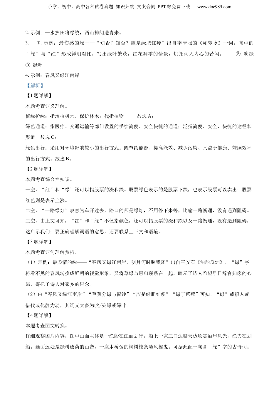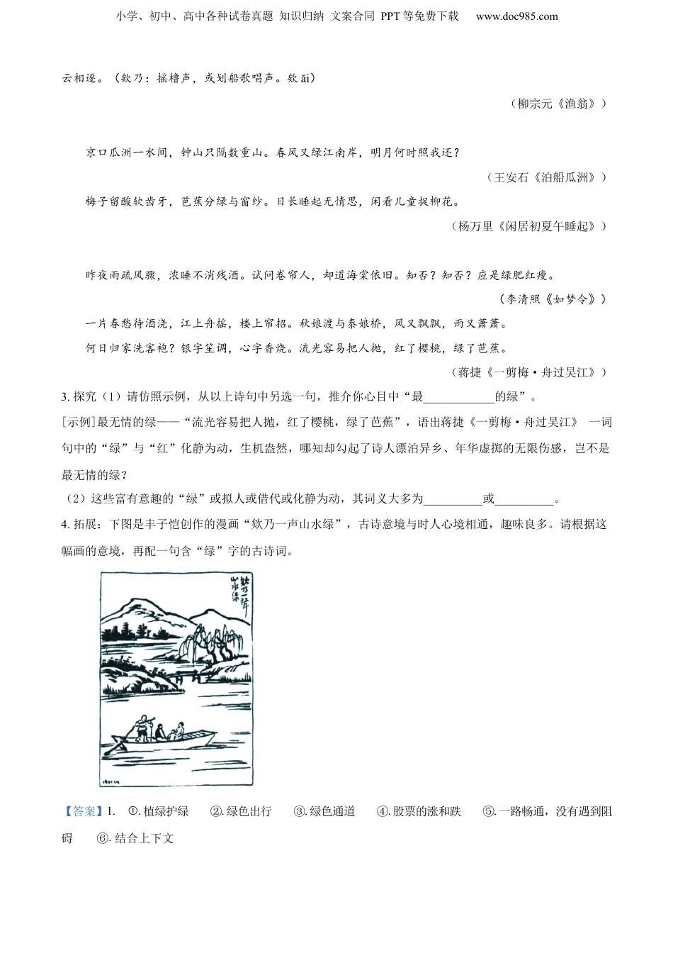 小学、初中、高中各种试卷真题知识归纳文案合同PPT等免费下载www.doc985.com浙江省2023年初中学业水平考试(衢州卷)语文试题卷考生须知:1.全卷共五个活动,16小题,满分为120分(含书写3分)。考试时间为120分钟。2.各题的答案必须用黑色字迹的钢笔或签字笔写在“答题纸”的相应位置上。3.请用黑色字迹的钢笔或签字笔在“答题纸”上先填写姓名和准考证号。全卷书写3分活动一班级举行“发现汉字”活动,请你一起完成任务。1.梳理同学们梳理了常见的含“绿”字词语,绘制了下面的词义演变地图,请你:(1)根据词义,将“植绿护绿”“绿色通道”“绿色出行”填入下图ABC处恰当的位置。A________B________C________(2)补全小组讨论中的对话。小华说:“桃红柳绿”让我犯难了,“红”和“绿”仅仅指颜色吗?小莉说:“红”和“绿”还可以指①_________。小倩说:今天早上赵老师祝我们“旗开得胜,一路绿灯”,这个“一路绿灯”怎么解释?小莉说:这是比喻的说法,意思是②________。小华说:看来,要正确理解词语的意思,还要③________。2.搜集同学们搜集了含“绿”字的古代诗词,请你补充一例(连续的两句)。诗情“绿”意渔翁夜傍西岩宿,晓汲清湘燃楚竹。烟销日出不见人,欸乃一声山水绿。回看天际下中流,岩上无心小学、初中、高中各种试卷真题知识归纳文案合同PPT等免费下载www.doc985.com云相逐。(欸乃:摇橹声,或划船歌唱声。欸ǎi)(柳宗元《渔翁》)京口瓜洲一水间,钟山只隔数重山。春风又绿江南岸,明月何时照我还?(王安石《泊船瓜洲》)梅子留酸软齿牙,芭蕉分绿与窗纱。日长睡起无情思,闲看儿童捉柳花。(杨万里《闲居初夏午睡起》)昨夜雨疏风骤,浓睡不消残酒。试问卷帘人,却道海棠依旧。知否?知否?应是绿肥红瘦。(李清照《如梦令》)一片春愁待酒浇,江上舟摇,楼上帘招。秋娘渡与泰娘桥,风又飘飘,雨又萧萧。何日归家洗客袍?银字笙调,心字香烧。流光容易把人抛,红了樱桃,绿了芭蕉。(蒋捷《一剪梅·舟过吴江》)3.探究(1)请仿照示例,从以上诗句中另选一句,推介你心目中“最____________的绿”。[示例]最无情的绿——“流光容易把人抛,红了樱桃,绿了芭蕉”,语出蒋捷《一剪梅·舟过吴江》一词句中的“绿”与“红”化静为动,生机盎然,哪知却勾起了诗人漂泊异乡、年华虚掷的无限伤感,岂不是最无情的绿?(2)这些富有意趣的“绿”或拟人或借代或化静为动,其词义大多为__________或__________。4.拓展:下图是丰子恺创作的漫画“欸乃一声山水绿”,古诗意境与时人心境相通,趣味良多。请根据这幅画的意境,再配一句含“绿”字的古诗词。【答案】1..①植绿护绿②.绿色出行③.绿色通道④.股票的涨和跌⑤.一路畅通,没有遇到阻碍⑥.结合上下文小学、初中、高中各种试卷真题知识归纳文案合同PPT等免费下载www.doc985.com2.示例:一水护田将绿绕,两山排闼送青来。3..①示例:最伤感的绿——“知否?知否?应是绿肥红瘦”出自李清照的《如梦令》一词,句中的“绿”与“红”形成鲜明对比,写出绿叶繁茂,红花凋零的情景,烘托词人内心的苦闷。②.吹绿③.绿叶4.示例:春风又绿江南岸【解析】【1题详解】本题考查词义理解。植绿护绿:指培植树木,保护林木;代指植物。故选A;绿色通道:指医疗、交通运输等部门设置的手续简便、安全快捷的通道;泛指简便、安全、快捷的途径和渠道。故选C;绿色出行:采用对环境影响较小的出行方式。既节约能源、提高能效、减少污染、又益于健康、兼顾效率的出行方式。故选B。【2题详解】本题考查综合性知识。一空,“红”和“绿”还可以指股票的涨和跌。股票绿色表示的是股票下跌,也表示股票可以卖出;股票红色则是表示上涨。二空,“一路绿灯”表意为车开过去,路口的都是绿灯,不用停下来等,比喻一路畅通,没有遇到阻碍。三空,由上文可知,“红”和“绿”不仅指颜色,还可以指股票的涨和跌以及一路畅通,没有遇到阻碍,这启示我们:要正确理解词语的意思,还要联系上下文和语境。【3题详解】本题考查词句理解赏析。(1)示例:最柔情的绿——“春风又绿江南岸,明月何时照我还”出自王安石《泊船瓜洲》,“绿...