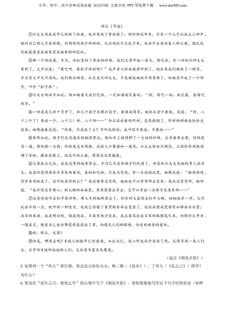 小学、初中、高中各种试卷真题知识归纳文案合同PPT等免费下载www.doc985.com浙江省2023年初中学业水平考试(衢州卷)语文试题卷考生须知:1.全卷共五个活动,16小题,满分为120分(含书写3分)。考试时间为120分钟。2.各题的答案必须用黑色字迹的钢笔或签字笔写在“答题纸”的相应位置上。3.请用黑色字迹的钢笔或签字笔在“答题纸”上先填写姓名和准考证号。全卷书写3分活动一班级举行“发现汉字”活动,请你一起完成任务。1.梳理同学们梳理了常见的含“绿”字词语,绘制了下面的词义演变地图,请你:(1)根据词义,将“植绿护绿”“绿色通道”“绿色出行”填入下图ABC处恰当的位置。A________B________C________(2)补全小组讨论中的对话。小华说:“桃红柳绿”让我犯难了,“红”和“绿”仅仅指颜色吗?小莉说:“红”和“绿”还可以指①_________。小倩说:今天早上赵老师祝我们“旗开得胜,一路绿灯”,这个“一路绿灯”怎么解释?小莉说:这是比喻的说法,意思是②________。小华说:看来,要正确理解词语的意思,还要③________。2.搜集同学们搜集了含“绿”字的古代诗词,请你补充一例(连续的两句)。诗情“绿”意渔翁夜傍西岩宿,晓汲清湘燃楚竹。烟销日出不见人,欸乃一声山水绿。回看天际下中流,岩上无心小学、初中、高中各种试卷真题知识归纳文案合同PPT等免费下载www.doc985.com云相逐。(欸乃:摇橹声,或划船歌唱声。欸ǎi)(柳宗元《渔翁》)京口瓜洲一水间,钟山只隔数重山。春风又绿江南岸,明月何时照我还?(王安石《泊船瓜洲》)梅子留酸软齿牙,芭蕉分绿与窗纱。日长睡起无情思,闲看儿童捉柳花。(杨万里《闲居初夏午睡起》)昨夜雨疏风骤,浓睡不消残酒。试问卷帘人,却道海棠依旧。知否?知否?应是绿肥红瘦。(李清照《如梦令》)一片春愁待酒浇,江上舟摇,楼上帘招。秋娘渡与泰娘桥,风又飘飘,雨又萧萧。何日归家洗客袍?银字笙调,心字香烧。流光容易把人抛,红了樱桃,绿了芭蕉。(蒋捷《一剪梅·舟过吴江》)3.探究(1)请仿照示例,从以上诗句中另选一句,推介你心目中“最____________的绿”。[示例]最无情的绿——“流光容易把人抛,红了樱桃,绿了芭蕉”,语出蒋捷《一剪梅·舟过吴江》一词句中的“绿”与“红”化静为动,生机盎然,哪知却勾起了诗人漂泊异乡、年华虚掷的无限伤感,岂不是最无情的绿?(2)这些富有意趣的“绿”或拟人或借代或化静为动,其词义大多为__________或__________。4.拓展:下图是丰子恺创作的漫画“欸乃一声山水绿”,古诗意境与时人心境相通,趣味良多。请根据这幅画的意境,再配一句含“绿”字的古诗词。活动二请你参加“走近鲁迅”学习活动,完成任务。小学、初中、高中各种试卷真题知识归纳文案合同PPT等免费下载www.doc985.com琐记(节选)①衍太太现在是早已经做了祖母,也许竟做了曾祖母了;那时却还年青,只有一个儿子比我大三四岁。她对自己的儿子虽然狠,对别家的孩子却好的,无论闹出什么乱子来,也决不去告诉各人的父母,因此我们就最愿意在她家里或她家的四近玩。②举一个例说罢,冬天,水缸里结了薄冰的时候,我们大清早起一看见,便吃冰。有一回给沈四太太看到了,大声说道:“莫吃呀,要肚子疼的呢!”这声音又给我母亲听到了,跑出来我们都挨了一顿骂,并且有大半天不准玩。我们推论祸首,认定是沈四太太,于是提起她就不用尊称了,给她另外起了一个绰号,叫作“肚子疼”。③衍太太却决不如此。假如她看见我们吃冰,一定和蔼地笑着说:“好,再吃一块。我记着,看谁吃的多。”④一回是我已经十多岁了,和几个孩子比赛打旋子,看谁旋得多。她就从旁计着数,说道:“好,八十二个了!再旋一个,八十三!好,八十四……”但正在旋着的阿祥,忽然跌倒了,阿祥的婶母也恰恰走进来。她便接着说道:“你看,不是跌了么?不听我的话。我叫你不要旋,不要旋……”⑤虽然如此,孩子们总还喜欢到她那里去。假如头上碰得肿了一大块的时候,去寻母亲去罢,好的是骂一通,再给擦一点药;坏的是没有药擦,还添几个栗凿和一通骂。衍太太却决不埋怨,立刻给你用烧酒调了水粉,搽在疙瘩上,说这不但止痛,将来...