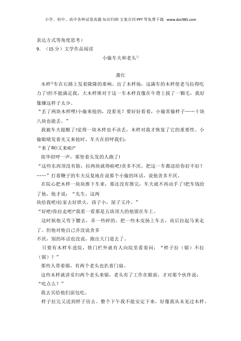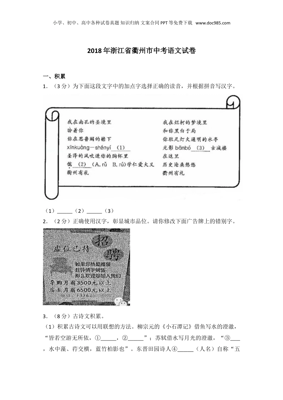 小学、初中、高中各种试卷真题知识归纳文案合同PPT等免费下载www.doc985.com2018年浙江省衢州市中考语文试卷一、积累1.(3分)为下面这段文字中的加点字选择正确的读音,并根据拼音写汉字。(1)(2)(3)2.(2分)正确使用汉字,彰显城市品位。请你修改下面广告牌上的错别字。3.(8分)古诗文积累。(1)积累古诗文可以用联想的方法。柳宗元的《小石潭记》借鱼写水的澄澈,“皆若空游无所依,①,②”;苏轼借水写月光的澄澈,“③,水中藻、荇交横,蓝竹柏影也”。东晋田园诗人④(人名)自称“五小学、初中、高中各种试卷真题知识归纳文案合同PPT等免费下载www.doc985.com柳先生”,他的“羁鸟恋旧林,池鱼思故渊”,表达了对田园生活的向往,让人联想到王籍的“⑤,⑥”(《人若耶溪》)。(2)中国人取名常从古诗中汲取灵感,下列名字出自什么诗句?选一个回答。A.邱胜春(人名)B.渡远(桥名)C.锦江(宾馆名)D.日幕(亭子名)4.(2分)用下列句中加点词语称呼如图中的礼仪,正确的一项是()A.我要向你稽首(《雷电颂》)B.(翠莲)向前来深深的道了三个万福(《水浒》)C.范进向他作揖(《范进中举》)D.(秦王)长跪而谢之日(《唐雎不辱使命》)5.(2分)为下列句中加点词语选择正确的读音。(1)未复有能与其奇者(2)公与之乘,战于长勺A.yǔB.yù6.(2分)下列句中加点词语意思相同的一项是()A.三顾臣于草庐之中将军宜枉驾顾之B.河曲智叟亡以应今亡亦死C.陶后鲜有闻鲜妍明媚D.邹忌修八尺有余讲信修睦二、阅读(51)名著阅读(从下列题目中选一个作答)7.(3分)《童年》是外国长篇小说,《傅雷家书》是多篇书信汇编,根据这些特点,可以分别采用哪些方法阅读?8.(3分)请以《朝花夕拾》和《名人传》为例,探究回忆性散文和传记的不同特点。(可以从选材、人称、写作目的、小学、初中、高中各种试卷真题知识归纳文案合同PPT等免费下载www.doc985.com表达方式等角度思考)9.(15分)文学作品阅读小偷车夫和老头①萧红木柈②车在石路上发着隆隆的重响。出了木柈场,这满车的木柈使老马拉得吃力了!但不能满足我,大木柈堆对于这一车木柈直像在牛背上拔了一颗毛,我好像嫌这柈子太少。“丢了两块木柈哩!小偷来抢的,没看见?要好好看着,小偷常偷柈子……十块八块也能丢。”我被车夫提醒了!觉得一块木柈也不该丢,木柈对我才恢复了它的重要性。小偷眼晴发着光又来抢时,车夫在招呼我们:“来了啊!又来啦!”郎华招呼一声,那竖着头发的人跑了!“这些东西顶没有脸,拉两块就得啦吧!贪多不厌,把这一车都送给你好不好?……”打着鞭子的车夫反复地在说那个小偷的坏话,说他贪多不厌。在院心把木柈一块块推下车来,那还没有推完,车夫就不再动手了!把车钱给了他,他才说:“先生,这两块给我吧!拉家去好烘火,孩子小,屋子又冷。”“好吧!你拉走吧!”我看一看那是五块顶大的他留在车上。这时候他又弯下腰去,弄一些碎的,把一些木皮扬上车去,而后拉起马来走了。但他对他自己并没说贪多不厌,别的坏话也没说,跑出大门道去了。只要有木柈车进院,铁门栏外就有人向院里看着问:“柈子拉(锯)不拉(锯)?”那些人带着锯,有两个老头也扒着门扇。这些木柈就讲妥归两个老头来锯,老头有了工作在眼前,才对那个伙伴说:“吃点么?”我去买给他们面包吃。柈子拉完又送到柈子房去。整个下午我不能安定下来,好像我从未见过木柈,小学、初中、高中各种试卷真题知识归纳文案合同PPT等免费下载www.doc985.com木柈给我这样的大欢喜,使我坐也坐不定,一会跑出去看看。最末老头子把院子扫得干干净净的了!这时候我给他工钱。我先用碎木皮来烘着火。夜晚在三月里也是冷一点,玻璃窗上挂着蒸汽。没有燃灯,炉火颗颗星星地发着爆炸,炉门打开着,火光照红我的脸,我感到例外的安宁。我又到窗外去拾木皮,我吃惊了!老头子的斧子和锯都背好在肩上,另一个背着架柈子的木架,可是他们还没有走,这许多的时候,为什么不走呢?“太太,多给了钱吧?”“怎么多给的!不多,七角五分不是吗?“太太,吃面包钱没有扣去!”那几角工钱,老头子并没放入衣袋,仍呈在他的手...