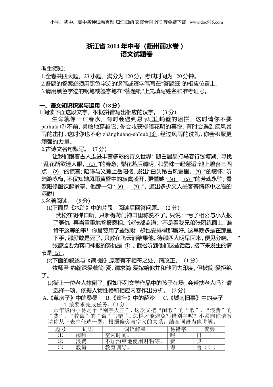 小学、初中、高中各种试卷真题知识归纳文案合同PPT等免费下载www.doc985.com浙江省2014年中考(衢州丽水卷)语文试题卷考生须知:1.全卷共四大题,23小题,满分为120分。考试时间为120分钟。2.“”各题的答案必须用黑色字迹的钢笔或签字笔写在答题纸的相应位置上。3.“”请用黑色字迹的钢笔或签字笔在答题纸上先填写姓名和准考证号。一、语文知识积累与运用(18分)1.阅读下面这段文字,根据拼音写出相应的汉字。(3分)生命就像一江春水,有时会遇到悬yá⑴峭壁的阻拦,这时请你不要páihuái⑵不前,勇敢地穿越它,你会收获柳暗花明的喜悦;有时会遇到疾风暴雨的击打,这时你也不必zhānɡhuánɡ-shīcuò⑶,经过风雨的洗礼,你会积聚更顽强的力量。2.古诗文名句默写。(7分)让我们跟着古人走进丰富多彩的诗文世界:随白居易打马春行钱塘湖,寻找“乱花渐欲迷人眼,⑴”“的春意;梨花落后清明,和晏殊一起邂逅池上碧苔三四点,⑵”“的惊喜;陪陈与义登上岳阳楼,发出白头吊古风霜里,⑶”的感怀;听“陆游咏梅,不仅知她风雨黄昏中的寂寞盛开,更懂她⑷,⑸”的芳魂永驻;看“欧阳修酣饮醉翁亭,他那一句⑹,⑺”,道出多少文人墨客寄情杯中之物的洒脱!3.名著阅读。(5分)⑴下面是《水浒》中的片段,阅读后回答问题。(2分)“武松在胡梯口听,只听得蒋门神口里称赞不了。只说:亏了相公与小人报”“了冤仇,再当重重地答报恩相。这张都监道:不是看我兄弟张团练面上,谁肯干这等的事!你虽费用了些钱财,却也安排得那厮好。这早晚多是在那里”下手,那厮敢是死了。只教在飞云浦结果他。待那四人明早回来,便见分晓。张都监要为蒋门神报的冤仇是①。武松听到他们这些话后,接下来发生的情节是②。⑵下面的叙述与《简·爱》原著有不相符之处,请改正。(1分)牧师圣·约翰深爱着简·爱,请求简·爱嫁给他并和他同去印度,但被简·爱拒绝了。⑶街上一位老人摔倒了,假如下列文学作品中的孩子在场,会帮扶老人吗?请选择一项,依据人物性格和相应内容作出分析。(2分)A.《草房子》中的桑桑B.《童年》中的萨沙C.《城南旧事》中的英子4.按要求完成任务。(3分)六年级的小易是个“别字大王”,这次又把“闲暇”的“暇”、“浪费”的“费”、“教诲”的“诲”写错了。怎样才能避免写错别字呢?小易向你请教请你从下表中任选一题,根据偏旁与字义的关系,结合词语为他讲解。题号词语词语解释易错字偏旁⑴闲暇空闲时间。暇日⑵浪费不加约束地使用财物等。费贝⑶教诲教育训导。诲言(讠)小学、初中、高中各种试卷真题知识归纳文案合同PPT等免费下载www.doc985.com二、现代文阅读(26分)(一)(14分)爬树的男孩尼古拉斯·保罗(英国)在夜深人静的时候,偷偷爬上那棵猴面包树,这是拉瓦一天中最期待的时光可惜,美好的时光总是短暂的。仅仅只是两三分钟,耳边便会响起一声熟悉的口哨声,有人来了,他必须以最快的速度回到营房。“”看到了什么?刚刚躺下,安德烈便拖着瘸腿凑过来问道。拉瓦不想回答,但安德烈就是那个吹口哨的人。两人约定,拉瓦每天爬上树冠看看周围,看看远方,下来之后再把看到的新鲜事儿告诉放风人,也就是安德烈。三年了,两人还算默契,在这座死寂的集中营,每天都有人因为严厉的禁锢而自杀,他们却因为那棵猴面包树而充满希望。“”我们就要自由了,等着吧!安德烈一双粗糙的手在拉瓦头上抚摸,要不是因为拉瓦是黑人,连安德烈自己都会觉得眼前熟睡的少年就是自己的儿子。当然,拉瓦是不会明白安德烈的心情的,更不会想到,安德烈是戴高乐将军钦点的间谍。他并不是困在集中营,而是肩负特别使命潜伏在这片草原深处进行侦探。那棵猴面包树就像一个梦想,它恰好坐落在集中营的中央。白天的时候,很多纳粹士兵坐在树底下休息,恨得拉瓦牙痒痒。只有到了晚上,他才觉得那棵树属于自己。可惜,连安德烈也没想到,梦想会突然破碎。那天晚上,他吹了好几次口哨,可拉瓦就是不肯下来,直到听到一阵急促的脚步声奔来,他知道,出事了。拉瓦毕竟是个孩子,熬不住接二连三的酷刑,便一股脑儿地全说了出来。但安德烈只是笑笑,即使两块火红的烙铁夹在他的双颊,也没...
