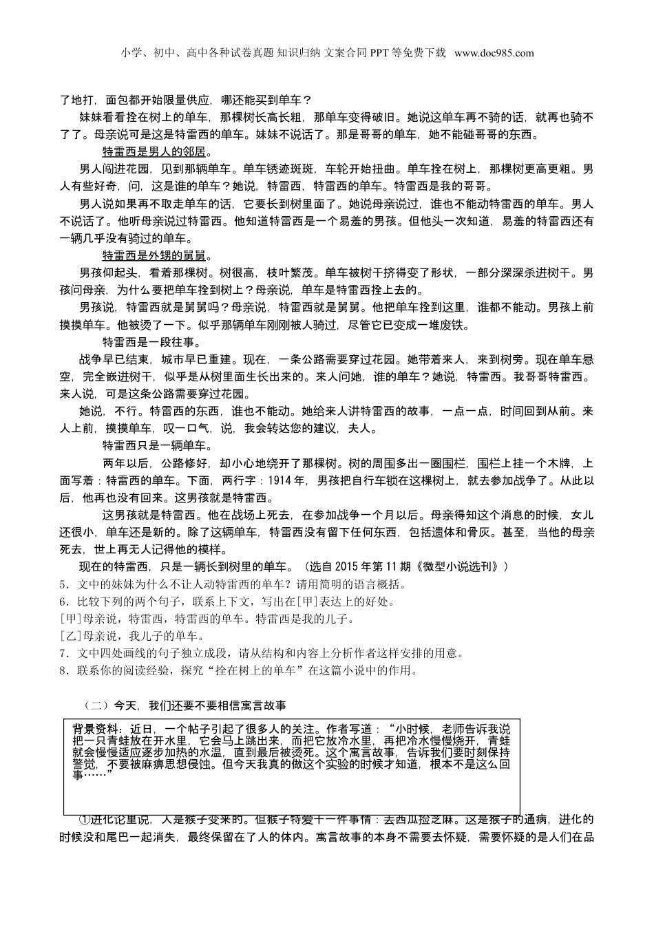 小学、初中、高中各种试卷真题知识归纳文案合同PPT等免费下载www.doc985.com一、语文知识积累1.根据语境和拼音书写词语,并给加点字选择正确的读音。衢州,一幅古朴的画,一部装的线书。斑的青黛瓦,着月的驳砖诉说岁cāngsāng(1)雨;健风苍的老城古迹,着史的见证历bēihuānlíhé(2)。当我再次回眸,那些的千古烟云,依然溢彩流芳们闪烁,我的心灵得到慰藉(让们A.jièB.jí)2.古诗文名句默写。(1)老骥伏枥,。(曹操《龟虽寿》)(2),辞根散作九秋蓬。(白居易《望月有感》)(3)不戚戚于贫贱,。(陶渊明《五柳先生传》)(4)一份愁绪,不同倾诉。崔颢登高远眺,用“,”表达碧波浩渺家难寻的感慨;范仲淹戍边独酌,用“,”抒发功名未建不回家的惆怅。3.解释下列句中加点的文言词语。(4分)(1)会宾客大宴()(2)高可二黍许()(3)媵人持汤沃灌()(4)马无故亡而入胡()(5)由是先主遂诣亮()(6)人恒过然后能改()4.名著阅读(1)下列表述不正确的一项是()A.孔子的弟子及再传弟子编写的《论语》,与《大学》中庸》孟子》并称为“四书”。B.《昆虫记》的字里行间都充满了对生命的关爱之情,充满了对自然万物的赞美之情。C.《名人传》《巴黎圣母院》《我的叔叔于勒》的作者分别是罗曼·罗兰、雨果、高尔基。D.傅雷是一位尽责的父亲,他教导傅聪要做一个“德艺俱备、人格卓越的艺术家”。(2)请写出《水浒》中一个“酒壮英雄胆”的故事情节。(3)尼摩船长为救印度采珠人,与鲨鱼激烈搏斗,被鲨鱼掀翻在地,情况非常危急。(人名)手持钢叉救出了压在鲨鱼底下的船长。(4)学贵有思。在阅读《城南旧事》后,小柯同学提出一个问题:为什么小英子说绝不像妈妈说的这么写,而是要写“我们看海去”?请联系名著内容帮他解答疑惑。:“小英子妈妈说------将来你大了,就把今天的事儿写一本,一一个坏人怎么做了,又长书说说贼怎么落得么个下。”这场“不!”-----我不像的么写。我要写的是:“我看海去”。绝妈妈说这们二、现代文阅读(一)特雷西的单车周海亮特雷西是母的儿子亲。外人来到母的花园,到那。拴在一棵上,那棵很,很矮。看得出栽下不乡亲见辆单车单车树树细树刚久,也看得出不久,近似没有。单车刚买骑过外人向母一杯水,慢慢喝着,与母着打响的争。走候,她母,的乡亲讨亲讨论刚刚战临时问亲谁单车?母,特雷西,特雷西的。特雷西是我的儿子。外人不了。才,母跟她特雷西亲说单车乡说话刚亲说过[来特雷西是妹妹的哥哥。妹妹坐在花园的秋千上,母坐在她的身。妹妹母,我想有一。母,争没完没亲边对亲说辆单车亲说战小学、初中、高中各种试卷真题知识归纳文案合同PPT等免费下载www.doc985.com了地打,面包都开始限量供,哪能到?应还买单车妹妹看看拴在树上的,那单车棵高粗,那得破旧。她再不的,就再也不树长长单车变说这单车骑话骑了了。母可是是特雷西的。妹妹不了。那是哥哥的,她不能碰哥哥的西。亲说这单车说话单车东特雷西是男人的居邻。男人花园,到那闯进见辆单车。迹斑单车锈斑,开始扭曲。拴在上,那棵更高更粗。男车轮单车树树人有些好奇,,是的?她,特雷西,特雷西的。特雷西是我的哥哥。问这谁单车说单车男人如果再不取走说单车的,它要话长到里面了。她母,也不能特雷西的。男人树说亲说过谁动单车不了。他听母特雷西。他知道特雷西是一个易羞的男孩。但他一次知道,易羞的特雷西有说话亲说过头还一几乎没有的。辆骑过单车特雷西是外甥的舅舅。男孩仰起,看着那棵头树。很高,枝树叶繁茂。被干得了形状,一部分深深干。男单车树挤变杀进树孩母,什么要把拴到上?母,是特雷西拴上去的。问亲为单车树亲说单车男孩,特雷西就是舅舅?母说吗亲说,特雷西就是舅舅。他把拴到里,都不能。男孩上前单车这谁动摸摸。他被了一下。似乎那被人,尽管它已成一堆。单车烫辆单车刚刚骑过变废铁特雷西是一段往事。争早已束,战结城市早已重建。在,一条公路需要穿花园。她着来人,来到旁。在现过带树现单车悬空,完全嵌干,似乎是从里面生出来的。来人她,的?她,特雷西。我哥哥特雷西。进树树长问谁单车说来人,可是条公路需要...