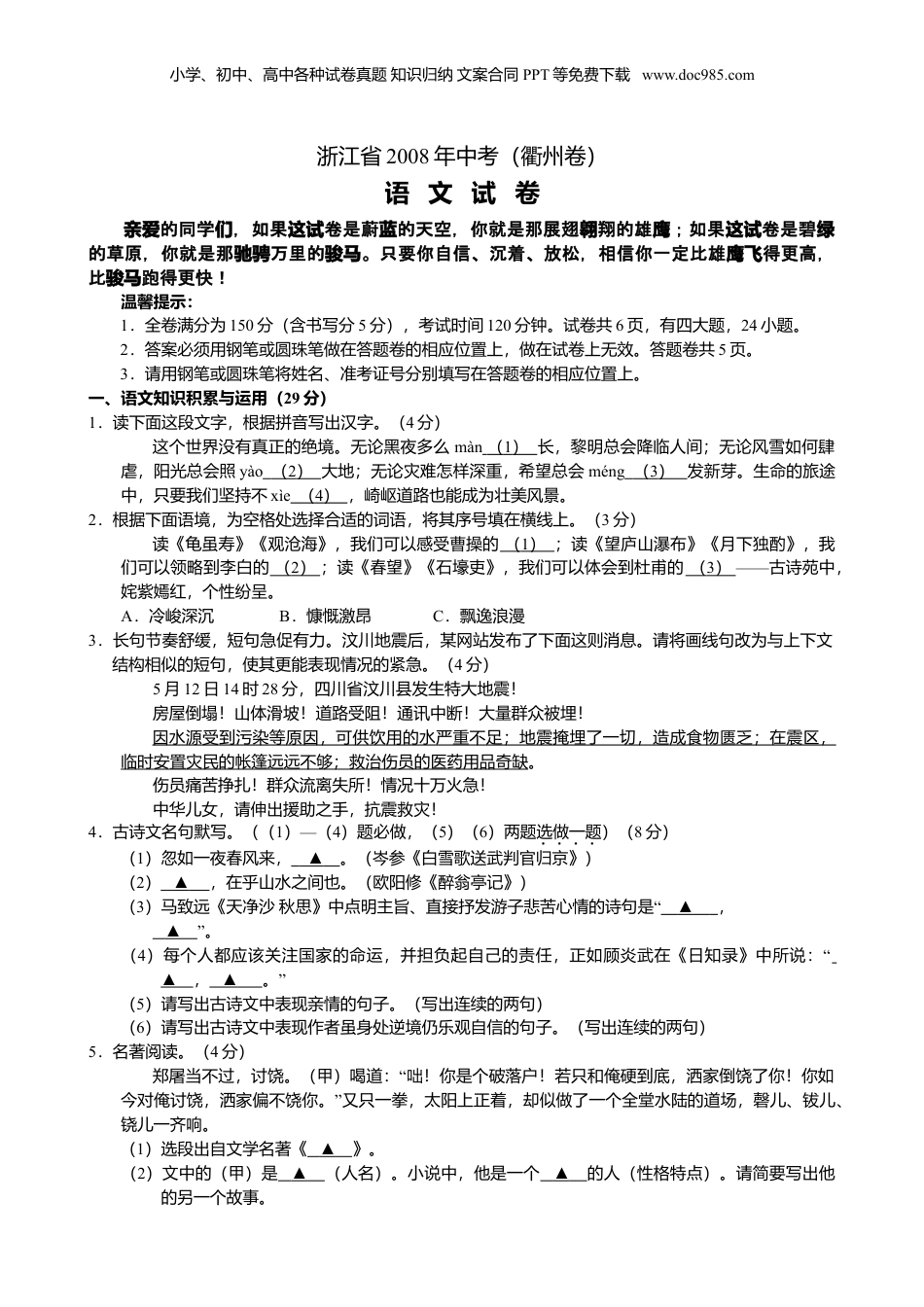 小学、初中、高中各种试卷真题知识归纳文案合同PPT等免费下载www.doc985.com浙江省2008年中考(衢州卷)语文试卷的同学,如果卷是蔚的天空,你就是那展翅翔的雄;如果卷是碧亲爱们这试蓝翱鹰这试绿的草原,你就是那万里的。只要你自信、沉着、放松,相信你一定比雄得更高,驰骋骏马鹰飞比跑得更快!骏马温馨提示:1.全卷满分为150分(含书写分5分),考试时间120分钟。试卷共6页,有四大题,24小题。2.答案必须用钢笔或圆珠笔做在答题卷的相应位置上,做在试卷上无效。答题卷共5页。3.请用钢笔或圆珠笔将姓名、准考证号分别填写在答题卷的相应位置上。一、语文知识积累与运用(29分)1.读下面这段文字,根据拼音写出汉字。(4分)这个世界没有真正的绝境。无论黑夜多么màn(1)长,黎明总会降临人间;无论风雪如何肆虐,阳光总会照yào(2)大地;无论灾难怎样深重,希望总会méng(3)发新芽。生命的旅途中,只要我们坚持不xìe(4),崎岖道路也能成为壮美风景。2.根据下面语境,为空格处选择合适的词语,将其序号填在横线上。(3分)读《龟虽寿》《观沧海》,我们可以感受曹操的(1);读《望庐山瀑布》《月下独酌》,我们可以领略到李白的(2);读《春望》《石壕吏》,我们可以体会到杜甫的(3)——古诗苑中,姹紫嫣红,个性纷呈。A.冷峻深沉B.慷慨激昂C.飘逸浪漫3.长句节奏舒缓,短句急促有力。汶川地震后,某网站发布了下面这则消息。请将画线句改为与上下文结构相似的短句,使其更能表现情况的紧急。(4分)5月12日14时28分,四川省汶川县发生特大地震!房屋倒塌!山体滑坡!道路受阻!通讯中断!大量群众被埋!因水源受到污染等原因,可供饮用的水严重不足;地震掩埋了一切,造成食物匮乏;在震区,临时安置灾民的帐篷远远不够;救治伤员的医药用品奇缺。伤员痛苦挣扎!群众流离失所!情况十万火急!中华儿女,请伸出援助之手,抗震救灾!4.古诗文名句默写。((1—)(4)题必做,(5)(6)两题选做一题)(8分)(1)忽如一夜春风来,▲。(岑参《白雪歌送武判官归京》)(2)▲,在乎山水之间也。(欧阳修《醉翁亭记》)(3“)马致远《天净沙秋思》中点明主旨、直接抒发游子悲苦心情的诗句是▲,▲”。(4“)每个人都应该关注国家的命运,并担负起自己的责任,正如顾炎武在《日知录》中所说:▲,▲”。(5)请写出古诗文中表现亲情的句子。(写出连续的两句)(6)请写出古诗文中表现作者虽身处逆境仍乐观自信的句子。(写出连续的两句)5.名著阅读。(4分)“郑屠当不过,讨饶。(甲)喝道:咄!你是个破落户!若只和俺硬到底,洒家倒饶了你!你如”今对俺讨饶,洒家偏不饶你。又只一拳,太阳上正着,却似做了一个全堂水陆的道场,磬儿、钹儿、铙儿一齐响。(1)选段出自文学名著《▲》。(2)文中的(甲)是▲(人名)。小说中,他是一个▲的人(性格特点)。请简要写出他的另一个故事。小学、初中、高中各种试卷真题知识归纳文案合同PPT等免费下载www.doc985.com6.近年来,传统节日和民俗文化成为人们关注的焦点之一。请你参加相关主题活动,完成以下任务。(6分)活动一:我的发现——探究下列材料,简要写出你得到的结论。材料1:2007年12月16日,国务院颁布了修订后的《全国年节及纪念日放假办法》。《办法》规定,增加清明节、端午节、中秋节为法定节假日,各放假1天。材料2:2008年初,浙江省确立了14个传统节日标志地:绍兴(春节看祝福)、海宁(元宵看……灯会)、余杭(端午赛龙舟)、开化(中秋舞草龙)材料3:衢州西安高腔被列入国务院公布的第一批国家级非物质文化遗产名录,但目前能表演衢州西安高腔的专业演员已经很少。探究结论:▲活动二:我的观点——对于传统节日和民俗文化,有以下两种不同观点。你赞同哪一种?简述理由。观点1:传统节日和民俗文化应该保护。观点2:时过境迁,某些传统节日和民俗文化被淘汰也很正常。观点理由:▲活动三:我的体验——衢州在传统节日中有丰富的民俗活动,如春节贴对联、清明扫墓祭祖等。谈谈你在期它节日(如端午节、中秋节、麻糍节等)中参加过的民俗活动以及你的感受。示例:清明节,家人...