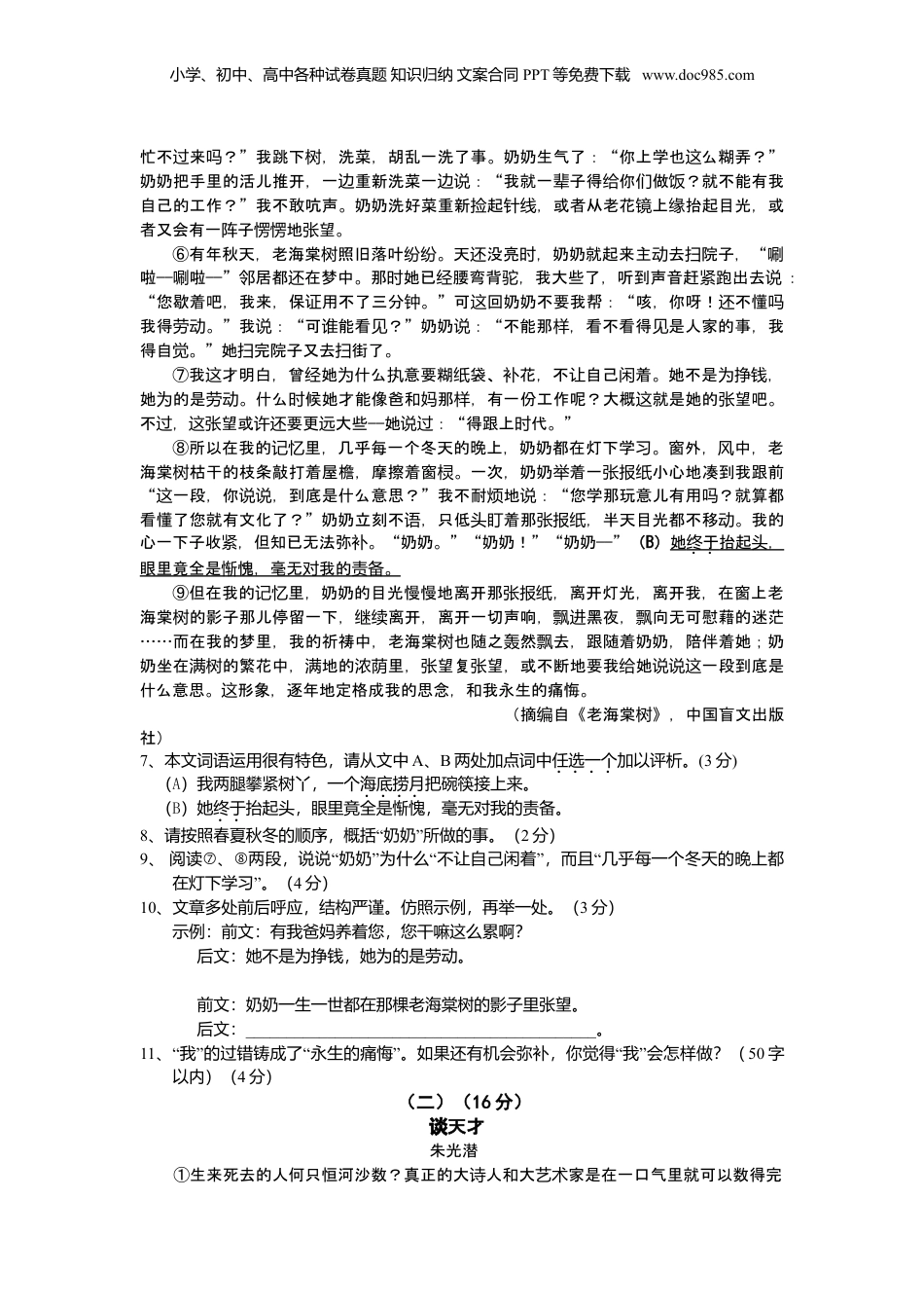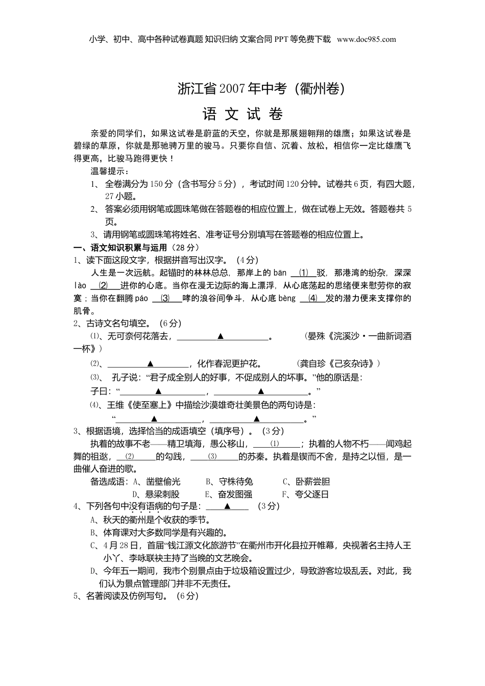 小学、初中、高中各种试卷真题知识归纳文案合同PPT等免费下载www.doc985.com浙江省2007年中考(衢州卷)语文试卷亲爱的同学们,如果这试卷是蔚蓝的天空,你就是那展翅翱翔的雄鹰;如果这试卷是碧绿的草原,你就是那驰骋万里的骏马。只要你自信、沉着、放松,相信你一定比雄鹰飞得更高,比骏马跑得更快!温馨提示:1、全卷满分为150分(含书写分5分),考试时间120分钟。试卷共6页,有四大题,27小题。2、答案必须用钢笔或圆珠笔做在答题卷的相应位置上,做在试卷上无效。答题卷共5页。3、请用钢笔或圆珠笔将姓名、准考证号分别填写在答题卷的相应位置上。一、语文知识积累与运用(28分)1、读下面这段文字,根据拼音写出汉字。(4分)人生是一次航。起的林林,那岸上的远锚时总总bān⑴,那港湾的,深深驳纷杂lào⑵你的心底。当你在漫无的海上漂浮,从心底起的思便来慰你的寂进边际荡绪劳寞;当你在翻腾páo⑶哮的浪谷争斗,从心底间bèng⑷的潜力便来支撑你的发肌骨。2、古诗文名句填空。(6分)⑴、无可奈何花落去,▲。(晏殊《浣溪沙·一曲新词酒一杯》)⑵、▲,化作春泥更护花。(龚自珍《己亥杂诗》)⑶、“”孔子说:君子成全别人的好事,不促成别人的坏事。他的原话是:“子曰:▲,▲”。⑷、王维《使至塞上》中描绘沙漠雄奇壮美景色的两句诗是:“▲,▲”。3、根据语境,选择恰当的成语填空(填序号)。(3分)——执着的故事不老精卫填海,愚公移山,⑴——;执着的人物不朽闻鸡起舞的祖逖,⑵的勾践,⑶的苏秦。执着是锲而不舍,是持之以恒,是一曲催人奋进的歌。备选成语:A、凿壁偷光B、守株待兔C、卧薪尝胆D、悬梁刺股E、奋发图强F、夸父逐日4、下列各句中没有语病的句子是:▲(3分)A、秋天的衢州是个收获的季节。B、体育课对大多数同学是有兴趣的。C、4月28“”日,首届钱江源文化旅游节在衢州市开化县拉开帷幕,央视著名主持人王小丫、李咏联袂主持了当晚的文艺晚会。D、今年五一期间,我市个别景点由于垃圾箱设置过少,导致游客垃圾乱丢。对此,我们认为景点管理部门并非不无责任。5、名著阅读及仿例写句。(6分)小学、初中、高中各种试卷真题知识归纳文案合同PPT等免费下载www.doc985.com⑴“”《红楼梦》中未见其人,先闻其声指的是(填人名):_________,此人最善于玩“”弄权术。诗句盛唐诗酒无双士,青莲文苑第一家赞颂的是(填人名):_________。(2分)⑵仿照下面两个例句,按要求再写一个。要求:①、是中外名著;②、写出书名、人名和有关情节;③、至少运用一个成语;④、句式与例句基本一致。(4分)例句1:《三国演义》中,求贤若渴的刘备,三顾茅庐,请得孔明辅佐,成就一番事业。例句2:《水浒传》中,嫉恶如仇的林冲,火并王伦,推举晁盖为梁山新头领,促进了梁山的发展。6、综合性学习。(6分)如今,越来越多的城里人利用双休日、假自涌入周村,住家屋,吃节庆长驾车边乡农家,田园光,品民俗文化,各地“家”旅游异常火爆。听一位朋友介,他农饭赏风农乐绍次五一假在“家”玩得很开心。我他都玩了些,他介了几:一是在干这长农乐问啥绍项树上“秋千”,二是在林子里用弓打,三是到小河里抓青蛙。有一些人在“家荡弹鸟还农”炫富,乱垃圾,博酗酒等。可,目前“家”旅游尚待引范。乐摆阔丢赌见农乐导规⑴、请你对不文明的游客说一句得体的话。(1分)⑵“”、为保护环境,增进城乡文明交流,请你为农家乐接待方设计一条宣传标语。(2分)⑶、请为你熟悉的村庄写一段推荐性的文字,以吸引游客前来度假。内容可以包括山水田园景色,或民风民俗,或饮食文化,或特色游玩安排等。(3分)二、现代文阅读(32分)请认真阅读下面两篇文章,完成7—16题。(一)16分)老海棠树史生铁①如果能有一空地,不窗前屋后,我想种两棵:一棵合,念母;一棵海块论树欢纪亲棠,念奶奶。纪②奶奶和一棵老海棠,在我的里不能分开,因树记忆为奶奶一生一世都在那棵老海棠的影子里望。树张③老海棠近房高的地方,有两条粗壮的枝丫,弯曲如一把躺椅。儿我常爬上去,树时一天天地在那儿玩。奶奶在下喊:“下来吧,你就么一天到晚待在上?”是的,我树这头在那儿看小人...