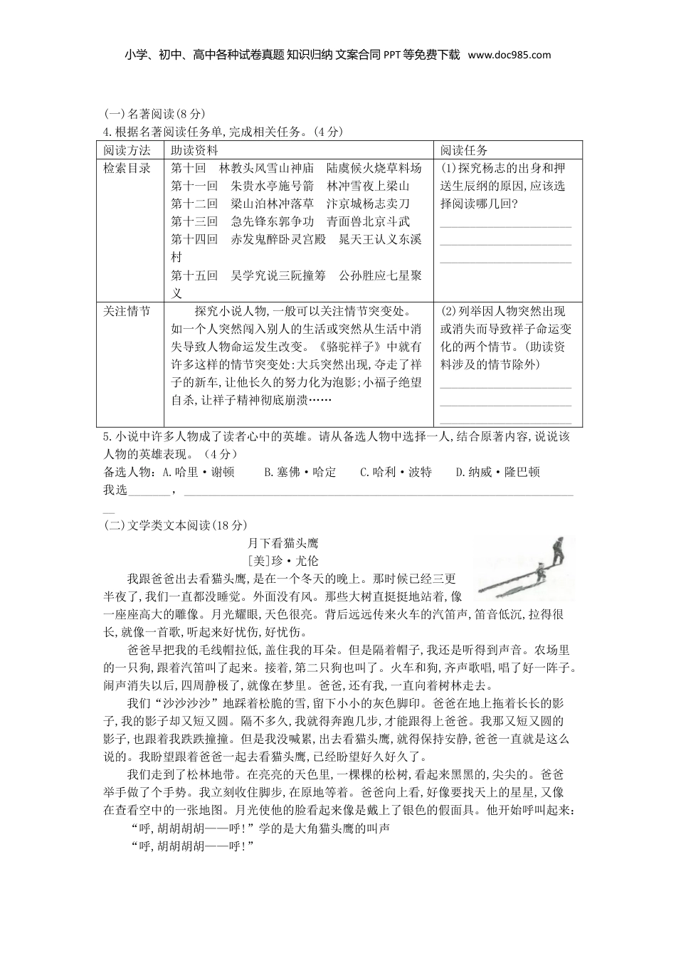 小学、初中、高中各种试卷真题知识归纳文案合同PPT等免费下载www.doc985.com2019浙江省宁波市中考语文真题及答案一、书写(5分)本题根据卷面书写情况评分。请你在答题时努力做到书写正确、工整二、积累(20分)班级开展以“梳理与探究”为主题的学习经验分享活动。请你参与,完成1—3题。1.结合语境辨音形。(4分)【任务一】为下面句中加点字选择正确读音。一个对读书着迷的孩子,一捧起书,心中便觉得有了着落,有了依靠。(1)着迷()(2)着落()A.zhāoB.zháoC.zheD.zhuó【任务二】找出右图中的错别字,并改正。(1)______改为______(2)______改为______2.专题整理填诗文。(10分)(1)古诗文中的声音丰富多彩。“晓雾将歇,①____________”赋予了山林无限生机,“万籁此都寂,②____________”营造了禅院清幽的氛围,陆游笔下“③____________,衣冠简朴古风存”描摹了热闹淳朴的乡俗,《醉翁亭记》中“觥筹交错,④____________,众宾欢也”再现了和乐融洽的场景。李益《夜上受降城闻笛》中的笛声寄托了将士的思乡之情:⑤____________,____________。苏轼《定风波》中的声音表现了诗人面对风雨从容豁达的生活态度:⑥____________,____________。(2)按要求选择诗句。(填序号)A.感时花溅泪,恨别鸟惊心。B.秋风萧瑟,洪波涌起。C.八百里分麾下炙,五十弦翻塞外声。D.安得广厦千万间,大庇天下寒士俱欢颜!E.怀旧空吟闻笛赋,到乡翻似烂柯人。F.枯藤老树昏鸦,小桥流水人家,古道西风瘦马。①作者相同的是()()②运用典故的是()()3.拓展关联知文化。(6分)根据同学们搜集的“以和为贵”的材料,完成相关任务。【任务一】解释下面三则材料中加点的字。A.是故谋闭而不兴,盗窃乱贼而不作,故外户而不闭。是谓大同。——《礼记·礼运》B.事父母者莫善于顺,宜兄弟者莫善于让。——徐祯稷《耻言》C.敬则小心翼翼,事无巨细,皆不敢忽。恕则凡事留余地以处人,功不独居,过不推诿。——曾国藩《与鲍春霆》(1)作:_______(2)善:_______(3)过:_______【任务二】下面是《以和为贵》演讲稿提纲,把【任务一】中的三则材料作为分论点的论据填在相应的横线上。(填序号)三、阅读(57分)招领启示今有员工检到皮夹一只,内有现金若干,请失主到门卫处认领。小学、初中、高中各种试卷真题知识归纳文案合同PPT等免费下载www.doc985.com(一)名著阅读(8分)4.根据名著阅读任务单,完成相关任务。(4分)阅读方法助读资料阅读任务检索目录第十回林教头风雪山神庙陆虞候火烧草料场第十一回朱贵水亭施号箭林冲雪夜上梁山第十二回梁山泊林冲落草汴京城杨志卖刀第十三回急先锋东郭争功青面兽北京斗武第十四回赤发鬼醉卧灵宫殿晁天王认义东溪村第十五回吴学究说三阮撞筹公孙胜应七星聚义(1)探究杨志的出身和押送生辰纲的原因,应该选择阅读哪几回?__________________________________________________________________关注情节探究小说人物,一般可以关注情节突变处。如一个人突然闯入别人的生活或突然从生活中消失导致人物命运发生改变。《骆驼祥子》中就有许多这样的情节突变处:大兵突然出现,夺走了祥子的新车,让他长久的努力化为泡影;小福子绝望自杀,让祥子精神彻底崩溃……(2)列举因人物突然出现或消失而导致祥子命运变化的两个情节。(助读资料涉及的情节除外)__________________________________________________________________5.小说中许多人物成了读者心中的英雄。请从备选人物中选择一人,结合原著内容,说说该人物的英雄表现。(4分)备选人物:A.哈里·谢顿B.塞佛·哈定C.哈利·波特D.纳威·隆巴顿我选_______,___________________________________________________________________(二)文学类文本阅读(18分)月下看猫头鹰[美]珍·尤伦我跟爸爸出去看猫头鹰,是在一个冬天的晚上。那时候已经三更半夜了,我们一直都没睡觉。外面没有风。那些大树直挺挺地站着,像一座座高大的雕像。月光耀眼,天色很亮。背后远远传来火车的汽笛声,笛音低沉,拉得很长,就像一首歌,听起来好忧伤,好忧伤。爸爸早把我的毛线帽拉低,盖住我的耳朵。但是隔着帽子,我还是听得到声音。农场里的一只狗,跟着汽笛叫了起来。接着,第二只狗也叫了。火车和狗,齐声歌唱,唱了...