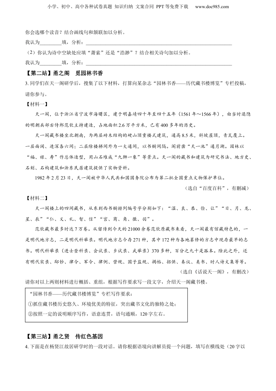 小学、初中、高中各种试卷真题知识归纳文案合同PPT等免费下载www.doc985.com机密★启用前宁波市2023年初中学业水平考试语文试题姓名____________准考证号____________考生须知:1.全卷分试题卷和答题卷。试题卷共8页,有五个语文学习活动,15个题目,满分为150分。考试时长为120分钟。2.答题必须使用黑色字迹钢笔或签字笔书写,答案必须按照题号顺序在答题卷各题目规定区域内作答,做在试题卷上或超出答题区域书写的答案无效。3.请将姓名、准考证号分别填写在试题卷和答题卷的规定位置上。温馨提示:全卷含书写分5分,请你在答题时努力做到书写规范、工整。一、学校开展“寻踪美丽宁波领略甬城文化”研学活动,请你参与。(26分)【第一站】甬之湖寻山水之诗1.下面是同学们研学时所说的诗句,请你补充完整。看到东钱湖,同学们不禁说出许多与水有关的诗句:“(1)______,风正一帆悬。”“山随平野尽,(2)_____。”“孤山寺北贾亭西,(3)_____。”……在欢声笑语中,同学们开启了研学之旅。2.下面是同学们在东钱湖研学时发现的古诗,请你赏析。初至茂屿①[明]沈九畴清溪窈窕觅仙踪,临水看云面面重。山过雨声侵薜荔②,风吹秋色满芙蓉。湖天____悬孤屿,海日东南引万峰。岂是桃源无路到,扁舟今日使人逢。【注释】①茂屿:茂屿山,据旧志记载,在东钱湖西南。②薜(bì)荔:一种常绿灌木。(1)《古汉语常用字字典》中,“重”有“chóng”和“zhòng”两种读音。本诗首联中加点的“重”字,小学、初中、高中各种试卷真题知识归纳文案合同PPT等免费下载www.doc985.com你会选哪个读音?结合画线句和颔联加以分析。我认为_________填,分析:____________________________________________________________(2)你认为诗中空缺处应填“萧索”还是“浩渺”?结合相关诗句加以分析。我认为_________填,分析:____________________________________________________________【第二站】甬之阁觅园林书香3.同学们在天一阁研学后,搜集了以下材料,打算向某杂志“园林书香——历代藏书楼博览”专栏投稿,请你参与。【材料一】天一阁,位于浙江省宁波市海曙区,建于明嘉靖四十年至四十五年(1561年~1566年),由当时退隐的明朝兵部右侍郎范钦主持建造,占地面积2.6万平方米,已有400多年的历史。天一阁藏书楼坐北朝南,为两层砖木结构的硬山顶重楼式建筑,通高8.5米,斜坡屋顶,青瓦覆上。一层面阔、进深各六间;二层除楼梯间外为一大通间,以书橱间隔。阁前凿“天一池”通月湖。园林以“福、禄、寿”作总体造型,用山石堆成“九狮一象”等景点。天一阁的藏书和建筑为研究书法、地方史、石刻、石构建筑和浙东民居建筑提供了实物资料。1982年2月23日,天一阁被中华人民共和国国务院公布为第二批全国重点文物保护单位。(选自“百度百科”,有删减)【材料二】天一阁楼上的四间藏书,从东到西书橱排列编号字分别如下:“温、良、恭、俭、让”“日、月、龙、星、辰”“仁、义、礼、智、信”“宫、商、角、徵、羽”。范钦藏书最多时达7万卷。从留传到今天的21000余卷范钦原藏书来看,天一阁最有馆藏特色的,一是明代地方志,二是明代科举录。明代地方志今存271种,其中172种为各地纂修的方志中现存最早的志书。明代科举录(进士登科录、会试录、乡试录、武举录)370多种,百分之九十是孤本。除此之外,还有明代实录、邸钞、律令、军令、律例、营规、国子监规、揭帖、招供、奏议、类书、时人诗文集等等。(选自《话说天一阁》,有删改)请你对以上两则材料进行概括、重组,根据写作要求写一段文字,介绍天一阁藏书楼。“园林书香——历代藏书楼博览”专栏写作要求:①抓住藏书楼历史悠久、环境优美的特征,突出藏书文化的独特之处;②按照一定的说明顺序写作,语意连贯,语句通顺,120字左右。【第三站】甬之贤传红色基因4.下面是在杨贤江故居研学时的一段对话。请你根据语境向讲解员提一个问题,填写在横线处(20字以小学、初中、高中各种试卷真题知识归纳文案合同PPT等免费下载www.doc985.com内)。同学:听我爷爷说,杨贤江先生是马克思主义教育理论家。是这样吗?讲解员:是的。他写...
