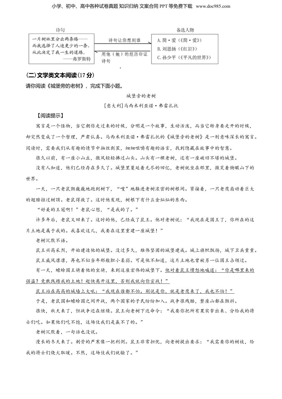 小学、初中、高中各种试卷真题知识归纳文案合同PPT等免费下载www.doc985.com宁波市2020年初中学业水平考试语文试题考生须知:1.全卷分试题卷和答题卷。试题卷共8页,有四个大题,20个小题。满分为150分,考试时间为120分钟。2.答题必须使用黑色字迹钢笔或签字笔书写,答案必须按照题号顺序在答题卷各题目规定区域内作答,做在试题卷上或超出答题区域书写的答案无效。3.请将姓名、准考证号分别填写在试题卷和答题卷的规定位置上。一、书写(5分)本题根据卷面书写情况评分。请你在答题时努力做到书写正确、工整。二、积累(19分)“”请你参与以节,中国人的诗意为主题的综合性学习活动,完成下面小题。四时有节1.阅读语段,完成任务。春,是绿水逶迤,是暖风拂面,是芳草长堤,是花香鸟语,是秀山丽水,让人陶醉而欣喜;秋,是秋风(1)xiāo瑟,是北雁南飞,是枫叶似火,是落叶金黄,是硕果累累,让人感伤而满足。可是,你是否想过,那盎然的春色是历经严寒洗礼后的英姿,那绚烂的秋景是接受酷暑róng(2)炼后的结晶……【任务一】根据拼音,写出相应的汉字。(1)_______(2)______“”“”【任务二】下面词语中加点的字和硕果累累的累字读音相同的一项是()A.累赘B.累积C.劳累天地有节2.古诗文名句填空。时空浩渺,亘古永恒。天地万物,往来不息。天地以日月星辰为笔,以山川河流为墨,时时给人类以启迪。“青林翠竹(1)____”“是她在说,有些特质,不能丢;(2)____”江春入旧年是她在说,时序更替,不可逆转;“莫言下岭便无难,(3)____”“是她在提醒,身处顺境,谨慎;(4)____”,柳暗花明又一村是她在指引,陷“入困境,不要放弃;(5)____,______”(龚自珍《己亥杂诗》)是她在说,贡献自己,不要保留;“(6)____,______”(周敦颐《爱莲说》)“是她在叮嘱,世间纷杂,坚守自我;(7)____,______”(刘桢《赠从弟》)是她在说,万物有节,时穷乃现。生命有节3.根据同学们积累的材料,完成相关任务。【任务一】根据所学,解释下面三则材料中加点的词。小学、初中、高中各种试卷真题知识归纳文案合同PPT等免费下载www.doc985.comA.苟利社稷,死生以之。(《左传·昭公四年》)B.三军可夺帅也,匹夫不可夺志也。(《论语·子罕》)C.吞舟之鱼,不游枝流;鸿鹄高飞,不集洿池。(《列子·杨朱》)(1)社稷:(2)夺:(3)集:【任务二】请你将【任务一】中的三则材料作为书签内容,填在相应词语下方的横线上。(填序号)三、阅读(60分)(一)名著阅读(10分)4.有同学发现:读《红星照耀中国》就像从平面镜中看客观世界,读《昆虫记》就像从显微镜中看微观世界,读《契诃夫短篇小说选》就像从哈哈镜中看变形的世界。请从《红星照耀中国》《昆虫记》中任选一部,结合内容,参考示例,说说该同学为什么会有这样的发现。【示例】读《契诃夫短篇小说选》就像从哈哈镜中看变形的世界,因为作者用夸张手法表现出一个畸形的“”社会。例如,作者在叙述警官奥楚蔑洛夫处理狗咬人事件时,不厌其烦地描写了他的变化,让读者看到了他扭曲的灵魂,看到了当时黑暗腐败的社会。5.根据下面的提示,从备选人物中任选一个,用他(她)的经历印证诗句。小学、初中、高中各种试卷真题知识归纳文案合同PPT等免费下载www.doc985.com(二)文学类文本阅读(17分)请你阅读《城堡旁的老树》,完成下面小题。城堡旁的老树[意大利]马西米利亚诺·弗雷扎托【阅读提示】寓言是一个怪物,当它朝你走过来的时候,分明是一个故事,生动活泼,而当它转身要走开的时候,却突然变成了一个哲理,严肃认真。马西米利亚诺·弗雷扎托的《城堡旁的老树》是一则意味深长的寓言。阅读时,需要我们从有趣的情节中抽丝剥茧,细细咀嚼有趣的语言,找到隐藏在故事中的智慧。很久以前,有一座小山丘,微风轻轻拂过山头。山头有一棵老树,还有一座破旧不堪的城堡。没有人知道,他们已经存在多久了。城堡里蔓延着无尽的回忆,老树就坐在那里,微笑着俯瞰山下的世界。一天,一只老鼠颤巍巍地跑到树下,“嗖”地躲进老树浓密的树根间。紧接着,一只老鹰扇动着巨大的翅膀掠过树顶。老鼠得救了。这时他发现,树根下有什么金灿灿的东西。“好美的王冠啊!”老鼠心想,“是...