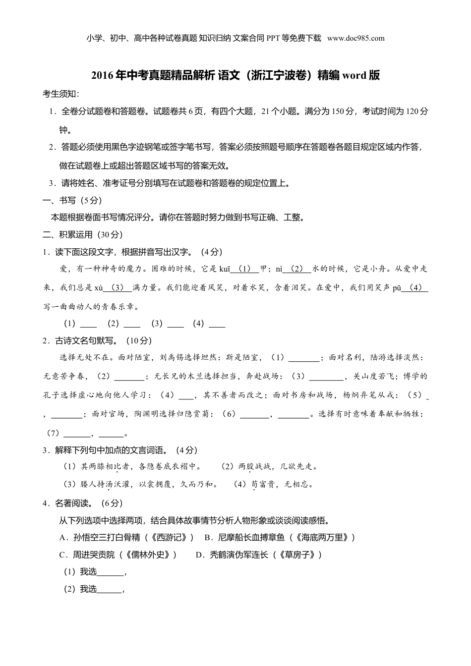 小学、初中、高中各种试卷真题知识归纳文案合同PPT等免费下载www.doc985.com2016年中考真题精品解析语文(浙江宁波卷)精编word版考生须知:1.全卷分试题卷和答题卷。试题卷共6页,有四个大题,21个小题。满分为150分,考试时间为120分钟。2.答题必须使用黑色字迹钢笔或签字笔书写,答案必须按照题号顺序在答题卷各题目规定区域内作答,做在试题卷上或超出答题区域书写的答案无效。3.请将姓名、准考证号分别填写在试题卷和答题卷的规定位置上。一、书写(5分)本题根据卷面书写情况评分。请你在答题时努力做到书写正确、工整。二、积累运用(30分)1.读下面这段文字,根据拼音写出汉字。(4分)爱,有一种神奇的魔力。困难的时候,它是kuī(1)甲;nì(2)水的时候,它是小舟。从爱中走来,我们总是xù(3)满力量。我们能迎着风笑,对着水笑,含着泪笑。在爱中,我们用笑声pǔ(4)写一曲曲动人的青春乐章。(1)(2)(3)(4)[来源:Z&xx&k.Com]2.古诗文名句默写。(10分)选择无处不在。面对陋室,刘禹锡选择坦然:斯是陋室,(1);面对名利,陆游选择淡然:无意苦争春,(2);无长兄的木兰选择担当,奔赴战场:(3),关山度若飞;博学的孔子选择虚心地向他人学习:(4),其不善者而改之;面对书房和战场,杨炯弃笔从戎:(5),;面对官场,陶渊明选择归隐赏菊:(6),。选择有时意味着奉献和牺牲:(7),。3.解释下列句中加点的文言词语。(4分)(1)其两膝相比者,各隐卷底衣褶中。(2)两股战战,几欲先走。(3)媵人持汤沃灌,以衾拥覆,久而乃和。(4)苟富贵,无相忘。[来源om]4.名著阅读。(6分)从下列选项中选择两项,结合具体故事情节分析人物形象或谈谈阅读感悟。A.孙悟空三打白骨精(《西游记》)B.尼摩船长血搏章鱼(《海底两万里》)C.周进哭贡院(《儒林外史》)D.秃鹤演伪军连长(《草房子》)(1)我选,(2)我选,小学、初中、高中各种试卷真题知识归纳文案合同PPT等免费下载www.doc985.com5.根据要求,完成任务。(6分)爸爸买了智能手机,他听说用WiFi上网会有风险。请你根据知识卡片提供的相关信息,告诉爸爸在公共场合使用WiFi的注意事项,以有效保护个人信息。要求表达合理、得体,字数在80字以内。三、阅读理解(55分)(一)满足的人的衬衫(18分)(意大利)卡尔维诺一个国王有一个独生子,国王爱他就像爱自己眼睛一样。可这个王子总是不快乐,整天整天地站在阳台上,看着远处。“你还缺什么吗?”国王问他,“你到底怎么了?”“我也说不清,爸爸,我自己也不清楚。”“你恋爱了?如果你想要哪个姑娘,告诉我,我会安排你们结婚的,不论是世界上最强大的国王的女儿,还是最穷困的农家女子,我都可以给你解决!”“不是,爸爸,我没爱上什么人。”国王想方设法为儿子开心解闷。戏剧、舞会、音乐、歌曲,但毫无效果,而且王子脸上的红润一天一天消退。国王只好发出命令,从世界各地来了许多最有学问的人:哲学家、博士、教授。他让大家见了王子,然后征求大家的意见。这些人退出去想了想后,又来见国王,说:“陛下,我们想过了,并研究了星相,必须这样做:找到一个感到满足的人,这个人对所有东西都感到满足,并且因为一切而感到满足,然后把他的衬衫跟你的儿子的交换一下就行了。”当天,国王就派出使者到世界各地寻找这个感到满足的人。一个神父被带了回来,国王问他:“你满足吗?”“很满足,陛下。”“那好。你愿意成为我的主教吗?”“噢,那可太好了,陛下!”“出去!快滚出去!我找的是一个满足于自身状况的幸福的人,而不是一个想要比现有状况更好的黑客在公共场合搭建一个无需密码登陆的WiFi网络,取一个与知名WiFi热点相近的网络名。等用户登录后,便可以监视、扫描和记录用户在网上的操作信息,甚至盗刷网银。如果手机WiFi开关处于打开状态,手机往往会自动搜索并连接到黑客搭建的WiFi网络;如果手机WiFi开关处于关闭状态,直接使用3G、4G数据流量,用户的信息就不易被黑客获取。小学、初中、高中各种试卷真题知识归纳文案合同PPT等免费下载www.doc985.com人。”国王又开始等待下一个满足的人。人们告诉他,...