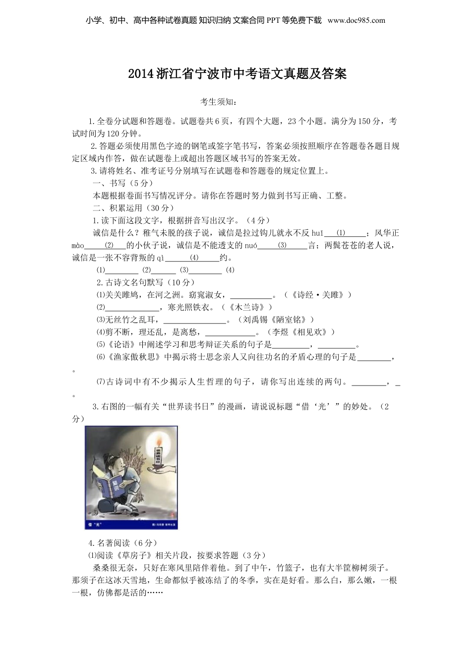 小学、初中、高中各种试卷真题知识归纳文案合同PPT等免费下载www.doc985.com2014浙江省宁波市中考语文真题及答案山东省平邑县兴蒙学考生须知:1.全卷分试题和答题卷。试题卷共6页,有四个大题,23个小题。满分为150分,考试时间为120分钟。2.答题必须使用黑色字迹的钢笔或签字笔书写,答案必须按照顺序在答题卷各题目规定区域内作答,做在试题卷上或超出答题区域书写的答案无效。3.请将姓名、准考证号分别填写在试题卷和答题卷的规定位置上。一、书写(5分)本题根据卷面书写情况评分。请你在答题时努力做到书写正确、工整。二、积累运用(30分)1.读下面这段文字,根据拼音写出汉字。(4分)诚信是什么?稚气未脱的孩子说,诚信是拉过钩儿就永不反huǐ⑴;风华正mào⑵的小伙子说,诚信是不能透支的nuó⑶言;两鬓苍苍的老人说,诚信是一张不容背叛的qì⑷约。⑴⑵⑶⑷2.古诗文名句默写(10分)⑴关关雎鸠,在河之洲。窈窕淑女,。(《诗经·关雎》)⑵,寒光照铁衣。(《木兰诗》)⑶无丝竹之乱耳,。(刘禹锡《陋室铭》)⑷剪不断,理还乱,是离愁,。(李煜《相见欢》)⑸《论语》中阐述学习和思考辩证关系的句子是,。⑹《渔家傲秋思》中揭示将士思念亲人又向往功名的矛盾心理的句子是,。⑺古诗词中有不少揭示人生哲理的句子,请你写出连续的两句。,。3.右图的一幅有关“世界读书日”的漫画,请说说标题“借‘光’”的妙处。(2分)4.名著阅读(6分)⑴阅读《草房子》相关片段,按要求答题(3分)桑桑很无奈,只好在寒风里陪伴着他。到了中午,竹篮子,也有大半筐柳树须子。那须子在这冰天雪地,生命都似乎被冻结了的冬季,实在是好看。那么白,那么嫩,一根一根,仿佛都是活的……山东省平邑县兴蒙学校初中部李传鹏输入小学、初中、高中各种试卷真题知识归纳文案合同PPT等免费下载www.doc985.com选文中的“他”是________(填人名),他和桑桑找到柳树须子的目的是__________.⑵下列名著内容表述有误的一项是()(3分)A.《名人传》中的贝多芬尽管耳聋,在生命的最后阶段还是写出了不朽的《欢乐颂》。B.《简·爱》中的主人公简·爱得知罗切斯特有一个疯妻子后离开了他。C.《水浒》中的宋江因怒杀阎婆惜被官府判了死罪,在弄场被梁山好汉搭救。D.《钢铁是怎样炼成的》中保乐在朱赫来的影响下,走上革命道路。5.综合性学习。(8分)为了感受汉字的魅力,学样举行“我爱汉字”活动,请您参加。活动一:[探源释义]汉字很有趣。老师提供了《辞海》中“集”字“佳”部的注释:“佳:短尾鸟”。请你解释《诗经》“黄鸟于飞,集于灌木“一句中“集”的意思”。___________________________________________________活动二:[妙联拾珠]对联很精妙。老师将宁波天一阁的一副对联“石潭白鱼______出没,草屋老树相因依”隐去一字,请你选择正确的一项,补全上联,使之表现出鱼儿无拘无束的情态。()A相B自C急D少活动三:[唇枪舌战]辩论很精彩。随着电子产品的普及,学生汉字书写能力正在退化,汉字正面临危机。请你就“电子产品是不是汉字危机的罪魁祸首”这一辩题,代表反方发表观点,并陈述理由。正方:我方的观点是电子产品是汉字危机的罪魁祸首,因为在没有键盘输入的时代,用笔写字可以强化人们的记忆,而如今键盘输入则让人们可以在多个候选的编码中选择所需的字,削弱了人们的书写能力,以致出现了“提笔忘字”现象。反方:___________________________________________________________三、阅读回答(55分)山东省平邑县兴蒙学校初中部李传鹏输入㈠生命的囚笼[美]米尔·哈斯恩我去佛罗里达旅行,姑姑阿加莎最近搬到米勒丽姆山的社区里,我决定去看望她。“我没有在表单上看到您的名字。”门卫对我说。我连忙回答:“噢,我没有告诉姑姑。我姑姑叫阿加莎。”门卫立刻在电脑上找到了姑姑的电话并开始打电话。在他拨打电话的时候,我注意到已经有好几辆汽车在后面等着。“电话正忙。”门卫回答我。他看了看越来越多的汽车,显得有些焦急了。他试着再次拨打可还是没有接通,而后面的汽车越来越多。最后,他问我可不可以等会再过来,我同意了。我把车开到了不远处,然后用手机拨打姑...